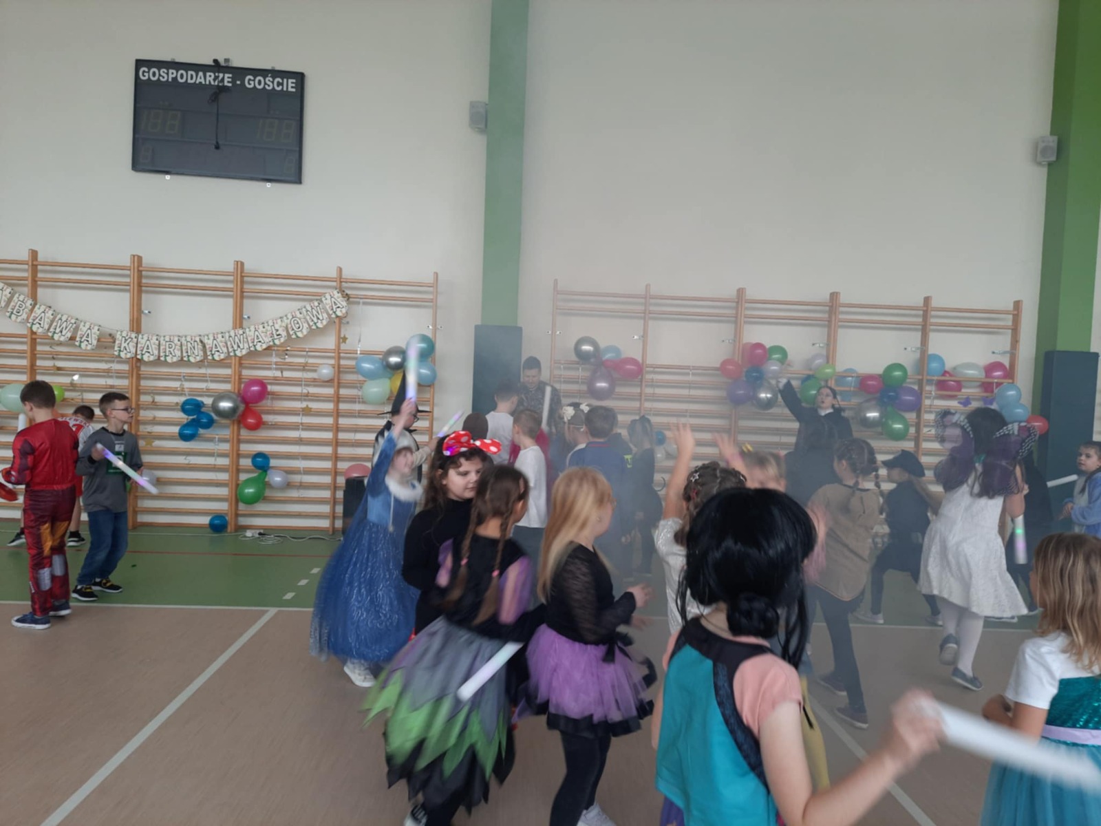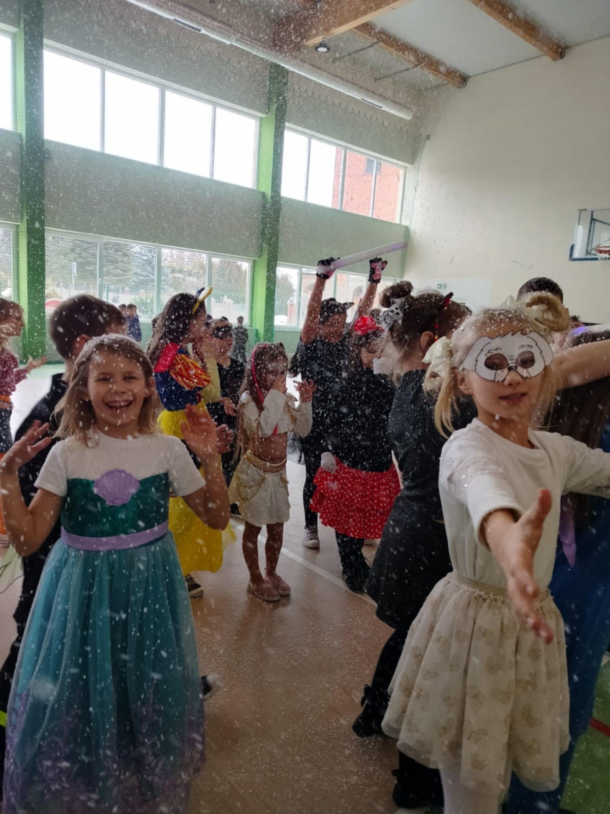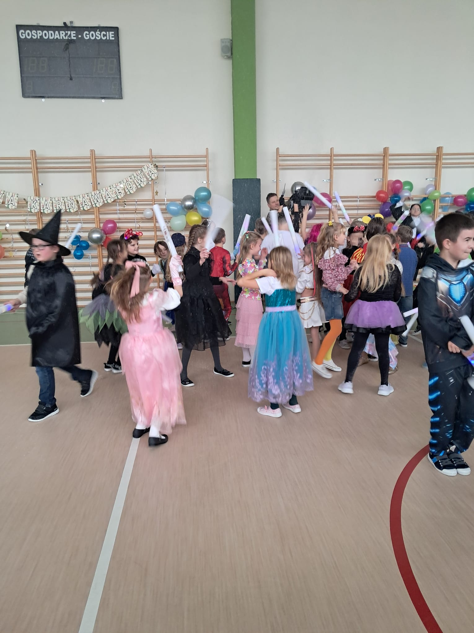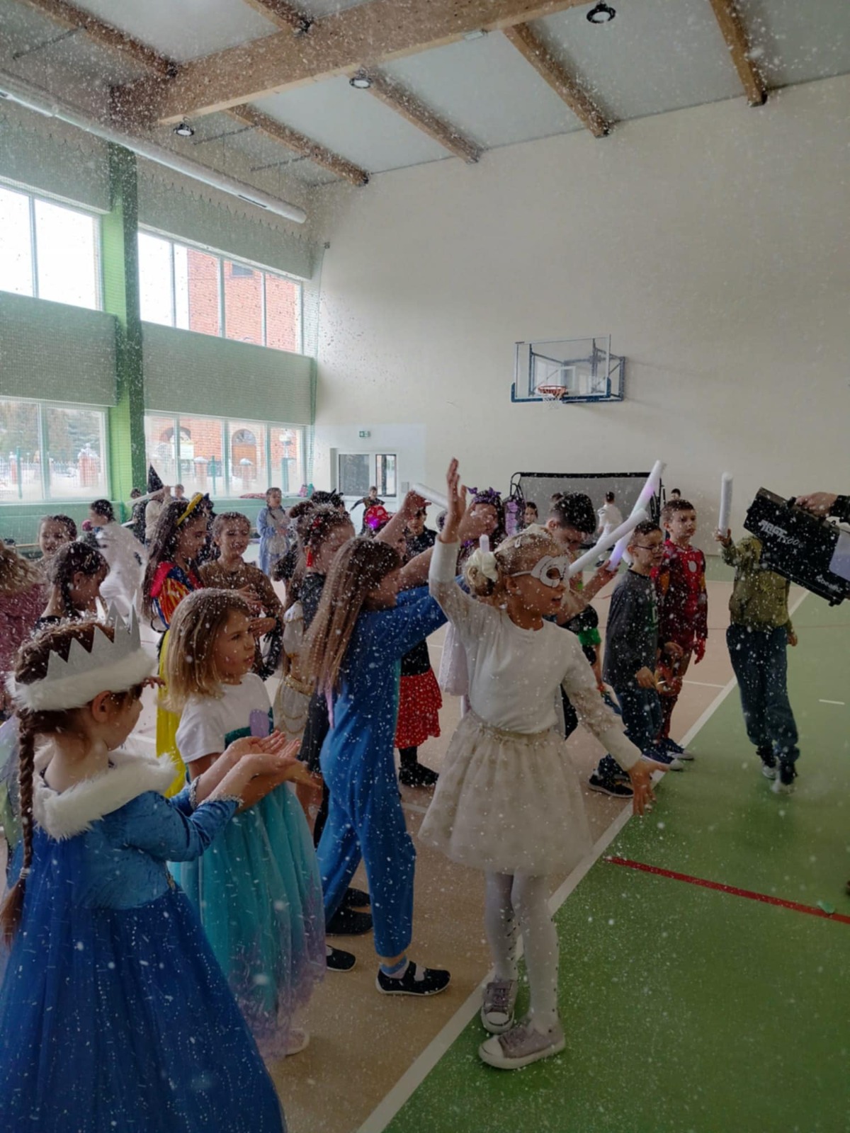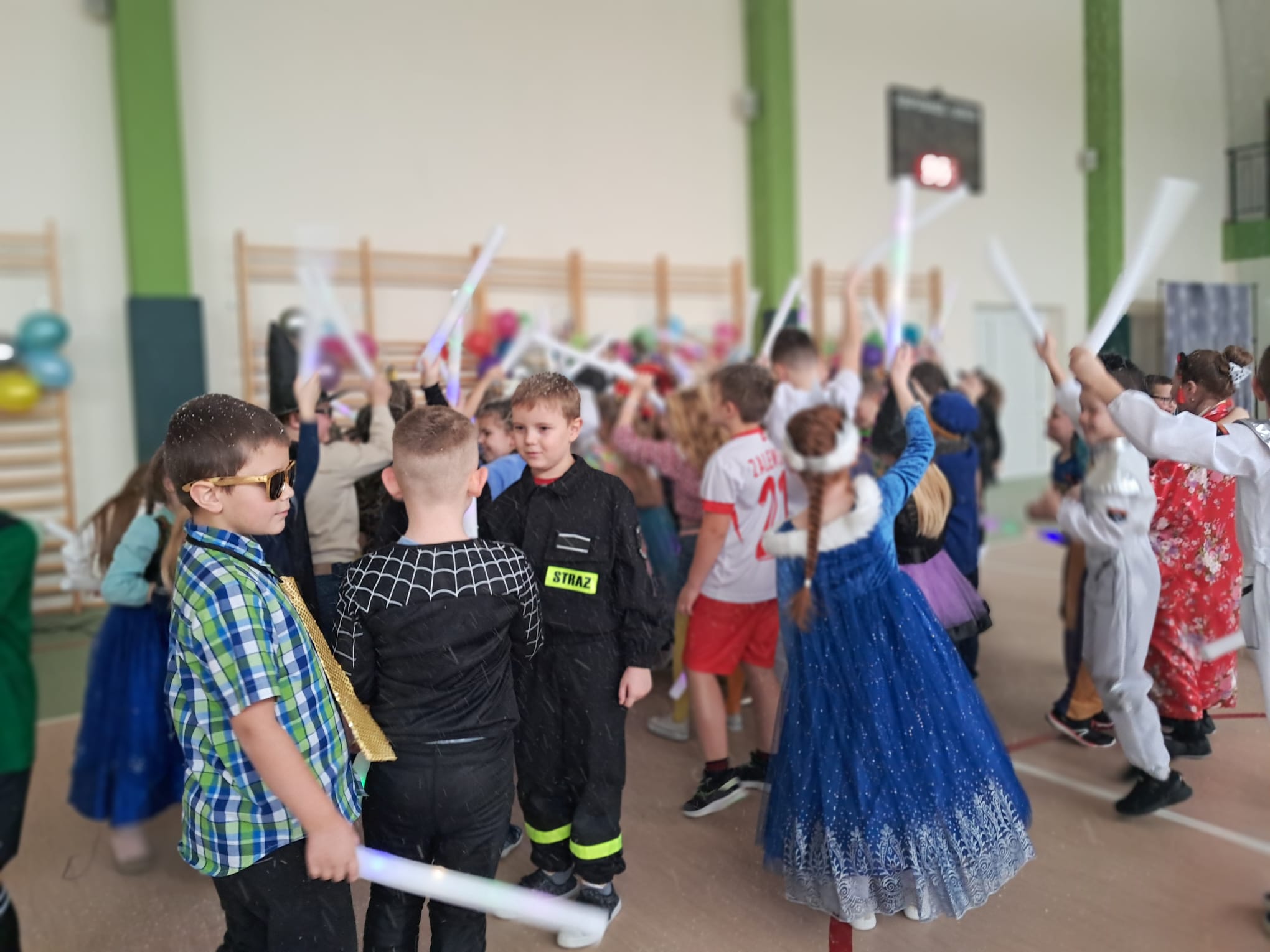 W tym roku nasz bal karnawałowy odbył się 22 stycznia i był prawdziwym świętem radości i muzyki! Dzieci z klas 1–3 wspaniale bawiły się przy wesołych rytmach, tańcząc w znanych zabawach, takich jak „Kaczuszki”, „Krasnoludki” czy „Krecik”. Parkiet rozświetlały migoczące świetlne pałki, a w powietrzu unosił się lekki śnieg i tajemniczy dym – jak w prawdziwej bajce Po szalonych tańcach czekał na nich pyszny poczęstunek. Na koniec odbyła się kolorowa sesja zdjęciowa, dzięki której każdy mógł zachować te wyjątkowe chwile w pięknych kadrach. Bal był pełen śmiechu, radości i dziecięcej energii. To był dzień, który uczniowie klas 1–3 będą wspominać z wielkim uśmiechem na twarzy!