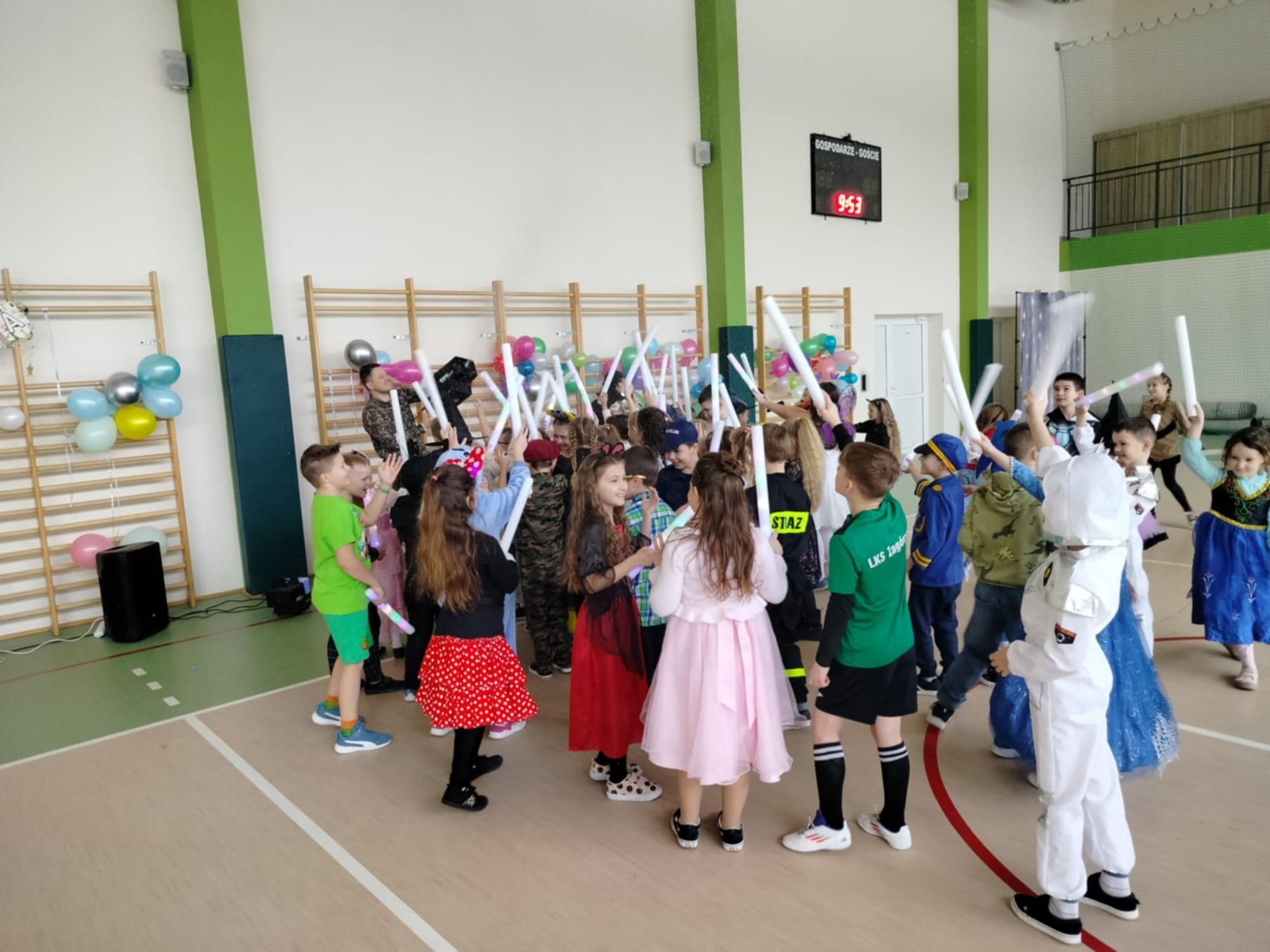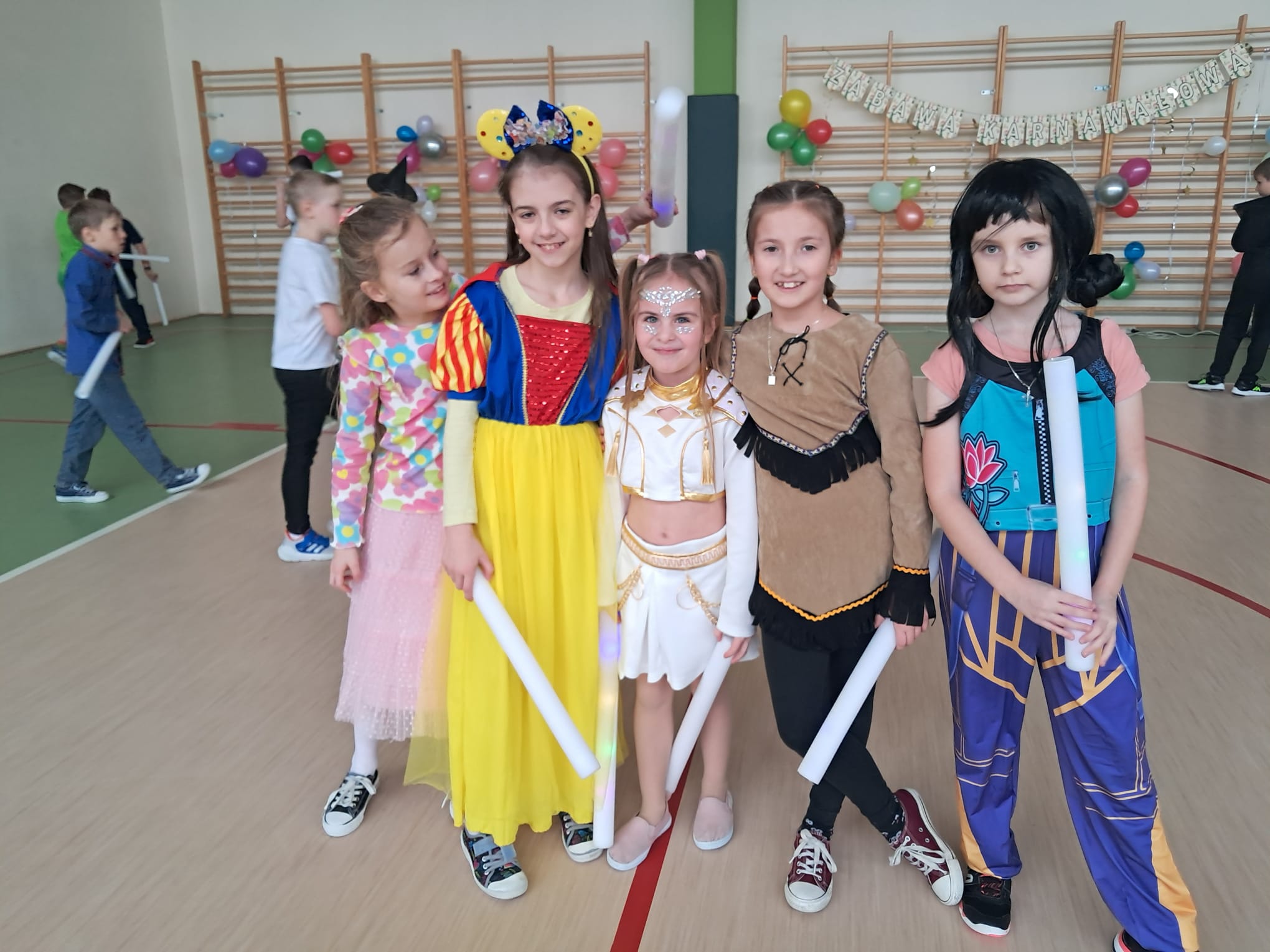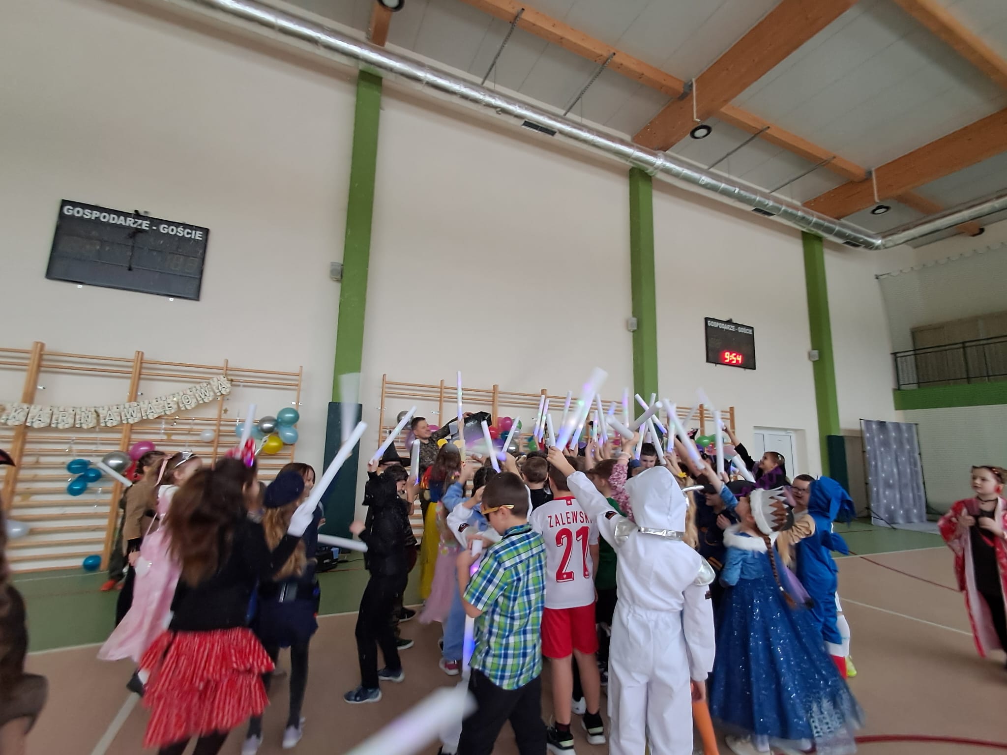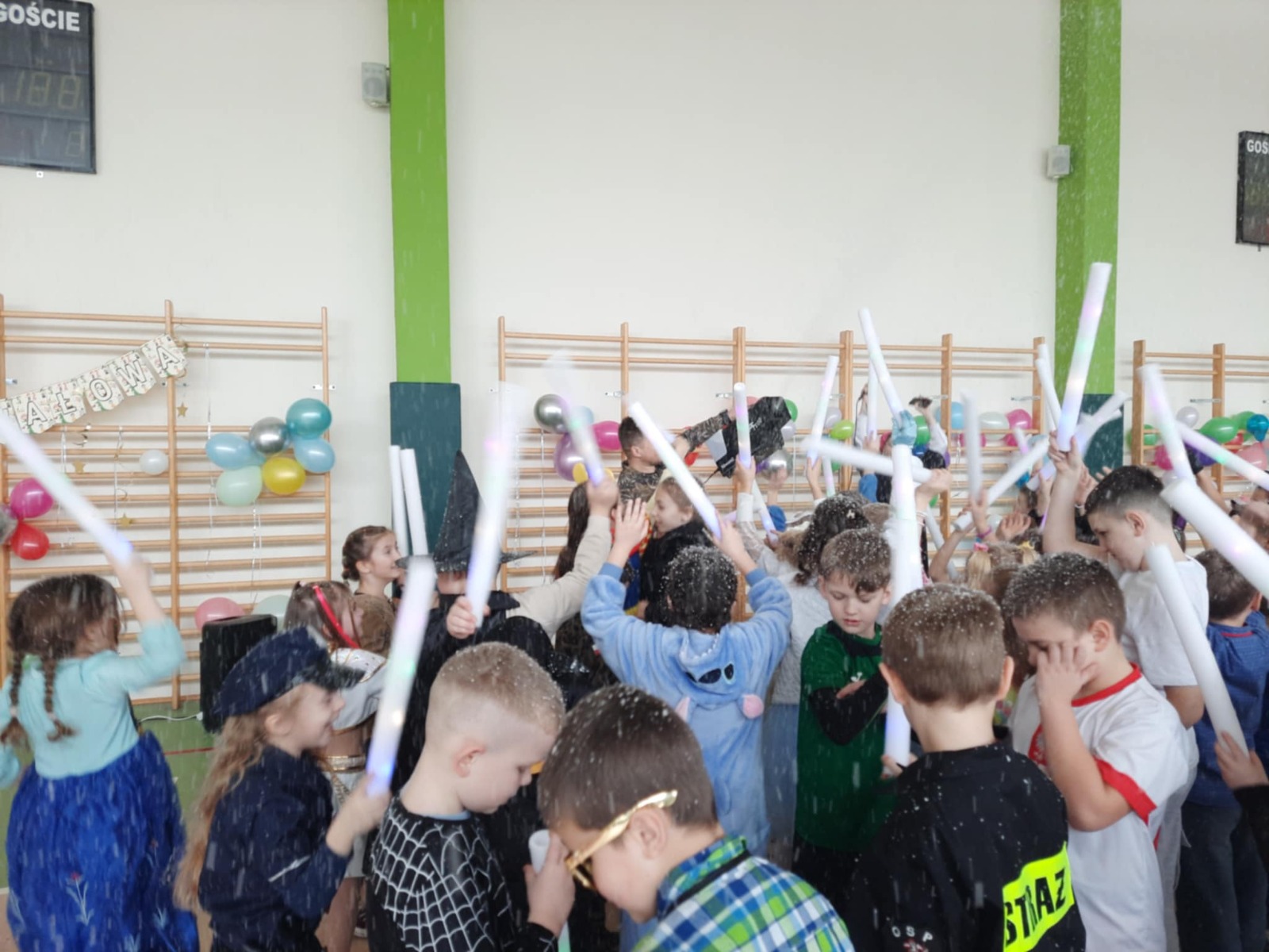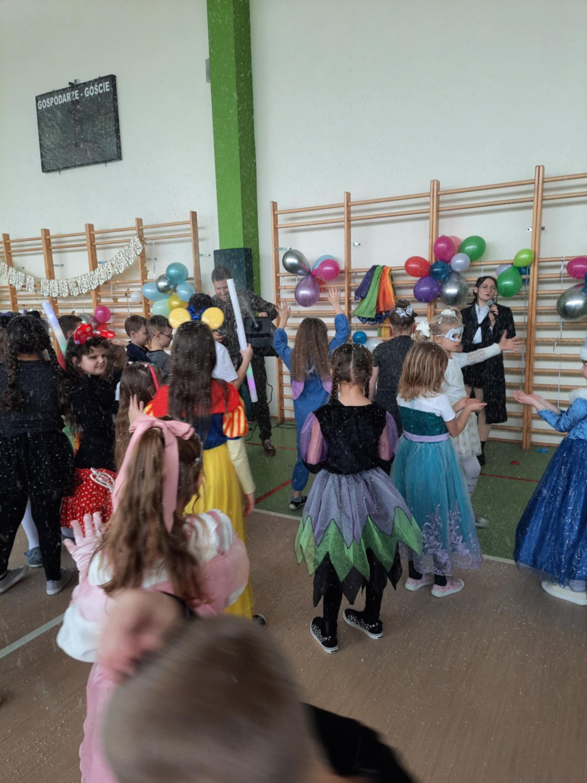 W tym roku nasz bal karnawałowy odbył się 22 stycznia i był prawdziwym świętem radości i muzyki! Dzieci z klas 1–3 wspaniale bawiły się przy wesołych rytmach, tańcząc w znanych zabawach, takich jak „Kaczuszki”, „Krasnoludki” czy „Krecik”. Parkiet rozświetlały migoczące świetlne pałki, a w powietrzu unosił się lekki śnieg i tajemniczy dym – jak w prawdziwej bajce Po szalonych tańcach czekał na nich pyszny poczęstunek. Na koniec odbyła się kolorowa sesja zdjęciowa, dzięki której każdy mógł zachować te wyjątkowe chwile w pięknych kadrach. Bal był pełen śmiechu, radości i dziecięcej energii. To był dzień, który uczniowie klas 1–3 będą wspominać z wielkim uśmiechem na twarzy!