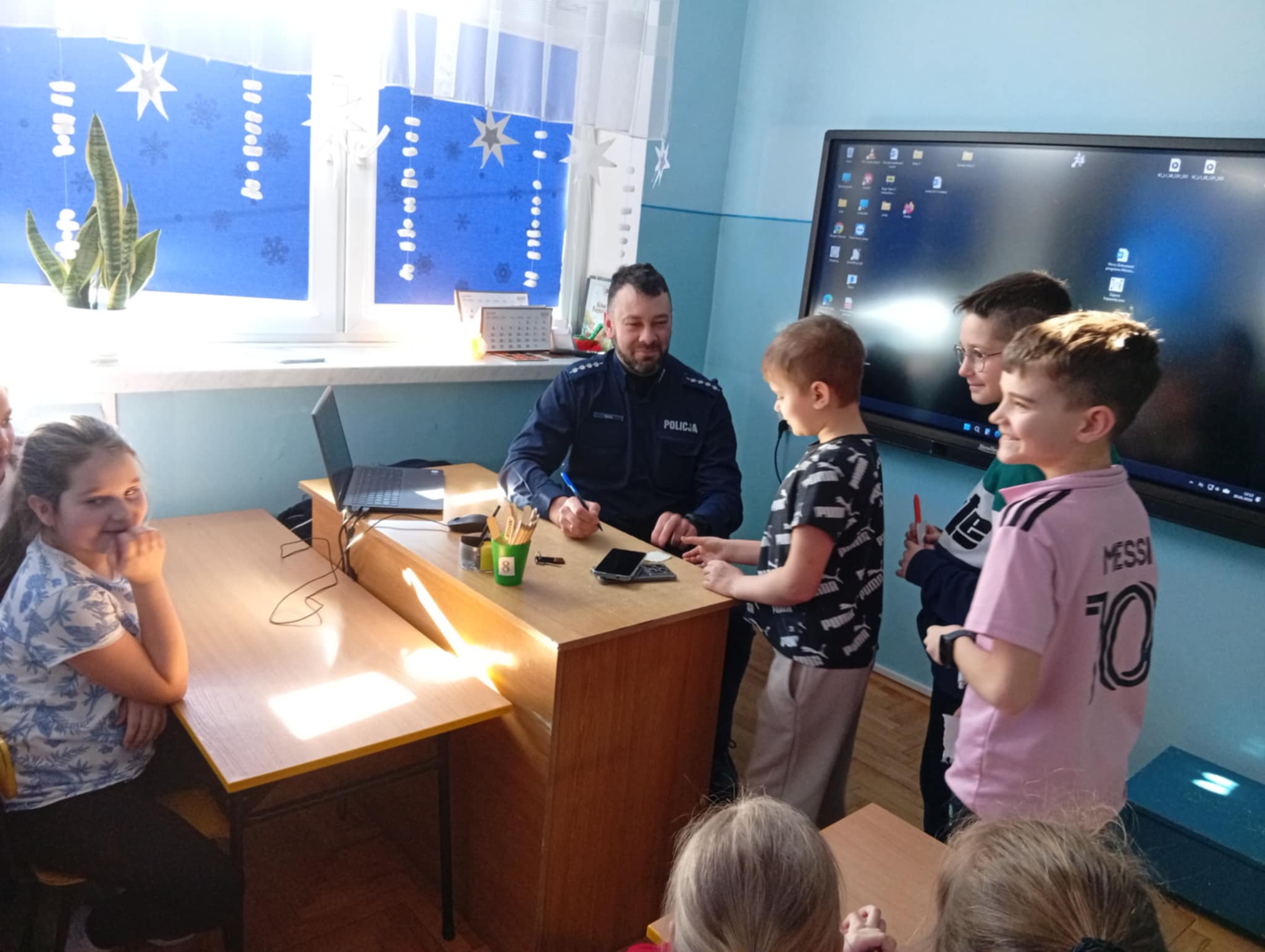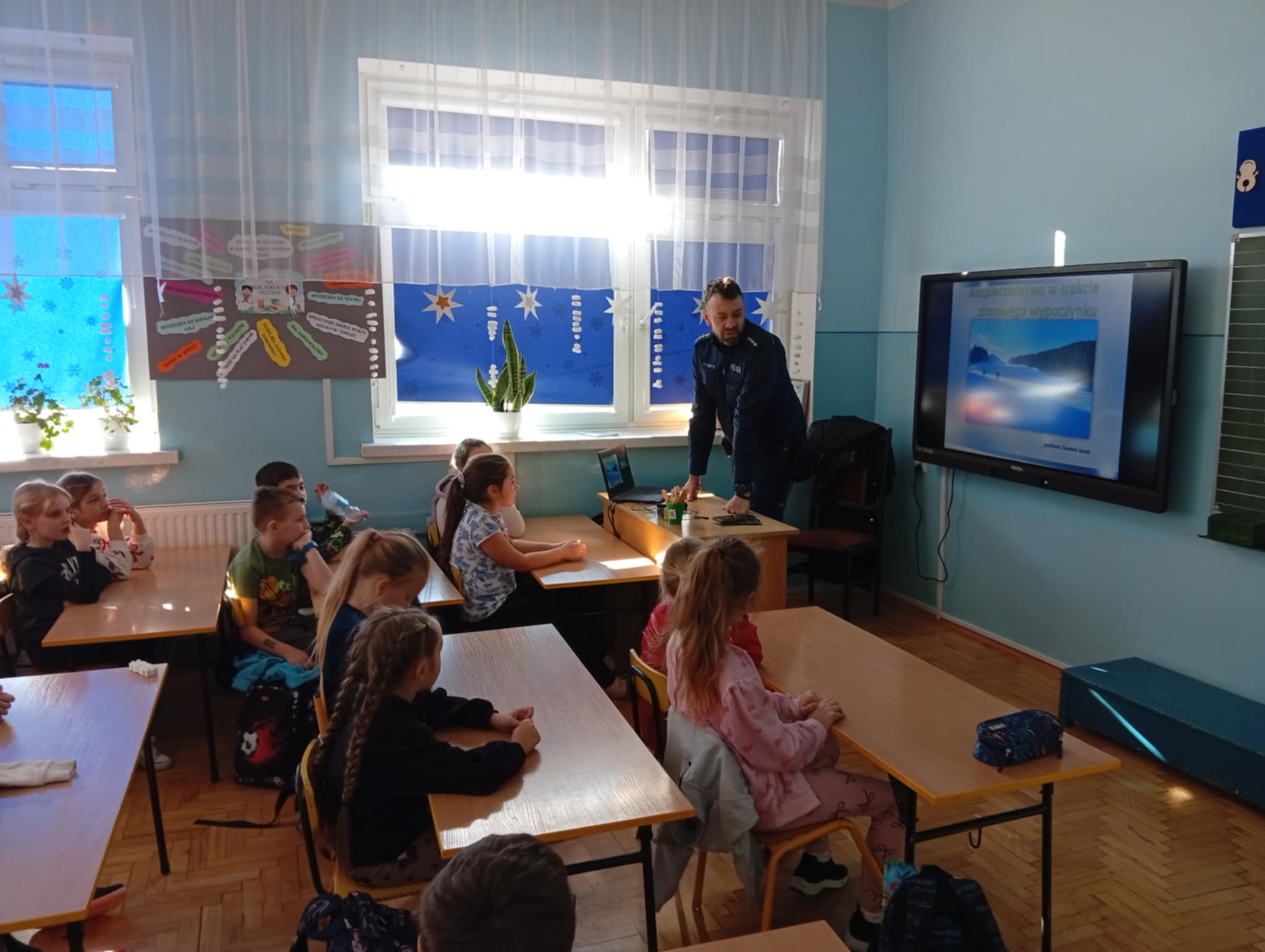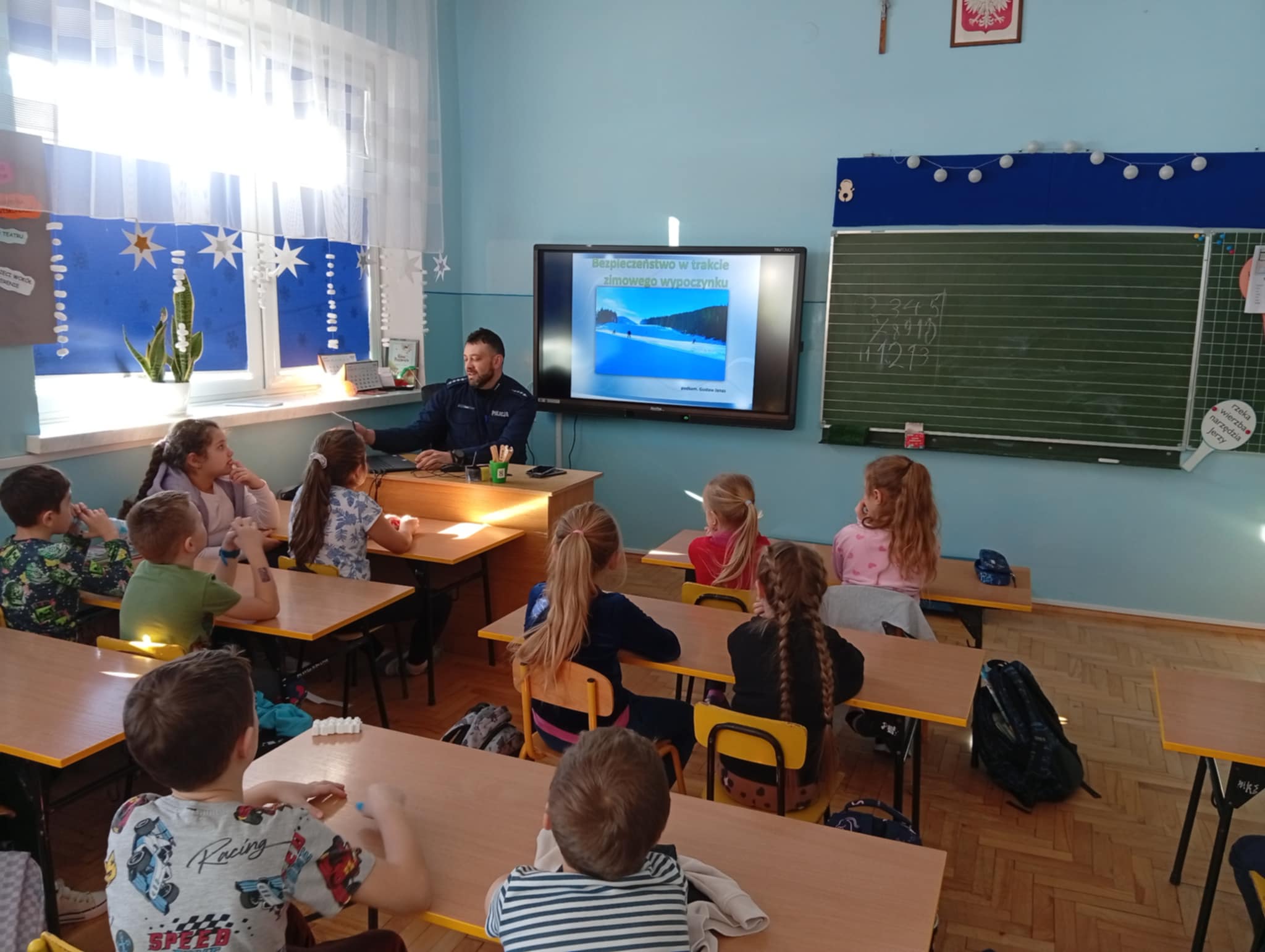 W trosce o bezpieczeństwo naszych uczniów w okresie ferii zimowych w naszej szkole odbyło się spotkanie z dzielnicowym. Policjant spotkał się z uczniami, podczas którego przypomniał i omówił najważniejsze zasady bezpiecznego spędzania ferii zimowych. Uczniowie dowiedzieli się, jak bezpiecznie zachowywać się podczas zabaw na śniegu i lodzie, w domu oraz w przestrzeni publicznej, a także jak reagować w sytuacjach zagrożenia. Spotkanie miało charakter profilaktyczny i edukacyjny.