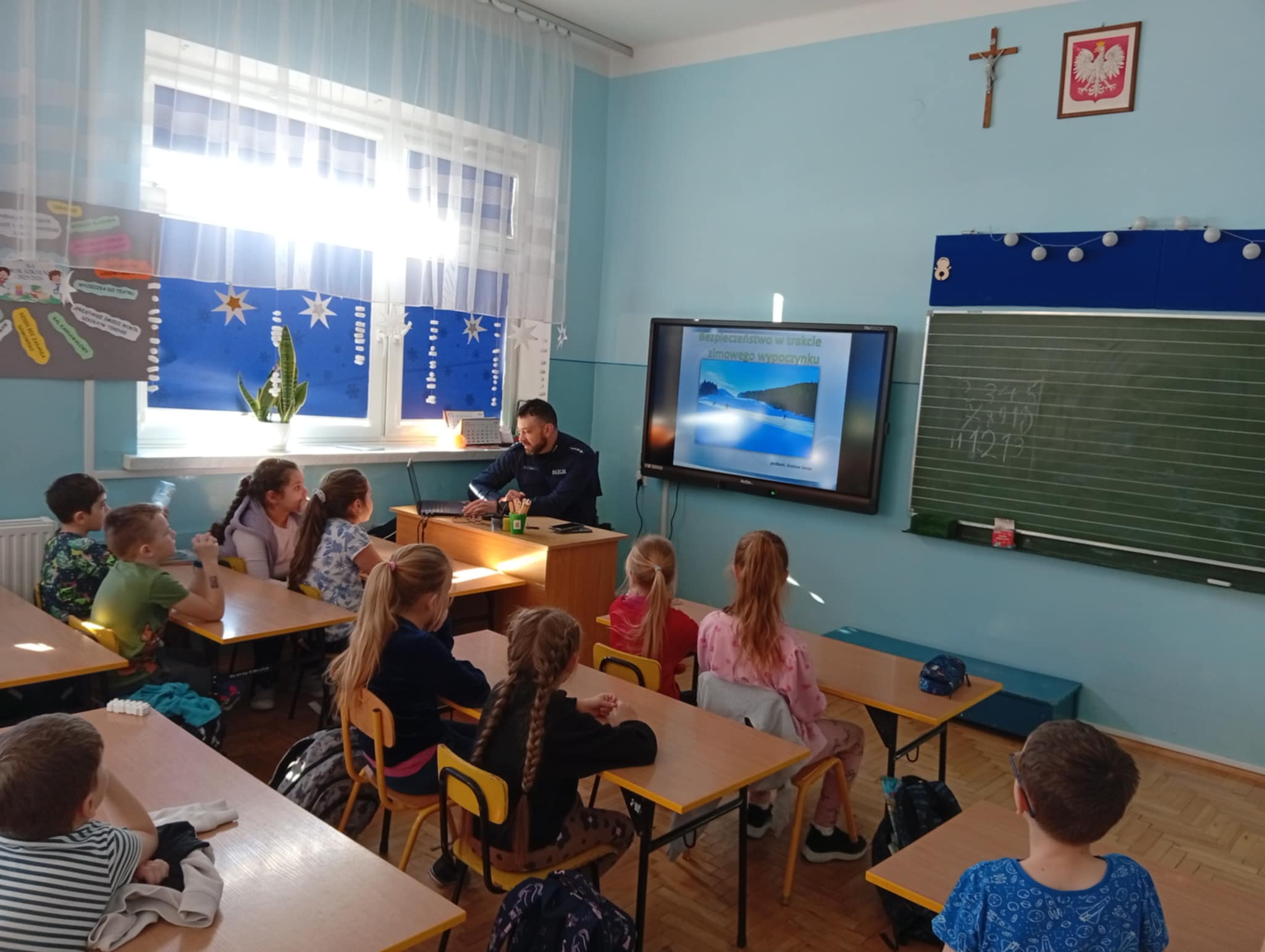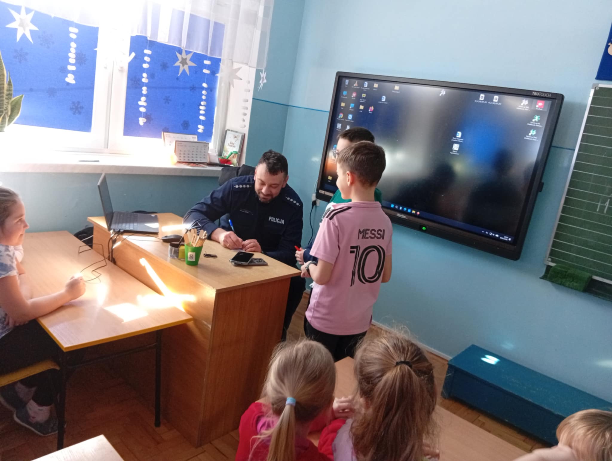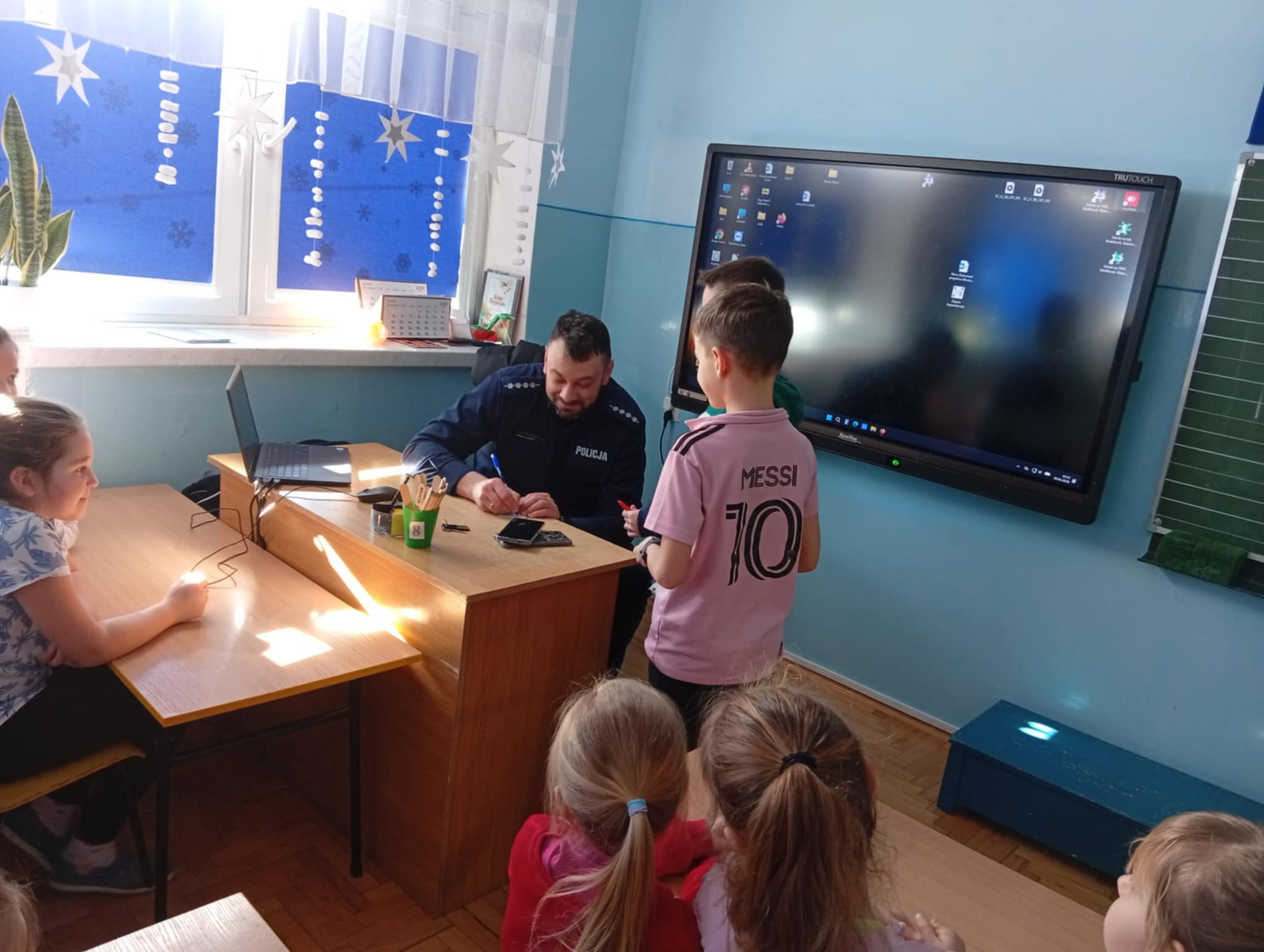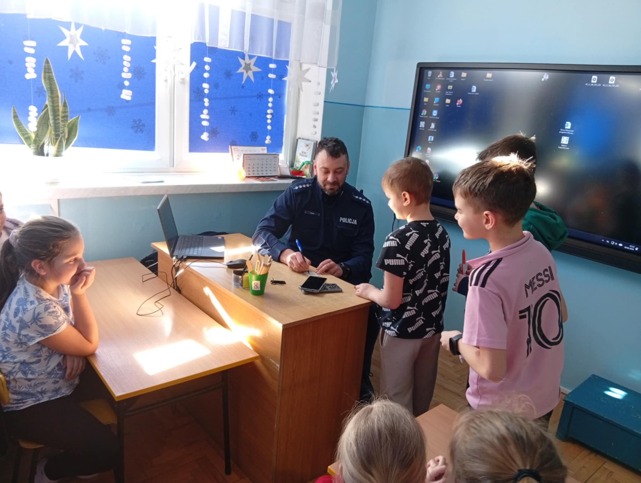 W trosce o bezpieczeństwo naszych uczniów w okresie ferii zimowych w naszej szkole odbyło się spotkanie z dzielnicowym. Policjant spotkał się z uczniami, podczas którego przypomniał i omówił najważniejsze zasady bezpiecznego spędzania ferii zimowych. Uczniowie dowiedzieli się, jak bezpiecznie zachowywać się podczas zabaw na śniegu i lodzie, w domu oraz w przestrzeni publicznej, a także jak reagować w sytuacjach zagrożenia. Spotkanie miało charakter profilaktyczny i edukacyjny.