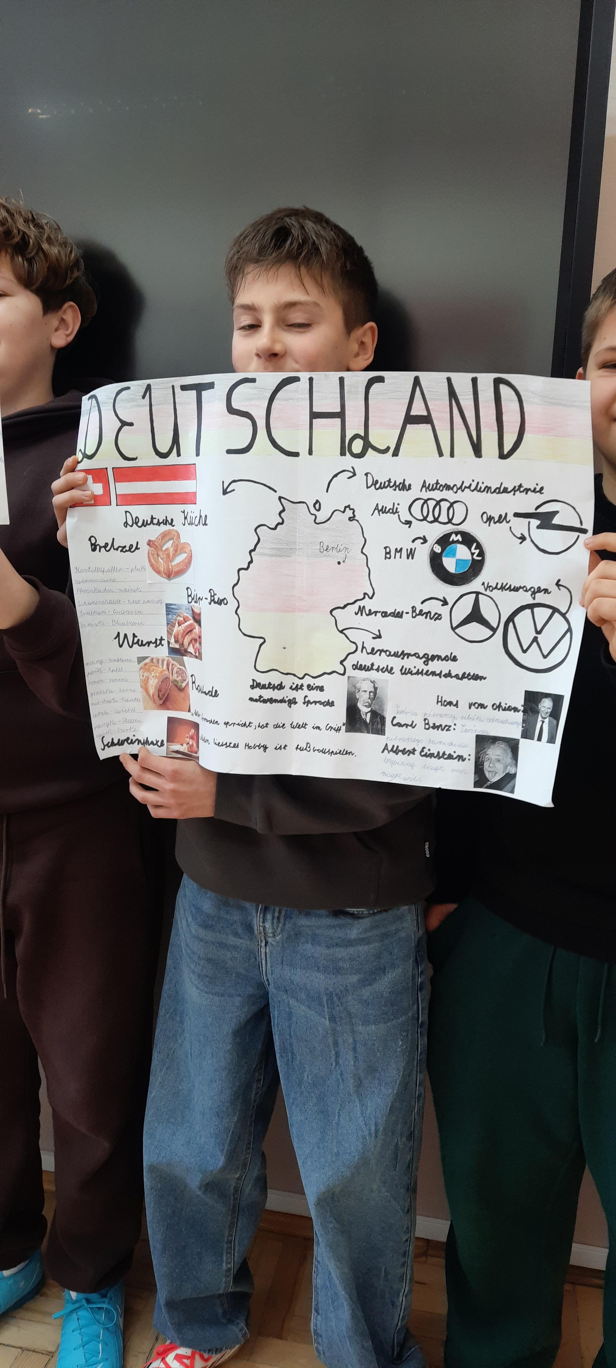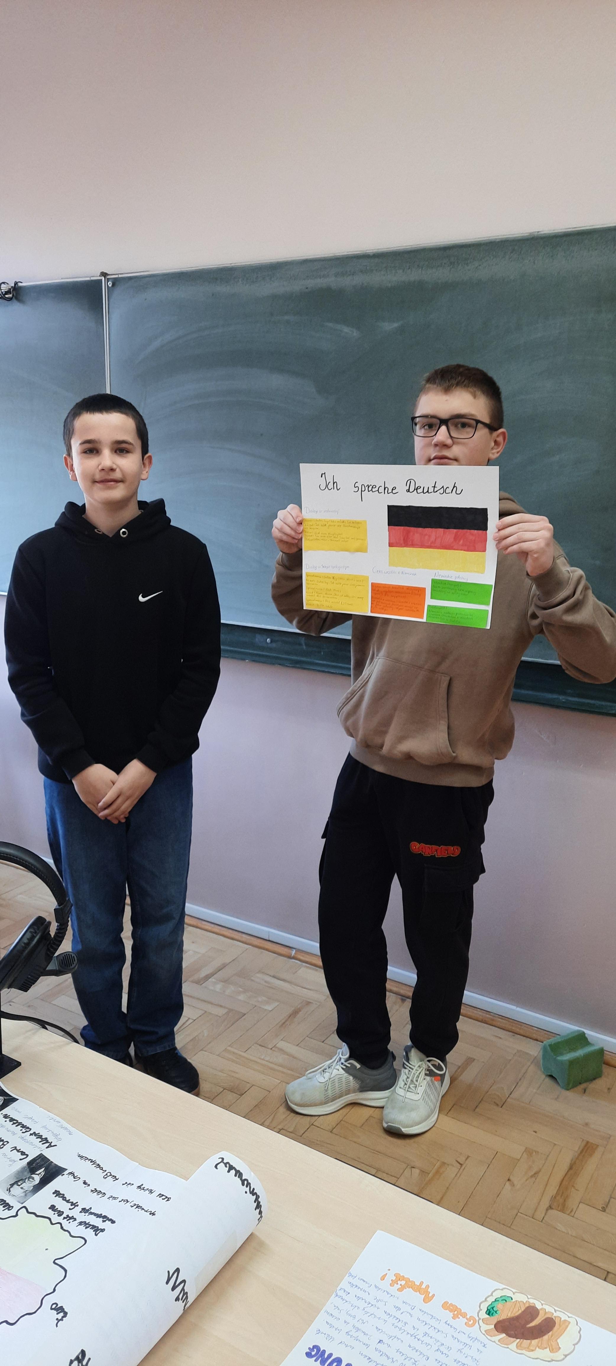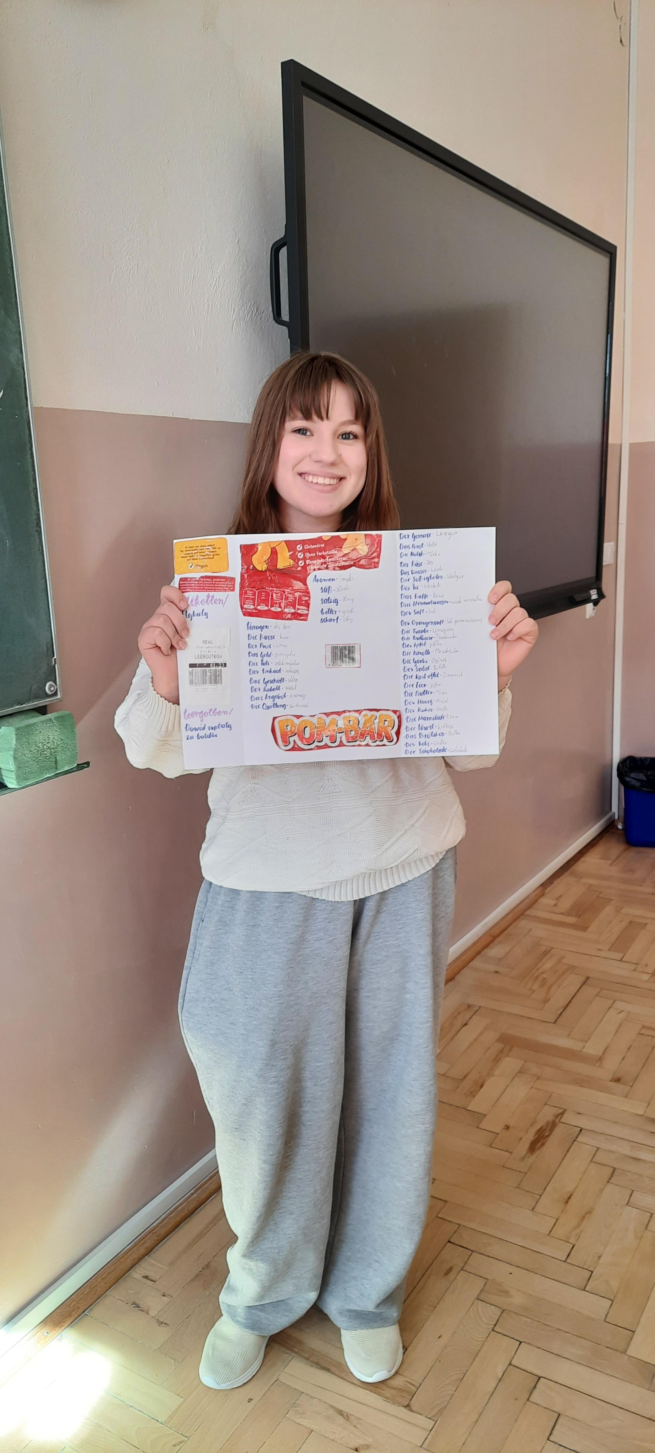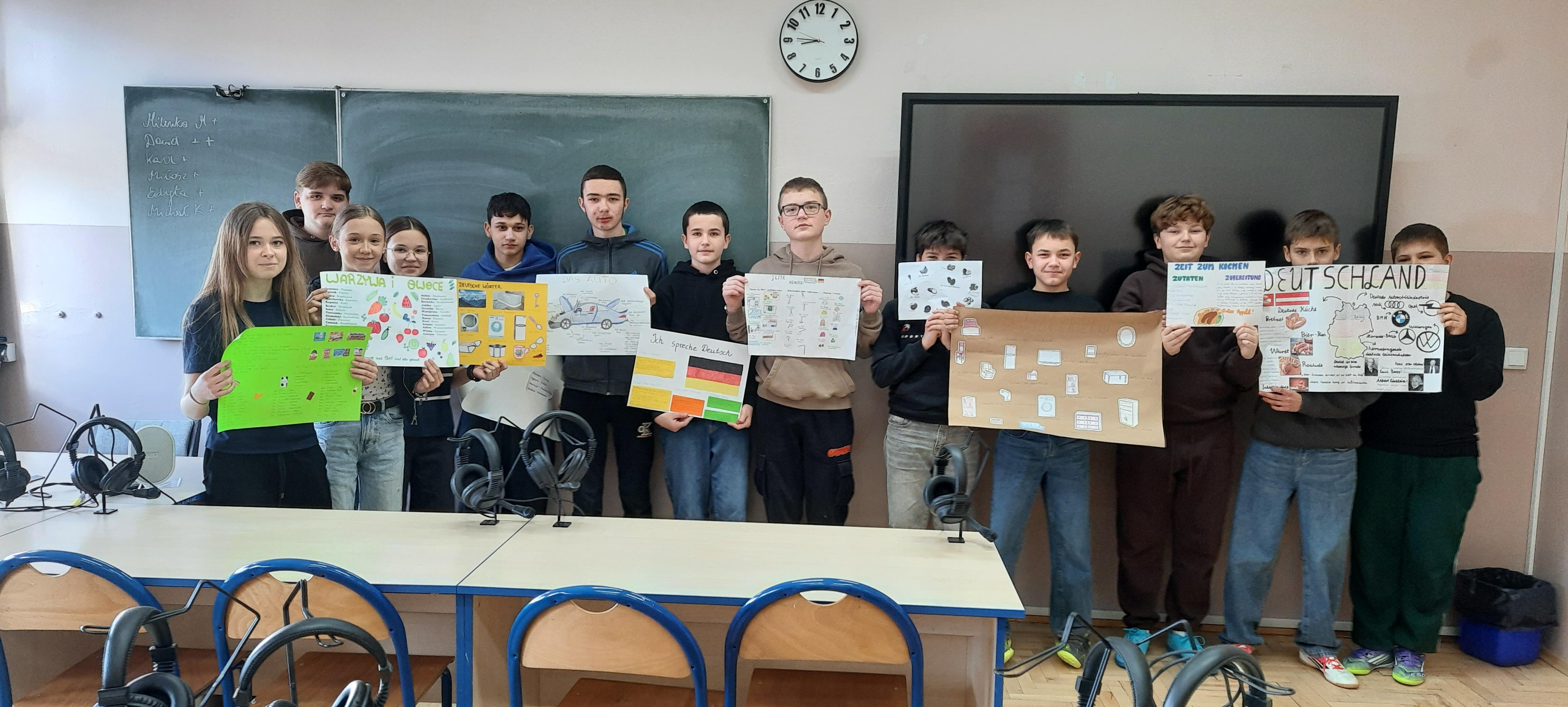 W ubiegłym tygodniu na lekcjach języka niemieckiego w klasie 7 nastąpiło podsumowanie trwającej trzy miesiące innowacji "Deutsch im Alltag - język niemiecki w moim życiu". Celem projektu było pokazanie, że język niemiecki można odnaleźć w codziennym otoczeniu – w nazwach produktów, muzyce, filmach czy Internecie. Uczniowie wyszukiwali niemieckie słowa i zwroty w swoim otoczeniu, analizowali fragmenty piosenek i materiałów medialnych, a także przygotowywali krótkie tłumaczenia wybranych tekstów. Podsumowaniem działań było wykonanie plakatów i kolaży, prezentujących poznane słownictwo oraz przykłady obecności języka niemieckiego w życiu codziennym. Innowacja pozwoliła uczniom w ciekawy i praktyczny sposób rozwijać kompetencje językowe, zwiększyć motywację do nauki oraz odkryć, że język obcy towarzyszy nam również poza szkolną klasą.