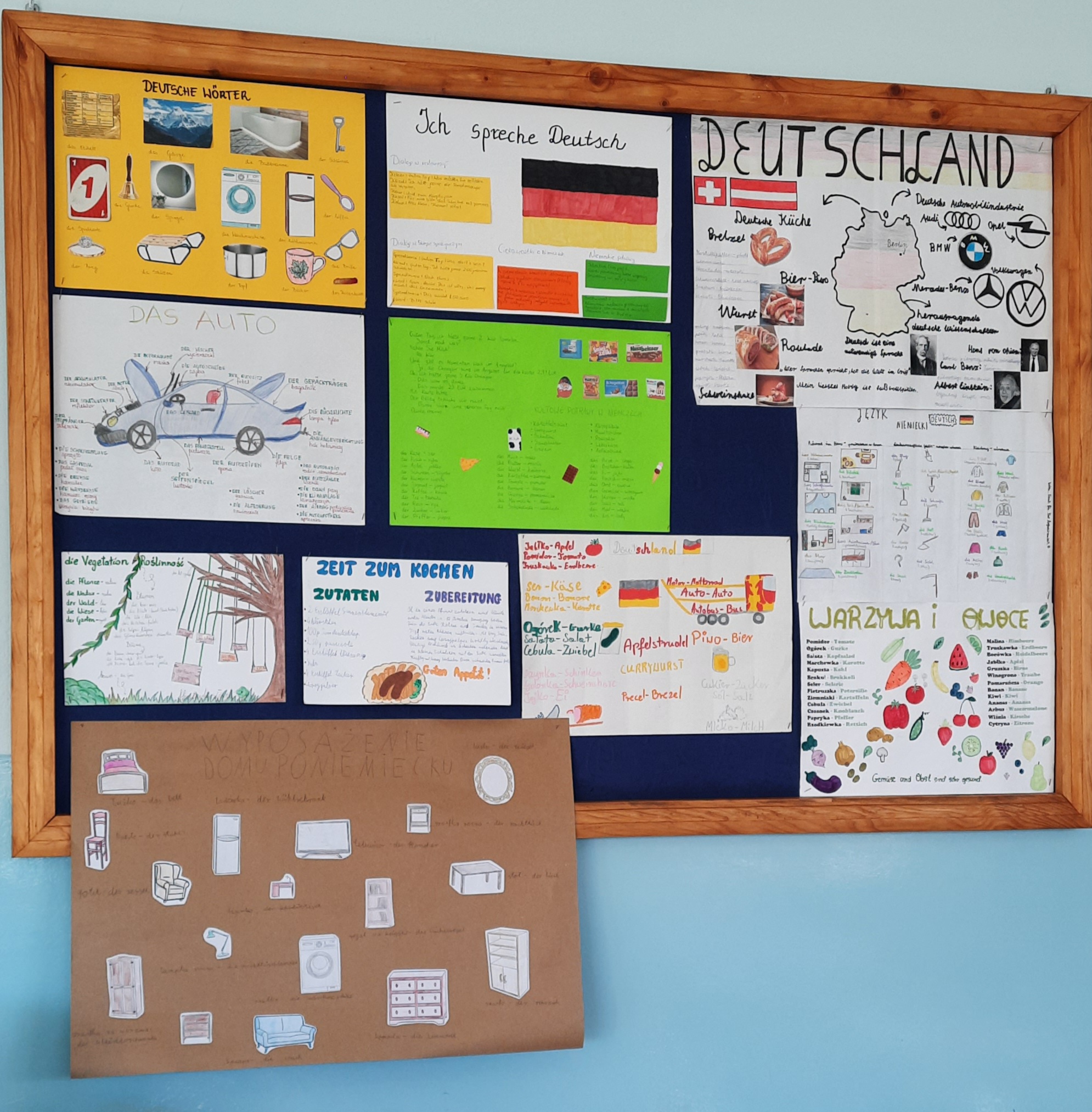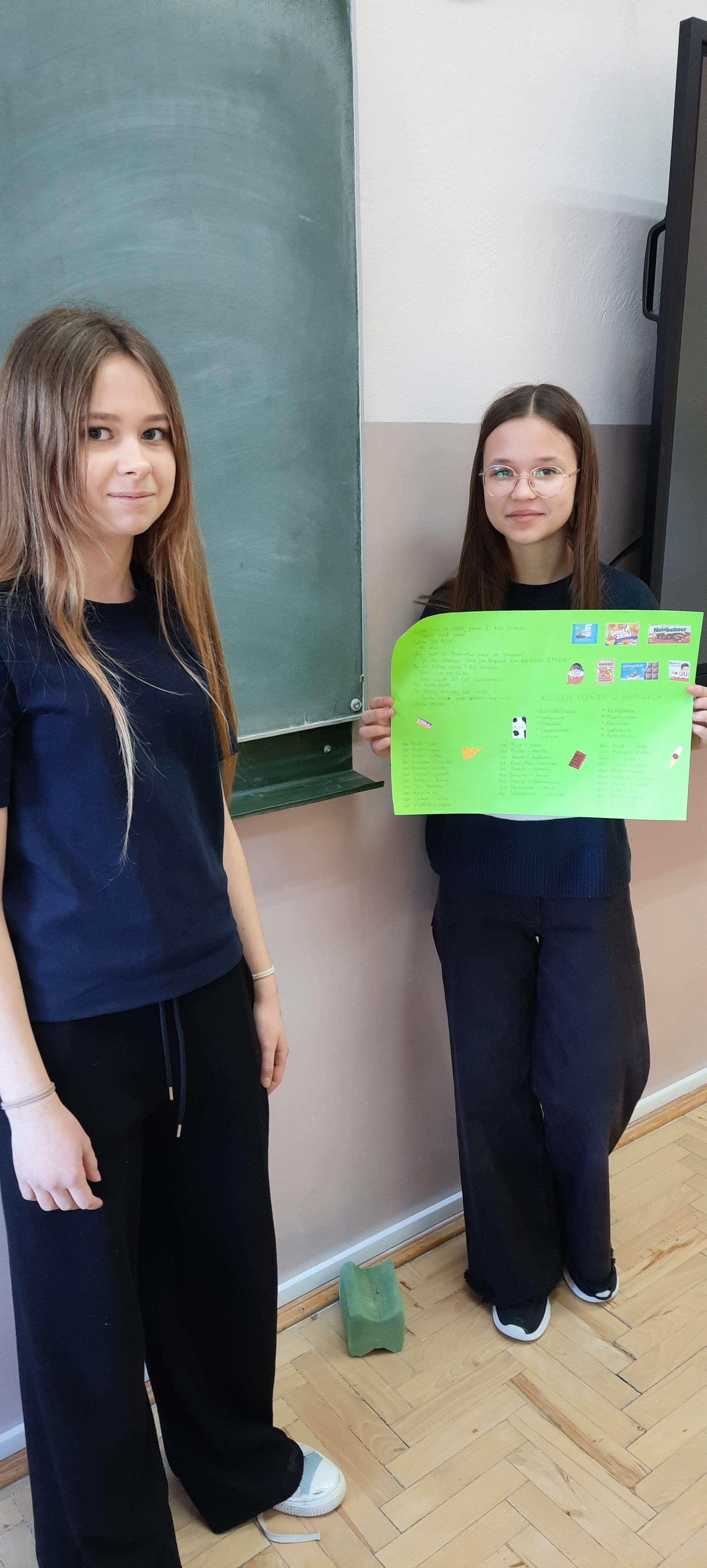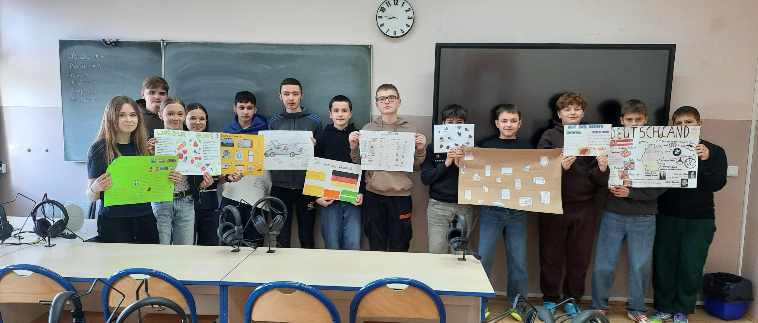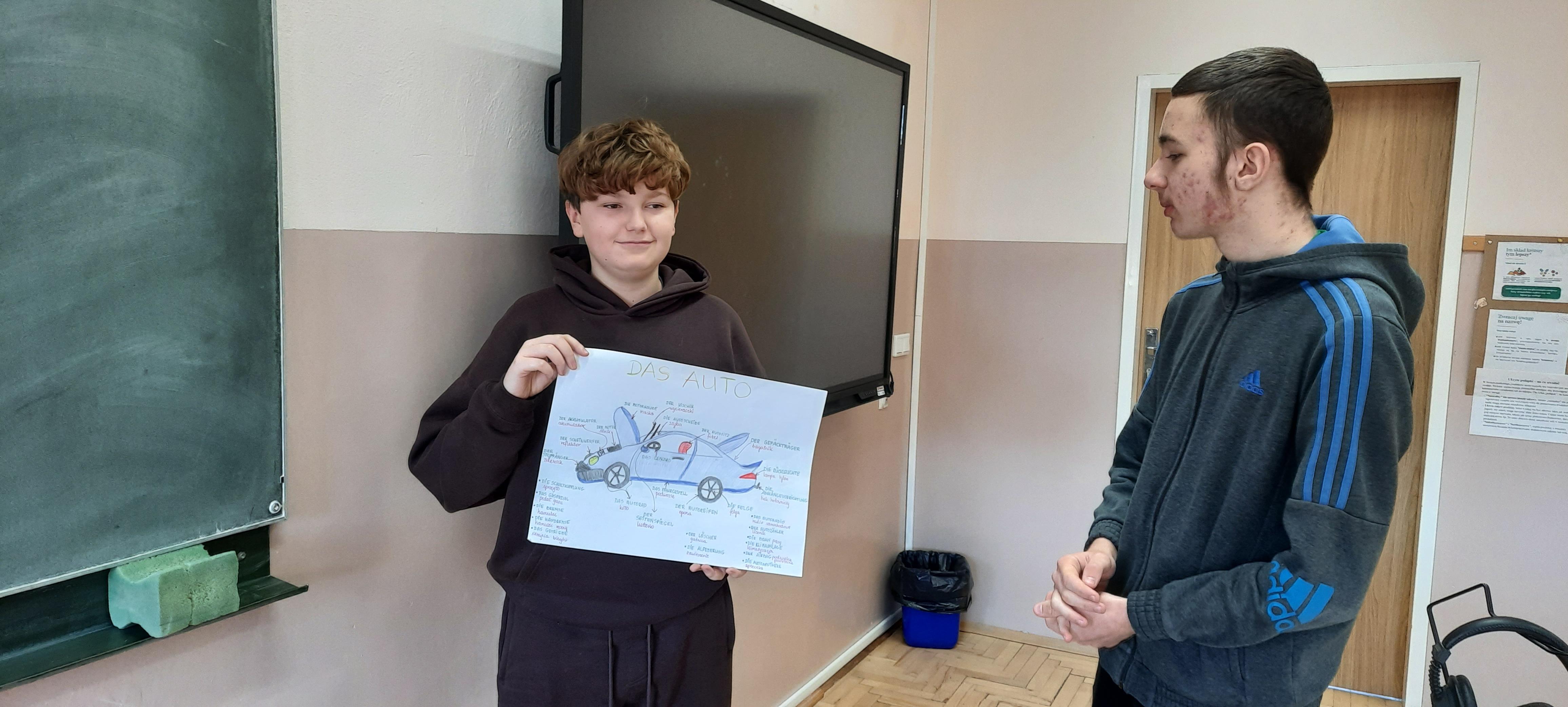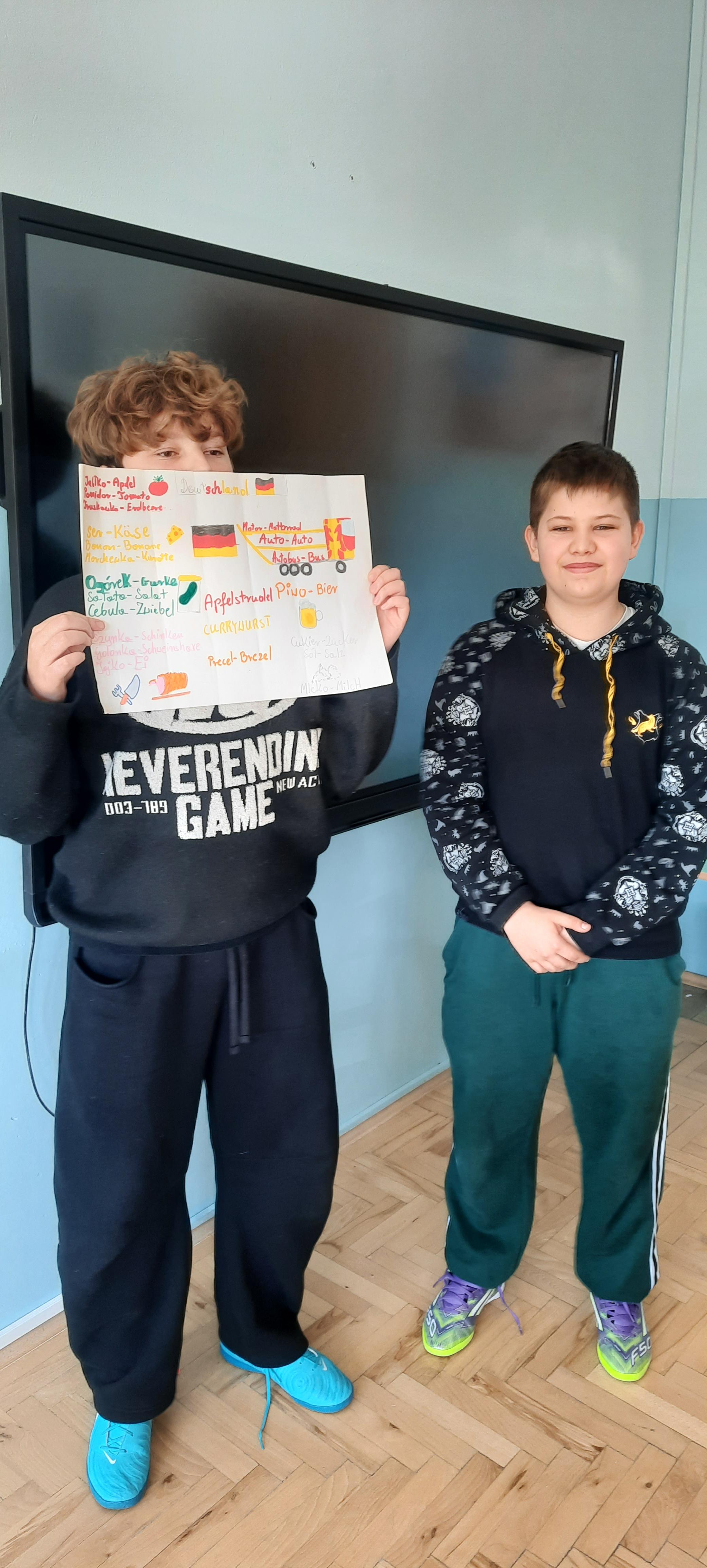 W ubiegłym tygodniu na lekcjach języka niemieckiego w klasie 7 nastąpiło podsumowanie trwającej trzy miesiące innowacji "Deutsch im Alltag - język niemiecki w moim życiu". Celem projektu było pokazanie, że język niemiecki można odnaleźć w codziennym otoczeniu – w nazwach produktów, muzyce, filmach czy Internecie. Uczniowie wyszukiwali niemieckie słowa i zwroty w swoim otoczeniu, analizowali fragmenty piosenek i materiałów medialnych, a także przygotowywali krótkie tłumaczenia wybranych tekstów. Podsumowaniem działań było wykonanie plakatów i kolaży, prezentujących poznane słownictwo oraz przykłady obecności języka niemieckiego w życiu codziennym. Innowacja pozwoliła uczniom w ciekawy i praktyczny sposób rozwijać kompetencje językowe, zwiększyć motywację do nauki oraz odkryć, że język obcy towarzyszy nam również poza szkolną klasą.