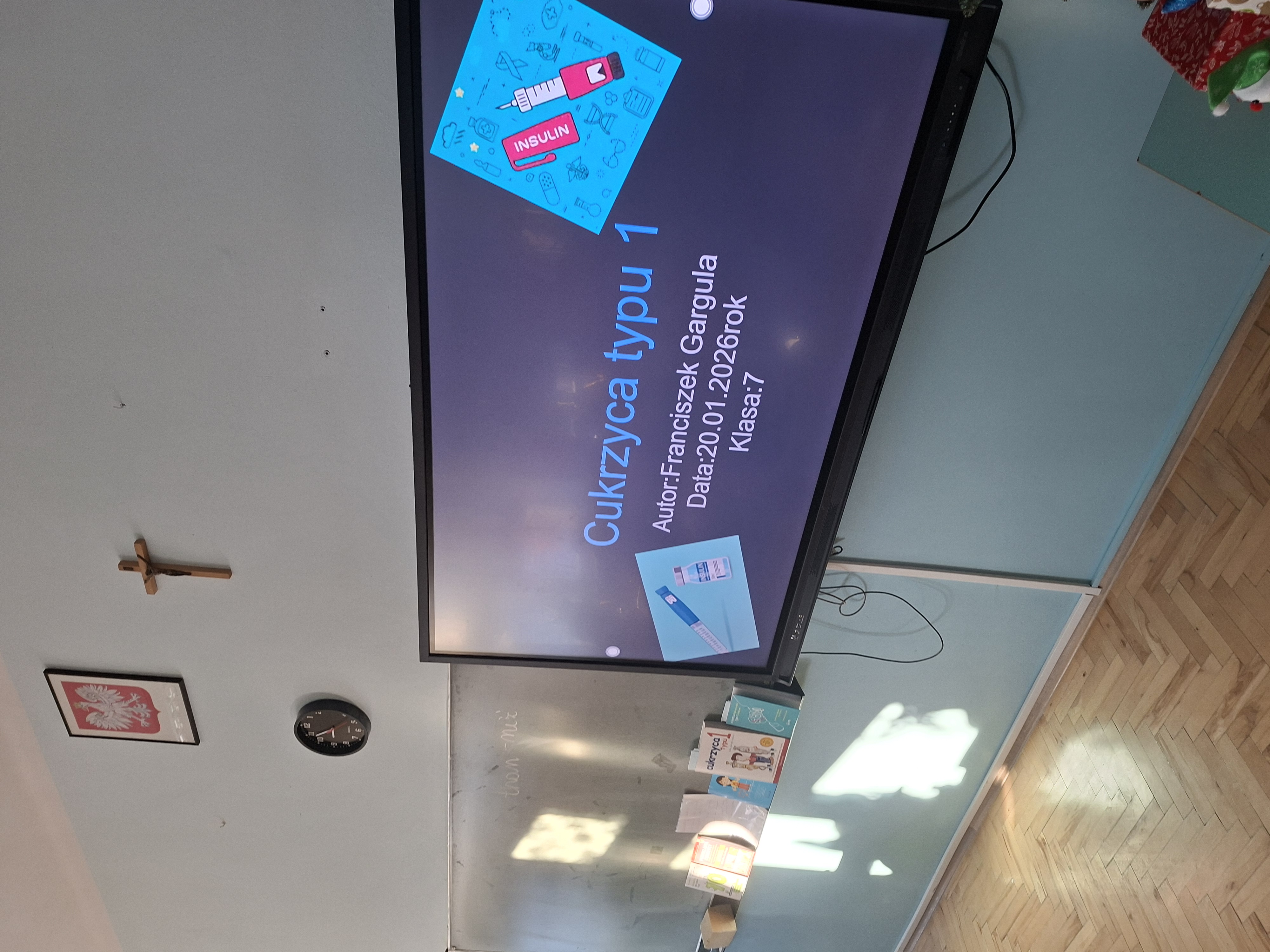 Dzisiaj (21.01) na lekcji biologii w kl.7, uczeń tej klasy, Franek Gargula zaprezentował bardzo obszerną i ciekawą prezentację na temat: „Cukrzycy typu 1”. Prezentacja zawierała informacje na temat historii choroby, liczne ciekawostki i nowinki medyczne. Oprócz profesjonalnej prezentacji, Franek pokazał fachową literaturę z tej dziedziny oraz sprzęt służący do pomiaru cukru. Podzielił się, również swoim doświadczeniem, jak wygląda życie dzieci i młodzieży z cukrzycą typu 1. Dziękujemy Frankowi za ciekawą lekcję biologii.