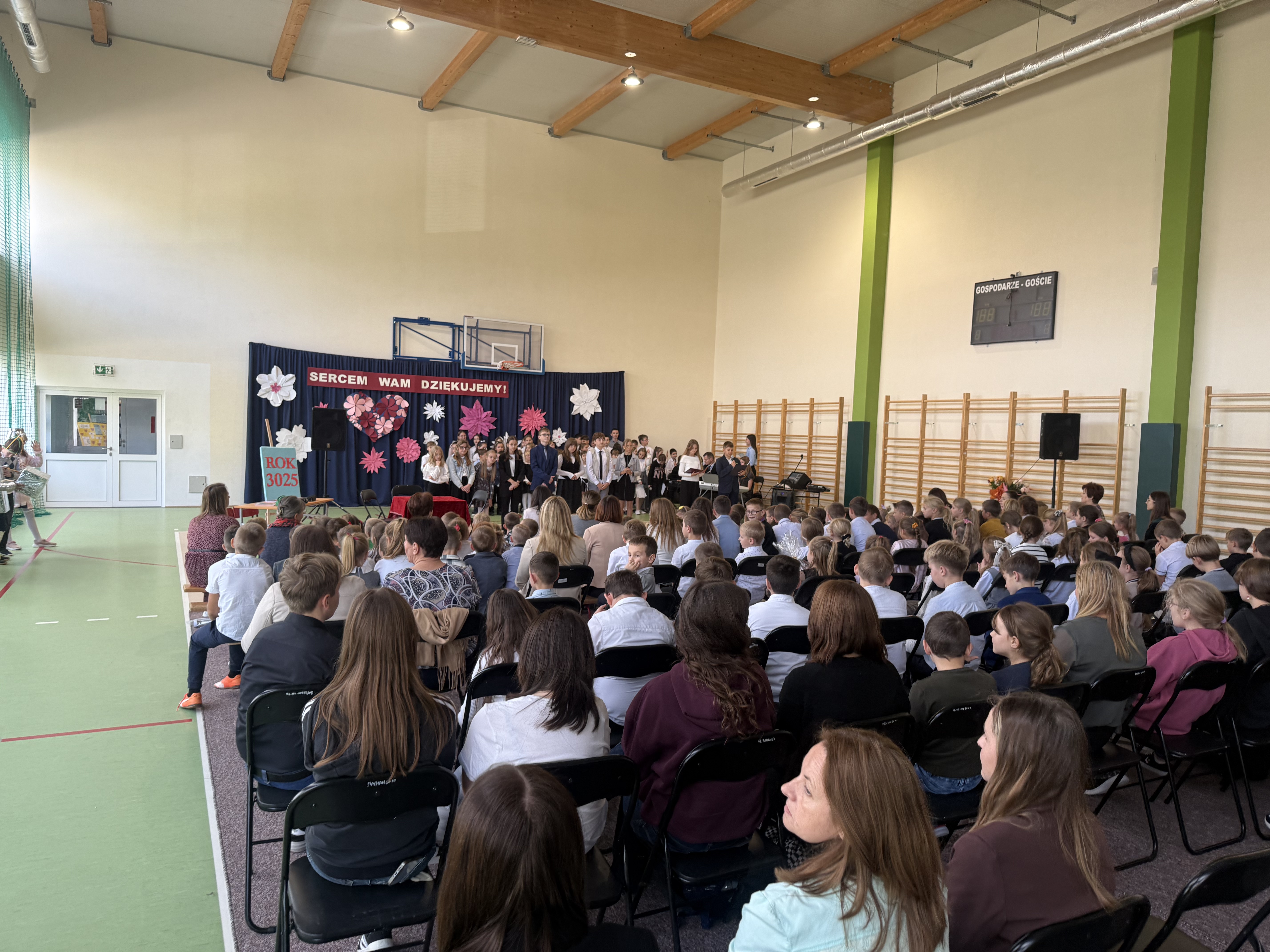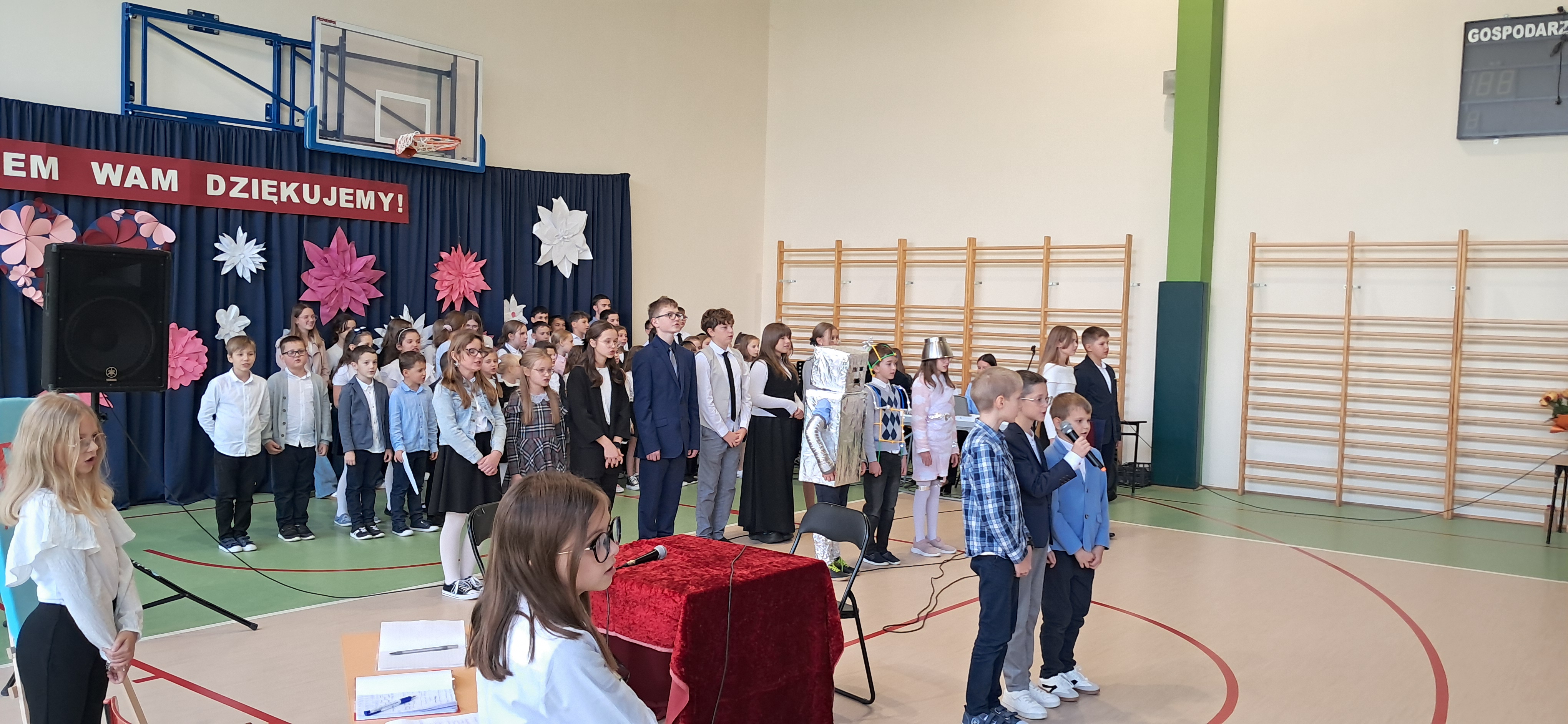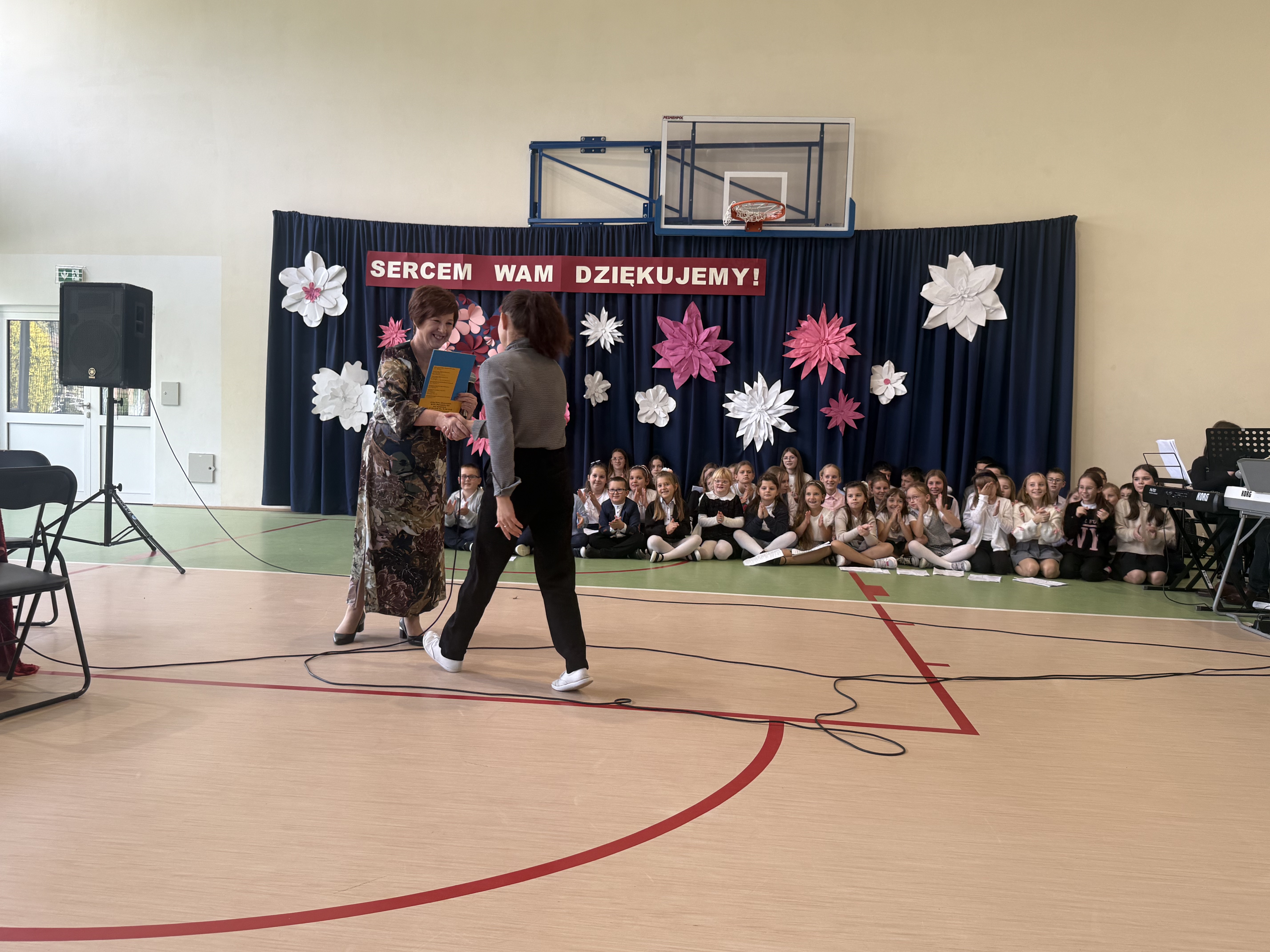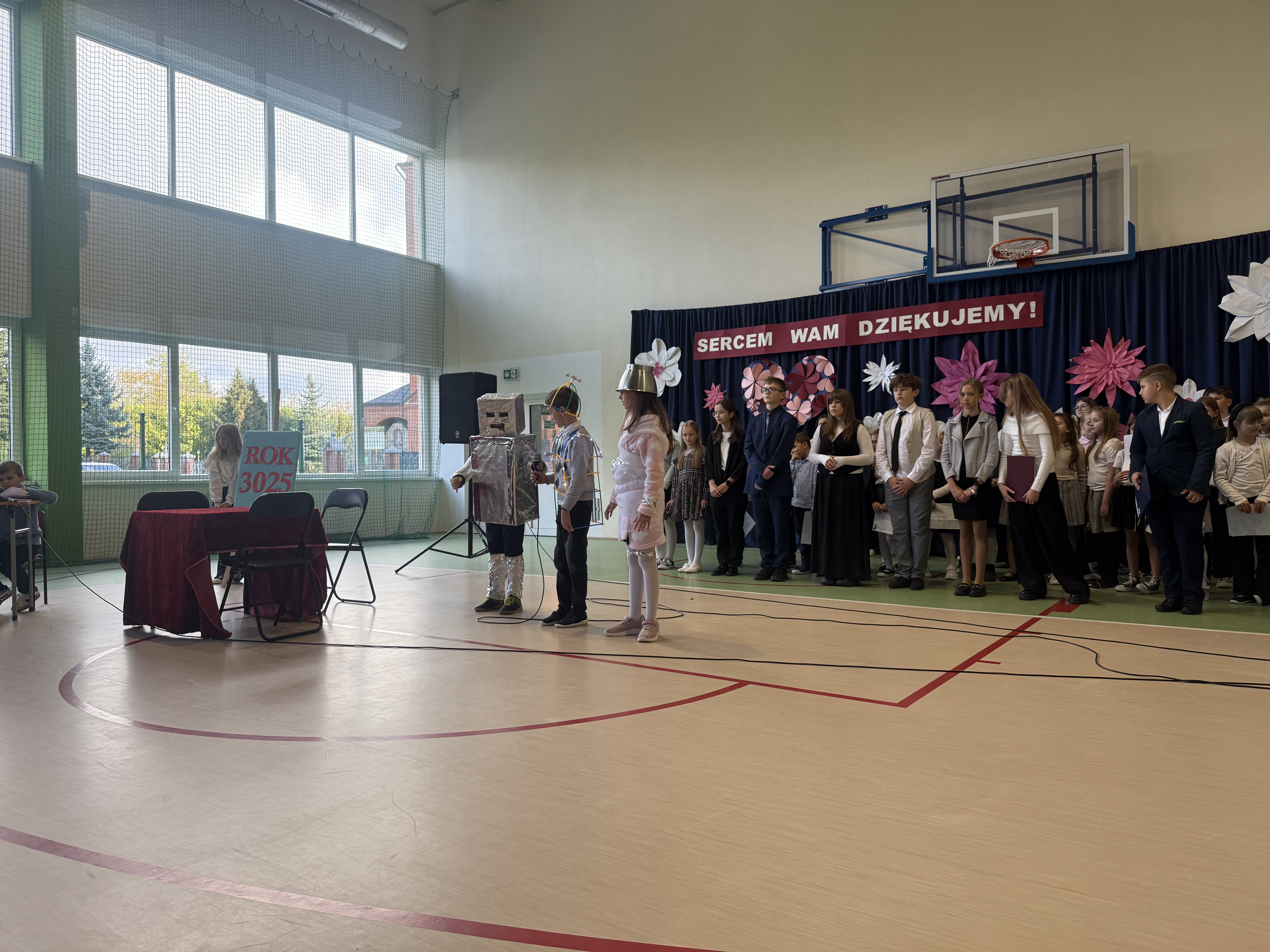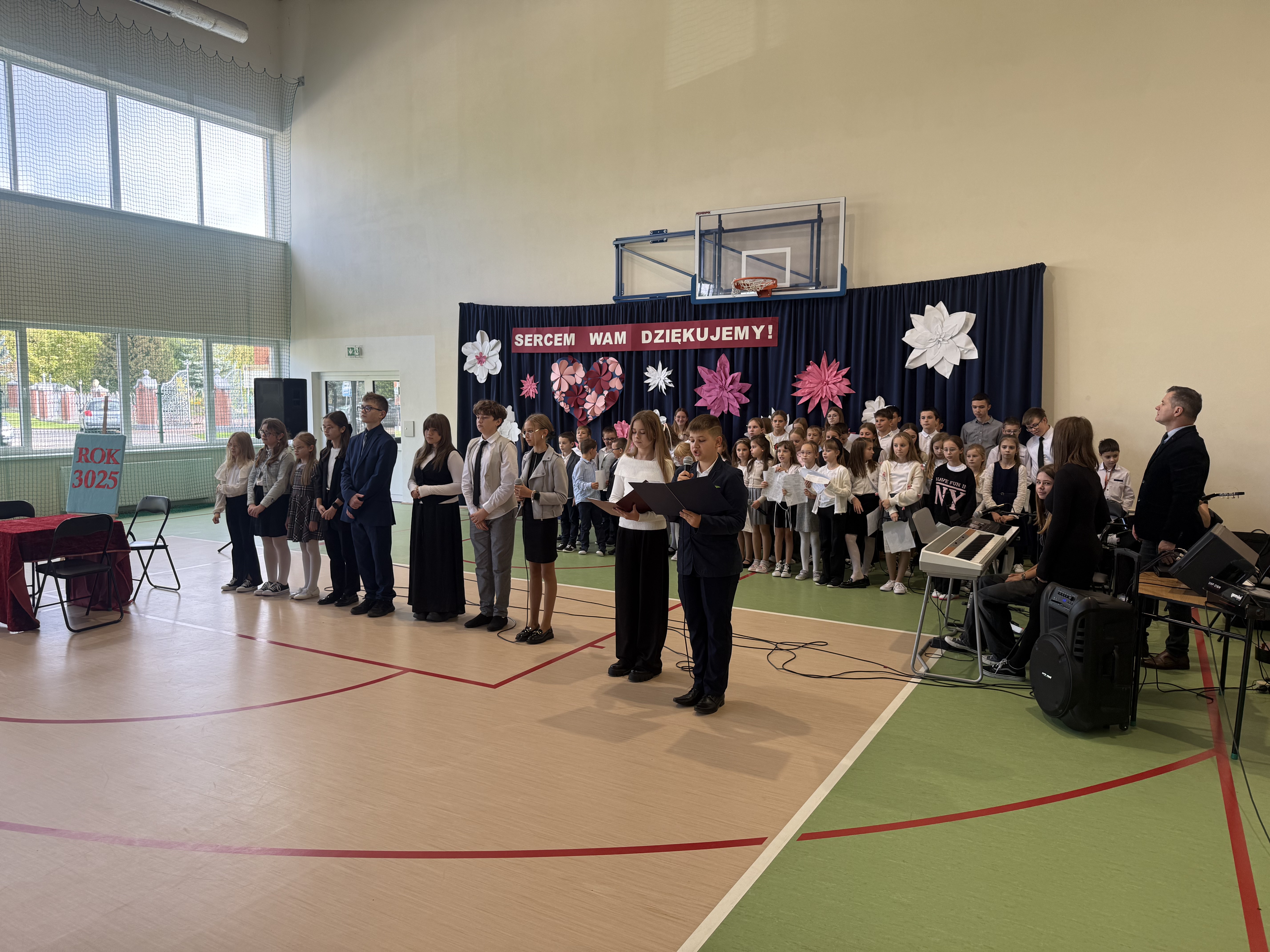 Tegoroczny Dzień Edukacji Narodowej w naszej szkole był wyjątkowym wydarzeniem, przygotowanym z zaangażowaniem i sercem przez uczniów Samorządu Uczniowskiego pod opieką pani Anny Nowackiej i pani Małgorzaty Dranki. Uroczystość odbyła się w sali gimnastycznej i dostarczyła wielu emocji – od wzruszeń po szczery śmiech. Obchody rozpoczęły się częścią artystyczną. Uczniowie zaprezentowali wzruszające wiersze, które były pięknym wyrazem szacunku i wdzięczności wobec nauczycieli i wszystkich pracowników szkoły. W wielu oczach pojawiły się łzy wzruszenia – słowa młodych artystów trafiły prosto w serca. Na scenie wystąpił szkolny chór, pod czujnym okiem pana Piotra Burkota. Piękne wykonania znanych piosenek wprowadziły wszystkich w wyjątkowy nastrój i zostały nagrodzone gromkimi brawami. W drugiej części uczniowie zaskoczyli publiczność humorem – wystawili skecz, przedstawiający zabawną wizję szkoły przyszłości, w której nauczycieli zastąpiły... roboty! Choć technologia robiła wrażenie, nie dorównywała prawdziwym nauczycielom, co w żartobliwy sposób podkreślili młodzi aktorzy. Na zakończenie głos zabrała pani dyrektor, która serdecznie podziękowała wszystkim nauczycielom za ich codzienny trud, poświęcenie i serce wkładane w pracę z uczniami. Wręczyła również nagrody nauczycielom, co spotkało się z ogromnym aplauzem. To był dzień pełen emocji, uśmiechów i podziękowań. Pokazał, jak ważną rolę odgrywają nauczyciele w życiu szkoły i jak bardzo są doceniani przez uczniów. Dzień Nauczyciela 2025 z pewnością na długo pozostanie w naszej pamięci.