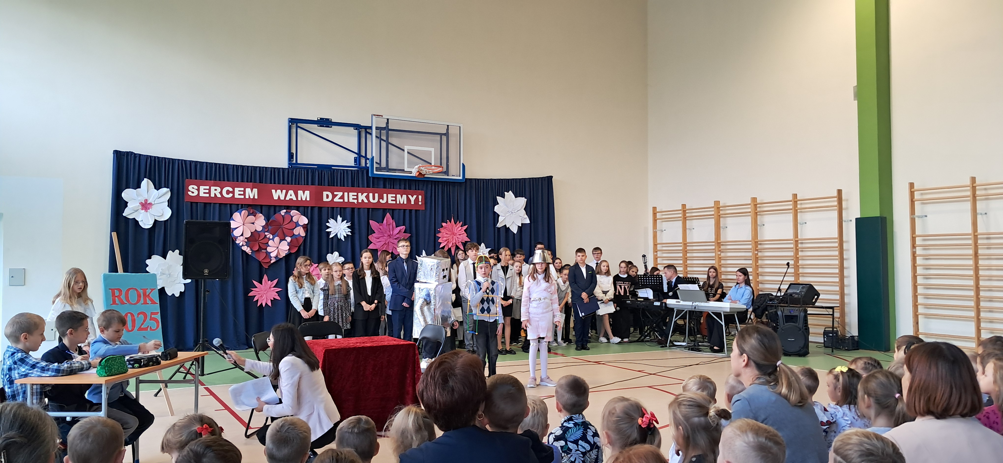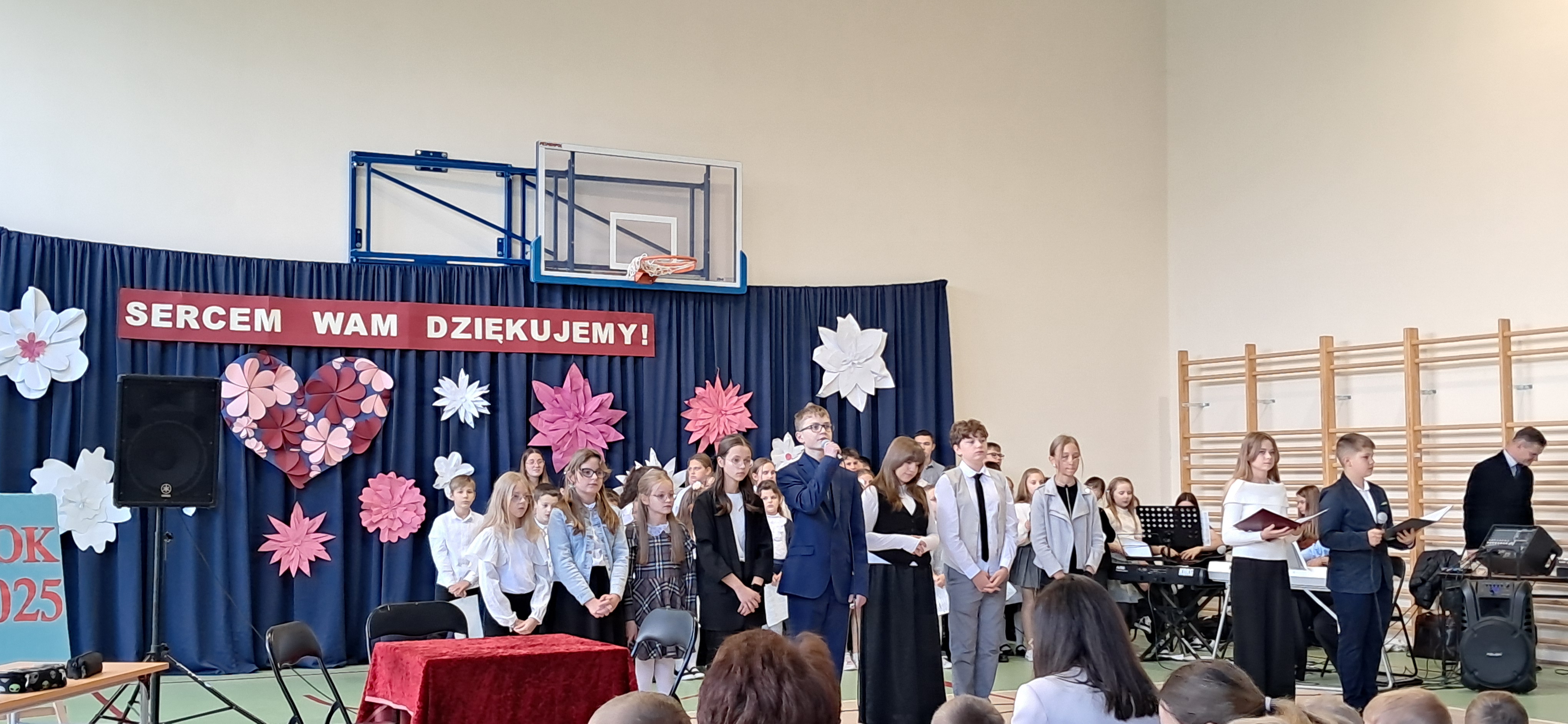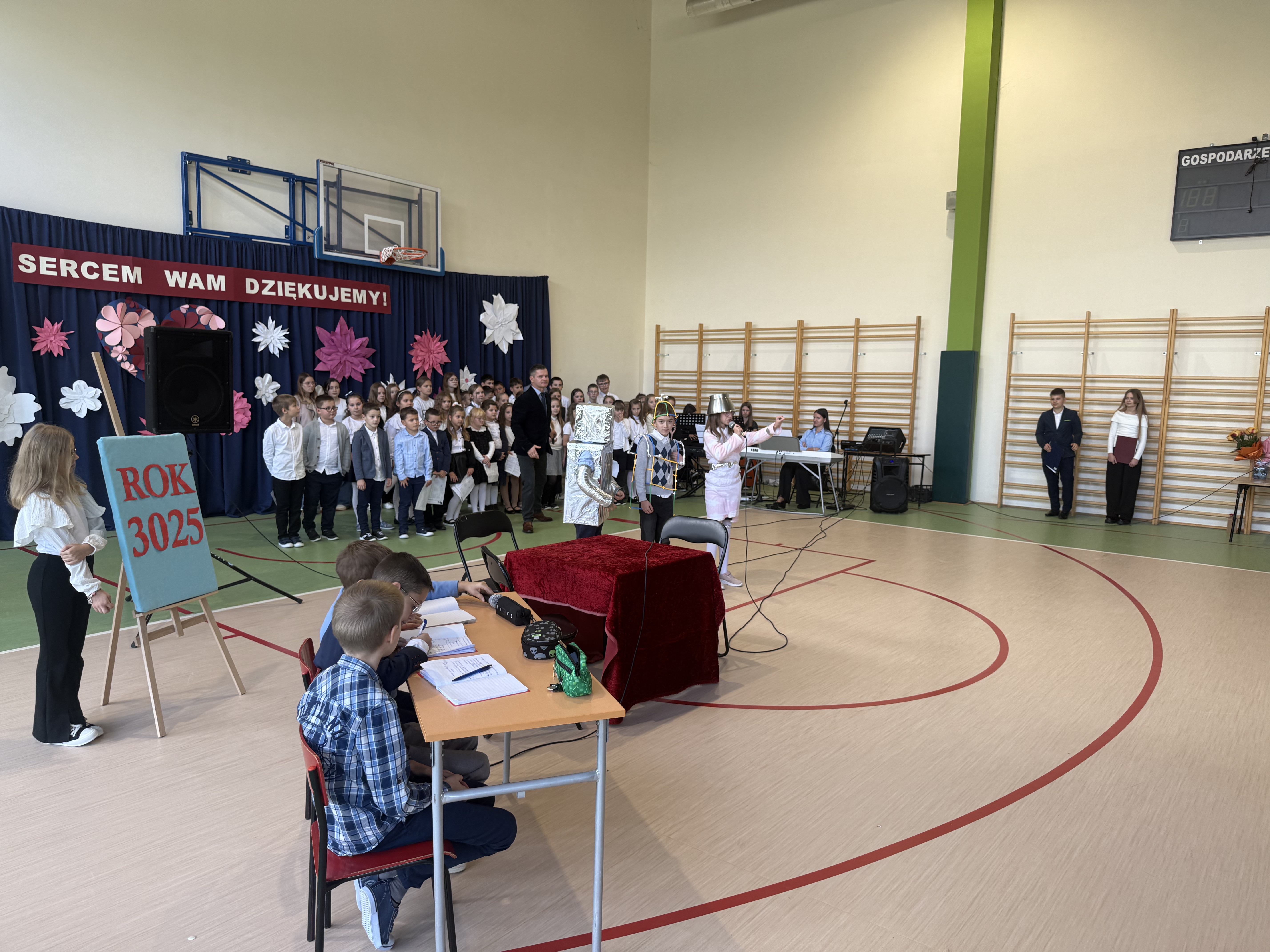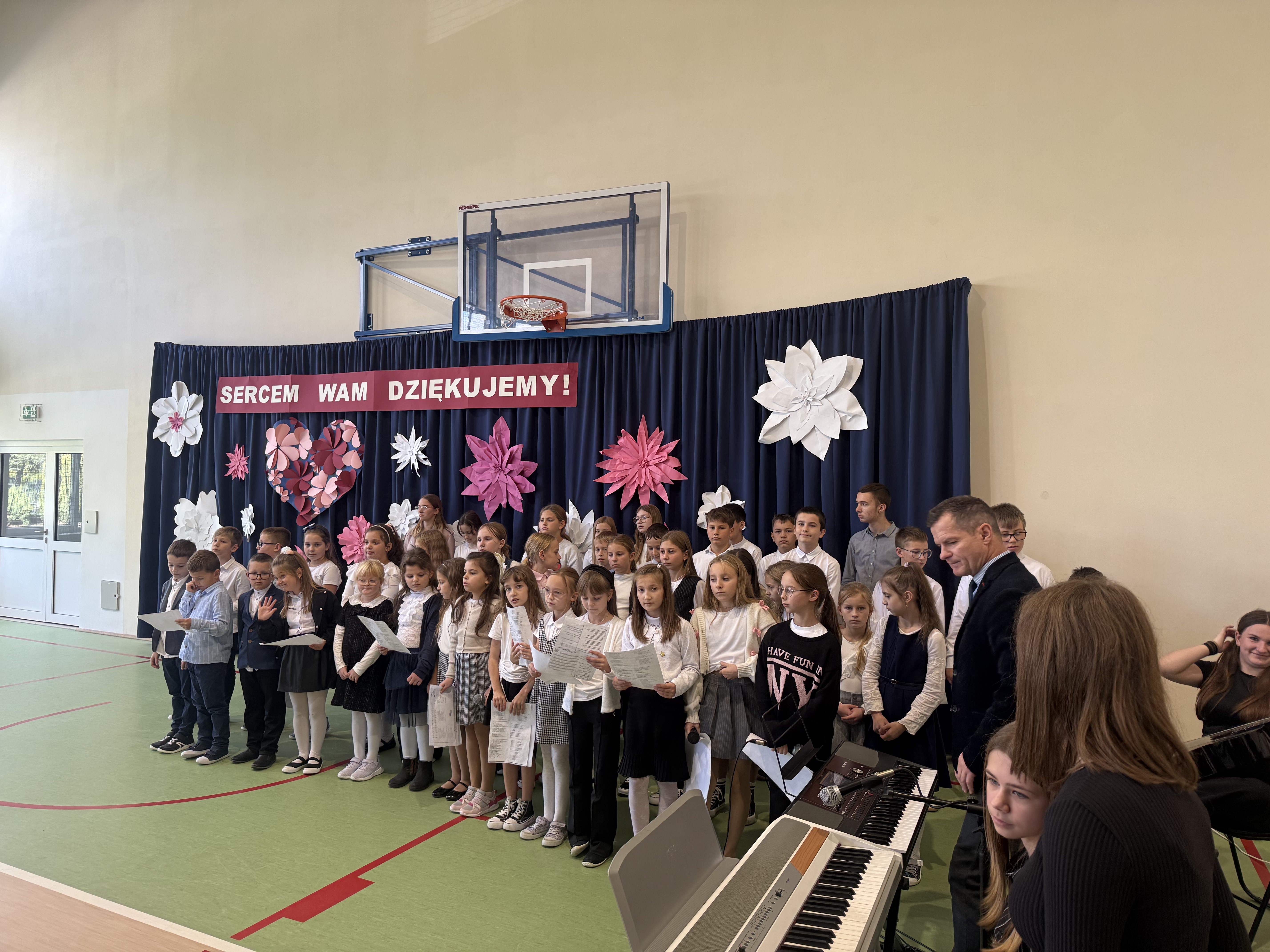 Tegoroczny Dzień Edukacji Narodowej w naszej szkole był wyjątkowym wydarzeniem, przygotowanym z zaangażowaniem i sercem przez uczniów Samorządu Uczniowskiego pod opieką pani Anny Nowackiej i pani Małgorzaty Dranki. Uroczystość odbyła się w sali gimnastycznej i dostarczyła wielu emocji – od wzruszeń po szczery śmiech. Obchody rozpoczęły się częścią artystyczną. Uczniowie zaprezentowali wzruszające wiersze, które były pięknym wyrazem szacunku i wdzięczności wobec nauczycieli i wszystkich pracowników szkoły. W wielu oczach pojawiły się łzy wzruszenia – słowa młodych artystów trafiły prosto w serca. Na scenie wystąpił szkolny chór, pod czujnym okiem pana Piotra Burkota. Piękne wykonania znanych piosenek wprowadziły wszystkich w wyjątkowy nastrój i zostały nagrodzone gromkimi brawami. W drugiej części uczniowie zaskoczyli publiczność humorem – wystawili skecz, przedstawiający zabawną wizję szkoły przyszłości, w której nauczycieli zastąpiły... roboty! Choć technologia robiła wrażenie, nie dorównywała prawdziwym nauczycielom, co w żartobliwy sposób podkreślili młodzi aktorzy. Na zakończenie głos zabrała pani dyrektor, która serdecznie podziękowała wszystkim nauczycielom za ich codzienny trud, poświęcenie i serce wkładane w pracę z uczniami. Wręczyła również nagrody nauczycielom, co spotkało się z ogromnym aplauzem. To był dzień pełen emocji, uśmiechów i podziękowań. Pokazał, jak ważną rolę odgrywają nauczyciele w życiu szkoły i jak bardzo są doceniani przez uczniów. Dzień Nauczyciela 2025 z pewnością na długo pozostanie w naszej pamięci.