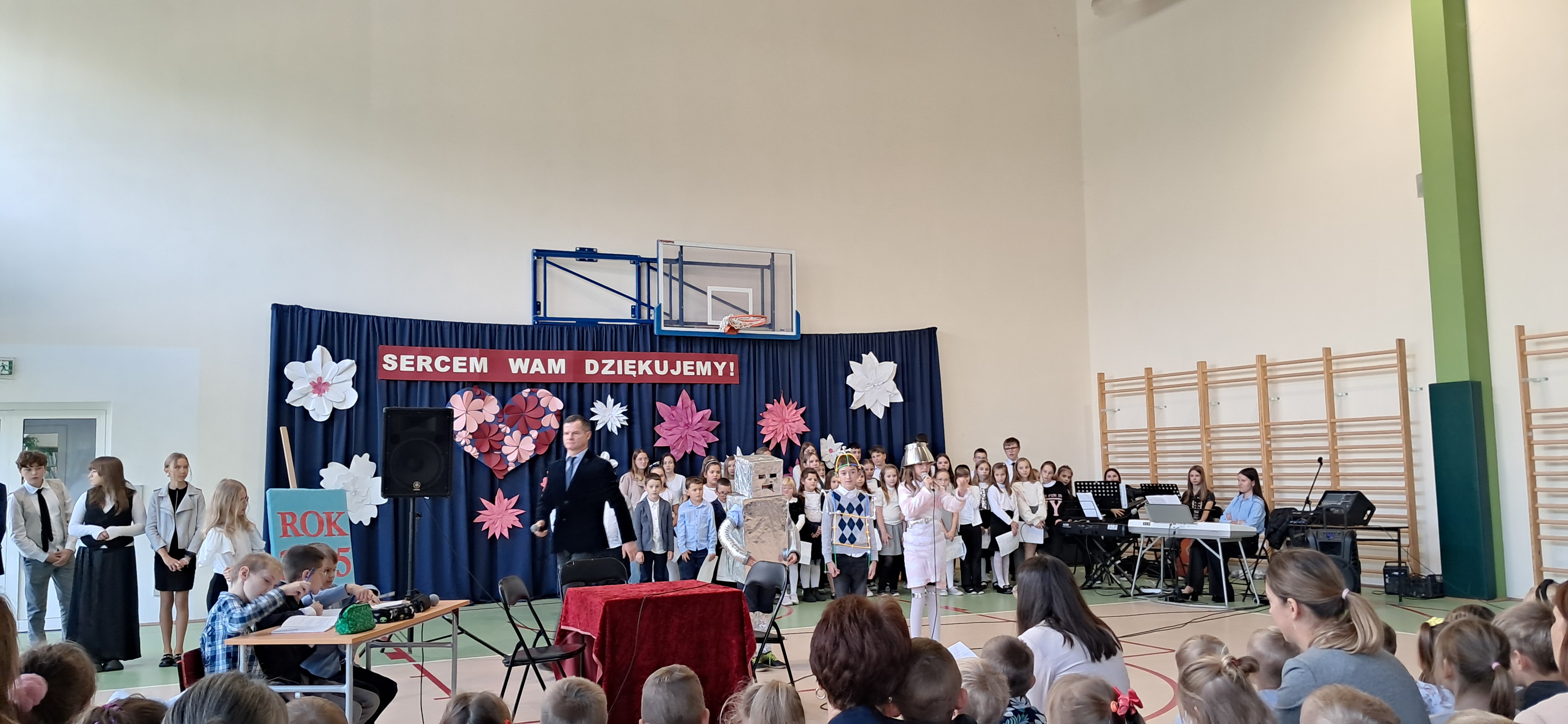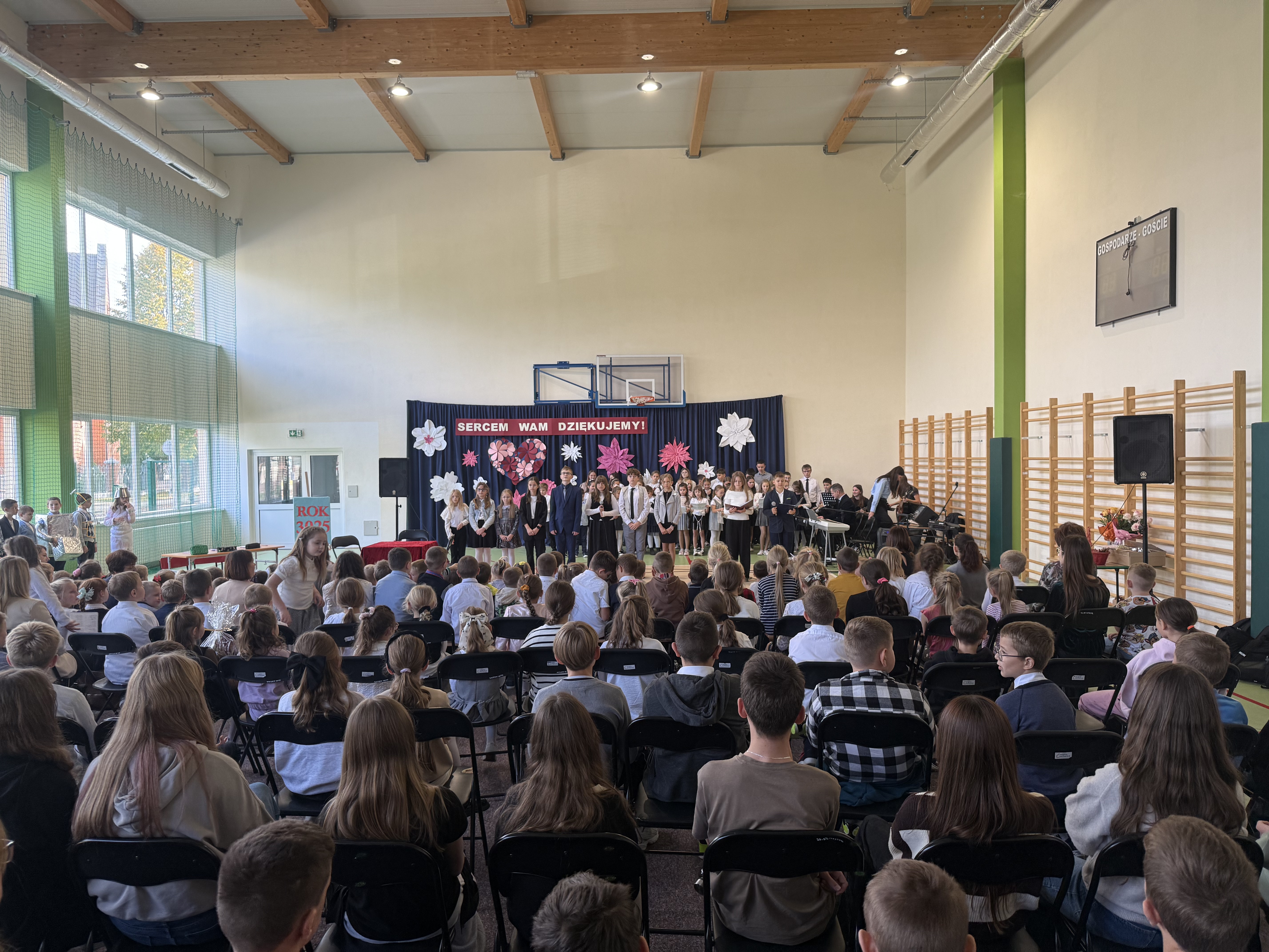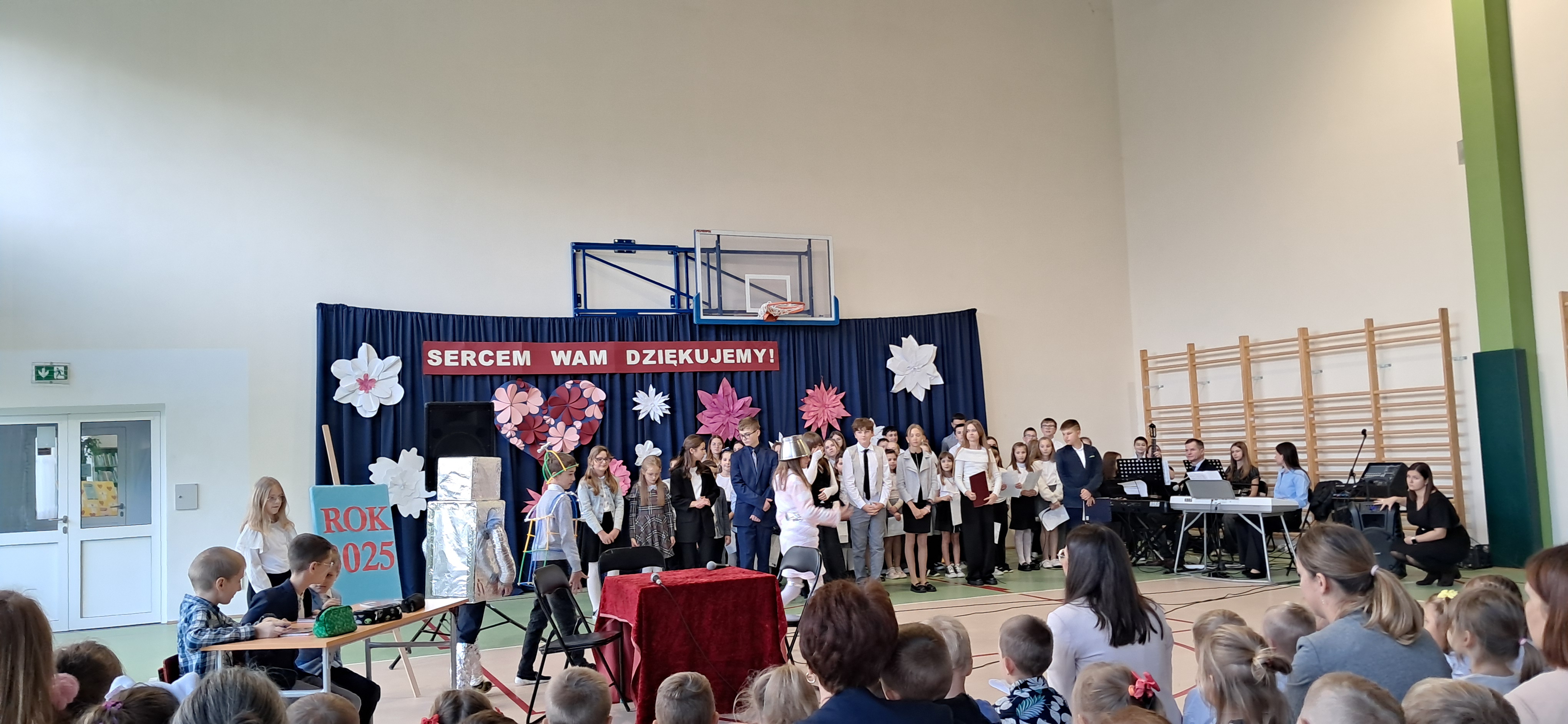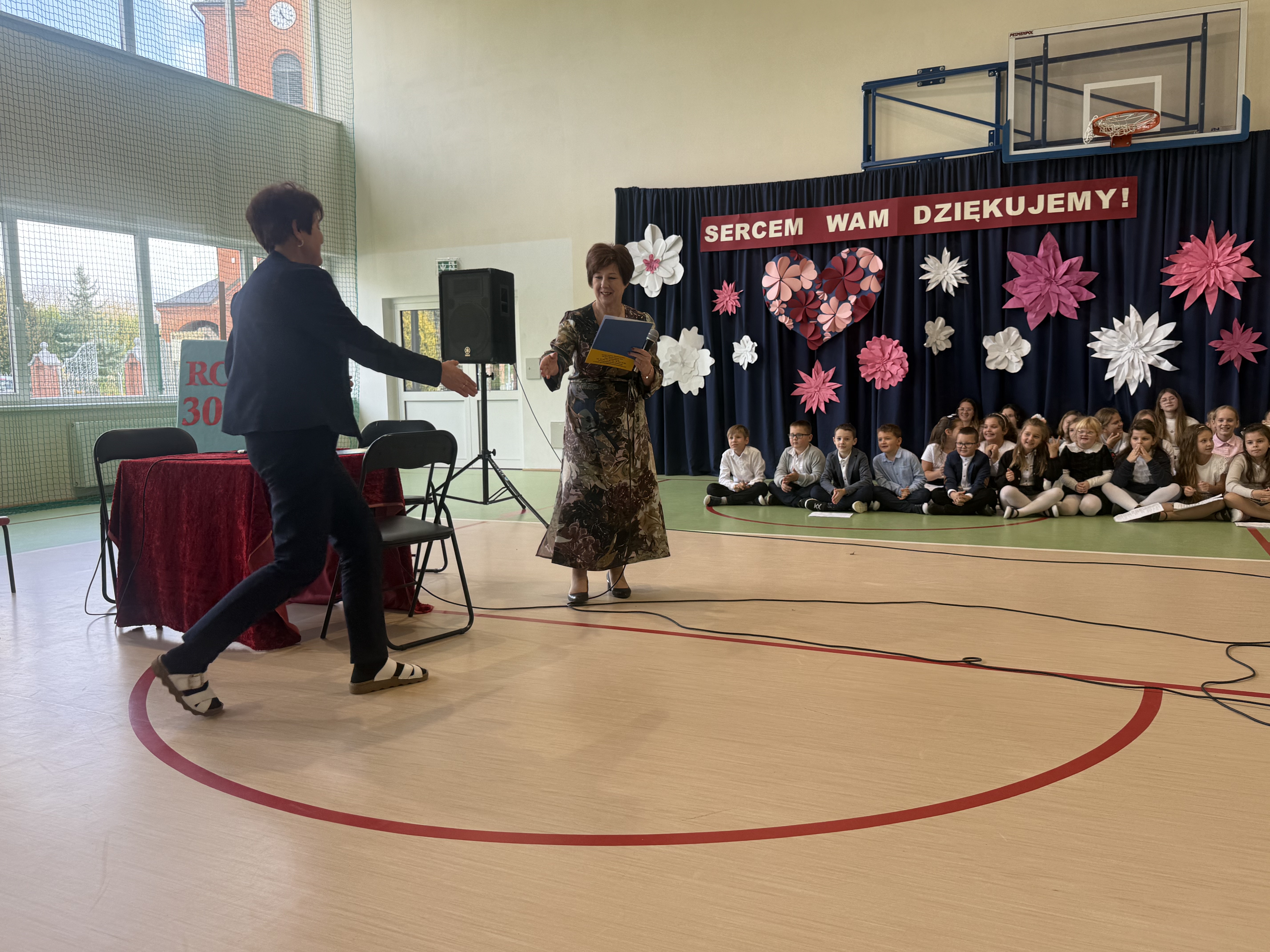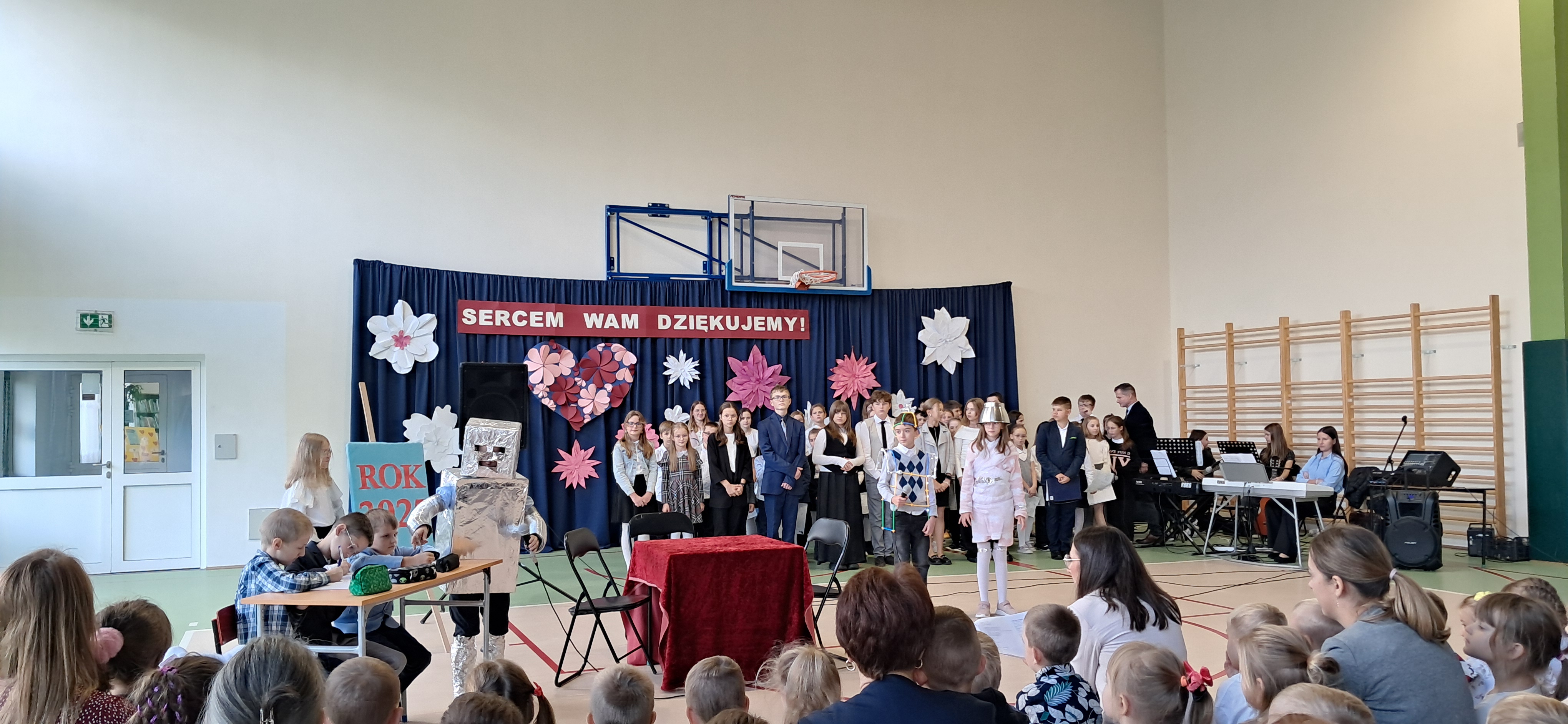 Tegoroczny Dzień Edukacji Narodowej w naszej szkole był wyjątkowym wydarzeniem, przygotowanym z zaangażowaniem i sercem przez uczniów Samorządu Uczniowskiego pod opieką pani Anny Nowackiej i pani Małgorzaty Dranki. Uroczystość odbyła się w sali gimnastycznej i dostarczyła wielu emocji – od wzruszeń po szczery śmiech. Obchody rozpoczęły się częścią artystyczną. Uczniowie zaprezentowali wzruszające wiersze, które były pięknym wyrazem szacunku i wdzięczności wobec nauczycieli i wszystkich pracowników szkoły. W wielu oczach pojawiły się łzy wzruszenia – słowa młodych artystów trafiły prosto w serca. Na scenie wystąpił szkolny chór, pod czujnym okiem pana Piotra Burkota. Piękne wykonania znanych piosenek wprowadziły wszystkich w wyjątkowy nastrój i zostały nagrodzone gromkimi brawami. W drugiej części uczniowie zaskoczyli publiczność humorem – wystawili skecz, przedstawiający zabawną wizję szkoły przyszłości, w której nauczycieli zastąpiły... roboty! Choć technologia robiła wrażenie, nie dorównywała prawdziwym nauczycielom, co w żartobliwy sposób podkreślili młodzi aktorzy. Na zakończenie głos zabrała pani dyrektor, która serdecznie podziękowała wszystkim nauczycielom za ich codzienny trud, poświęcenie i serce wkładane w pracę z uczniami. Wręczyła również nagrody nauczycielom, co spotkało się z ogromnym aplauzem. To był dzień pełen emocji, uśmiechów i podziękowań. Pokazał, jak ważną rolę odgrywają nauczyciele w życiu szkoły i jak bardzo są doceniani przez uczniów. Dzień Nauczyciela 2025 z pewnością na długo pozostanie w naszej pamięci.