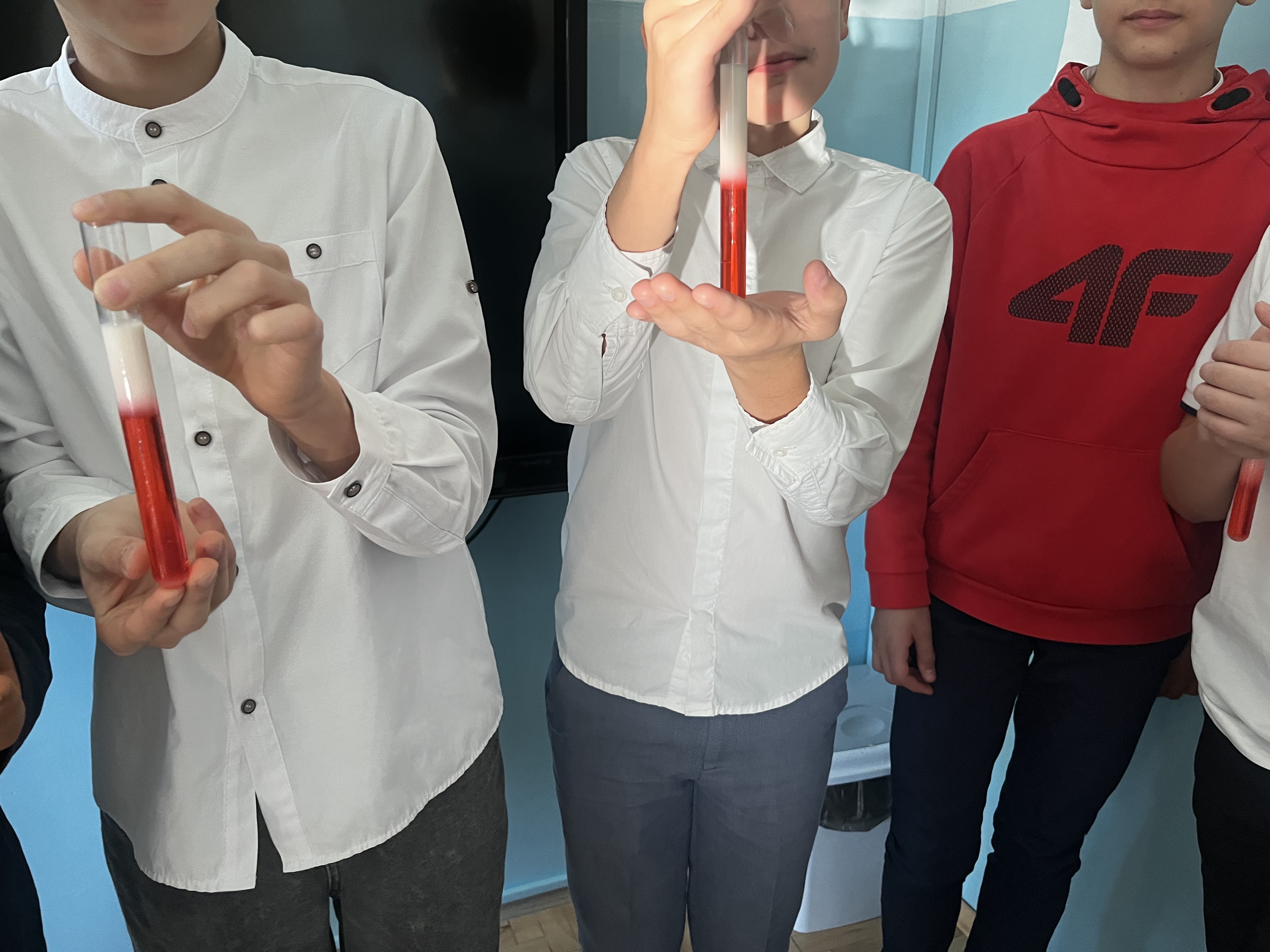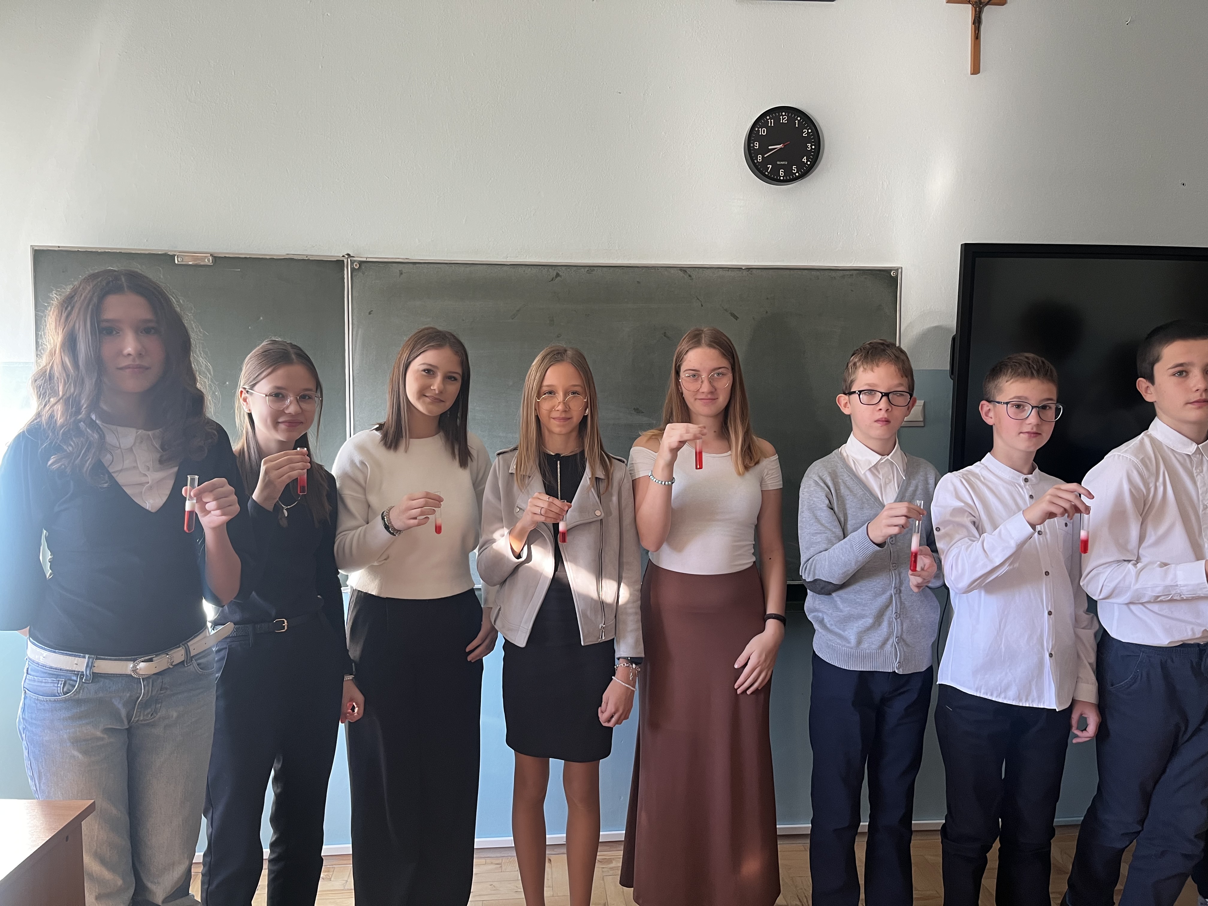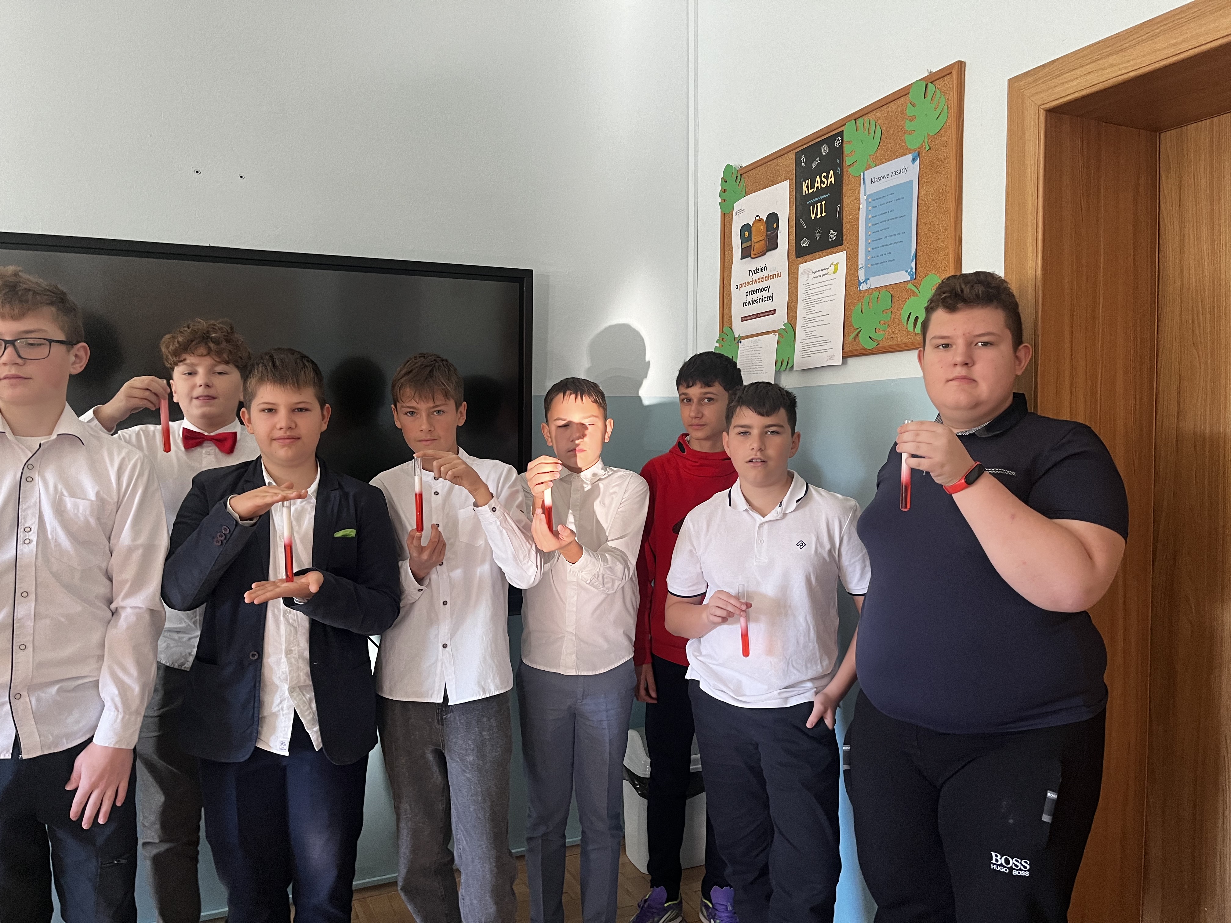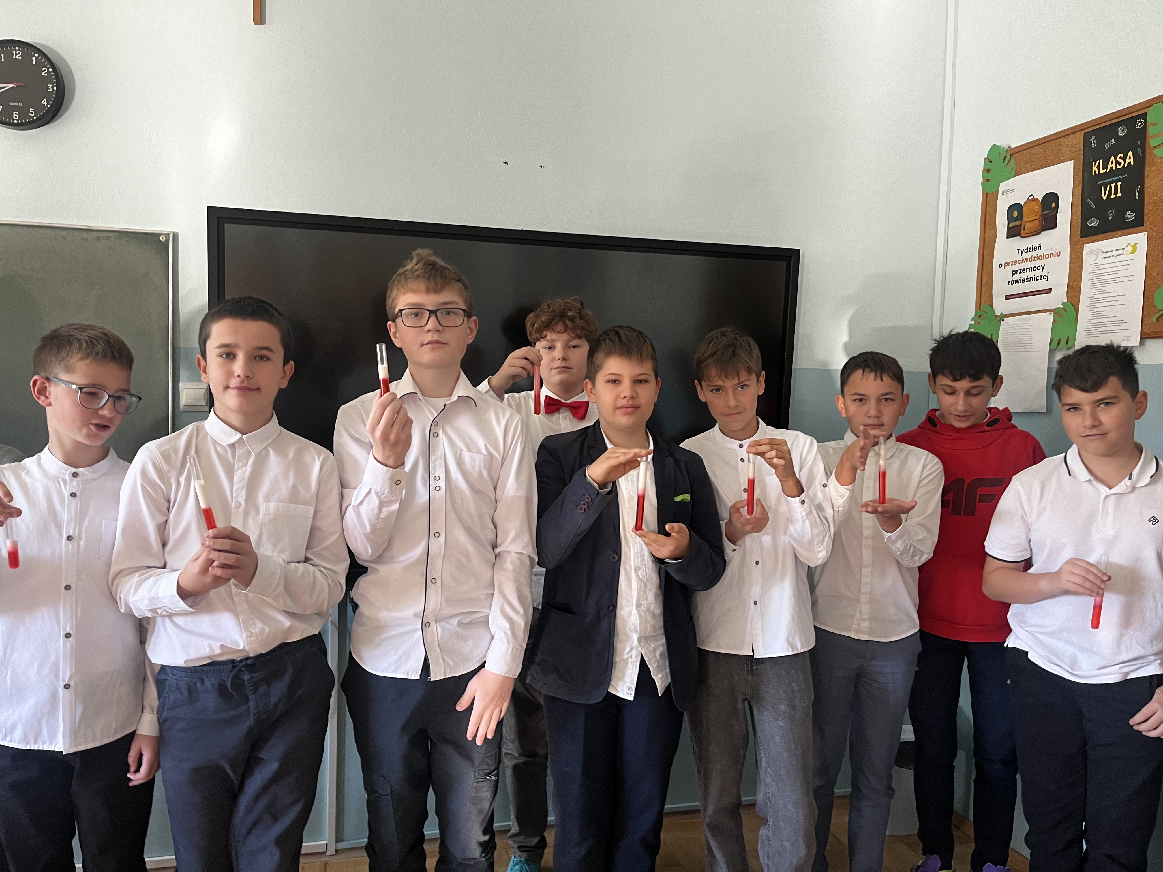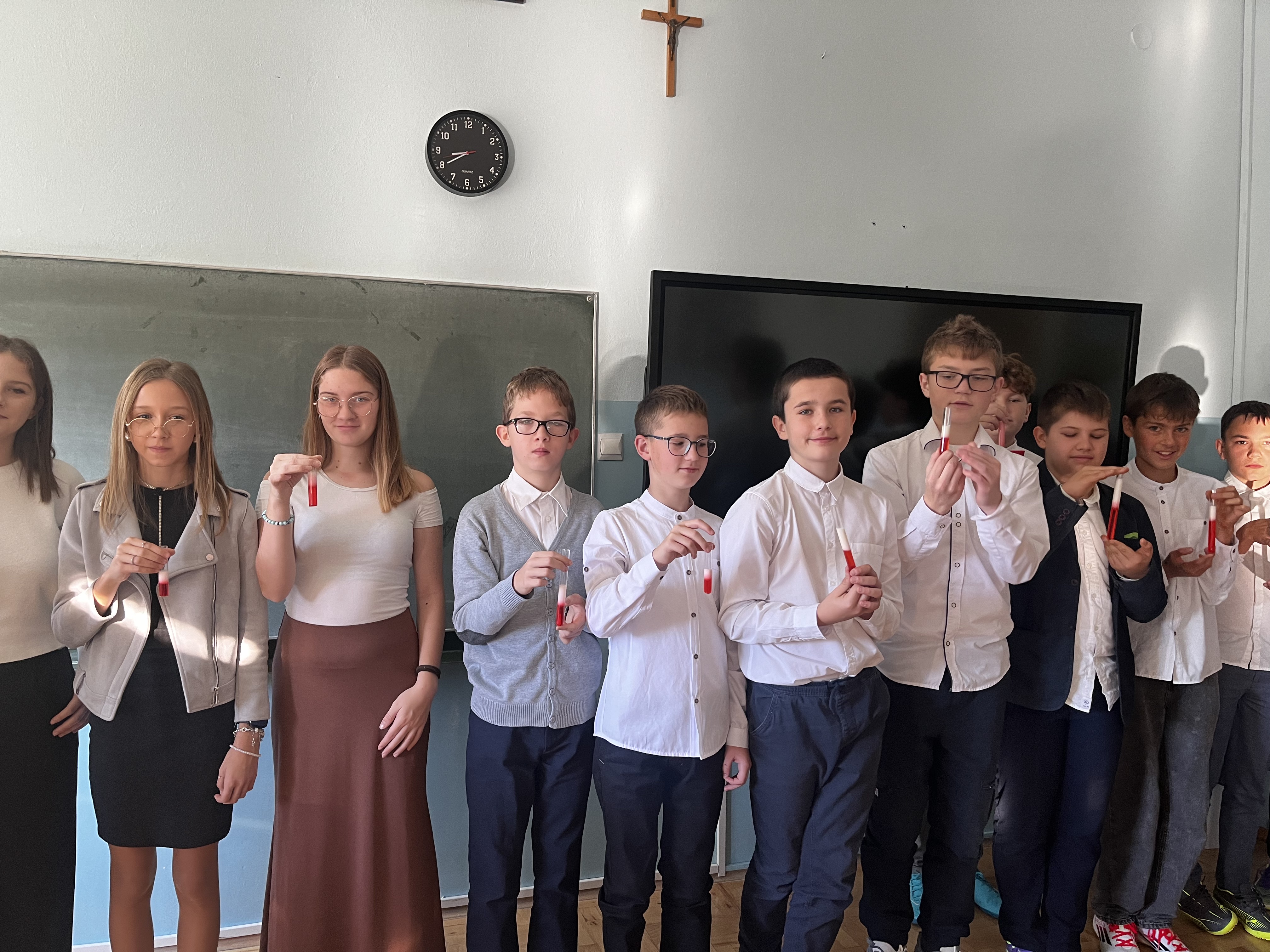 Uczniowie klasy 7 uczcili Narodowe Święto Niepodległości podczas lekcji chemii, tworząc piękną flagę Polski. W ten nietypowy sposób połączyli naukę z patriotyzmem, przypominając sobie znaczenie 11 listopada – dnia, w którym Polska odzyskała niepodległość.