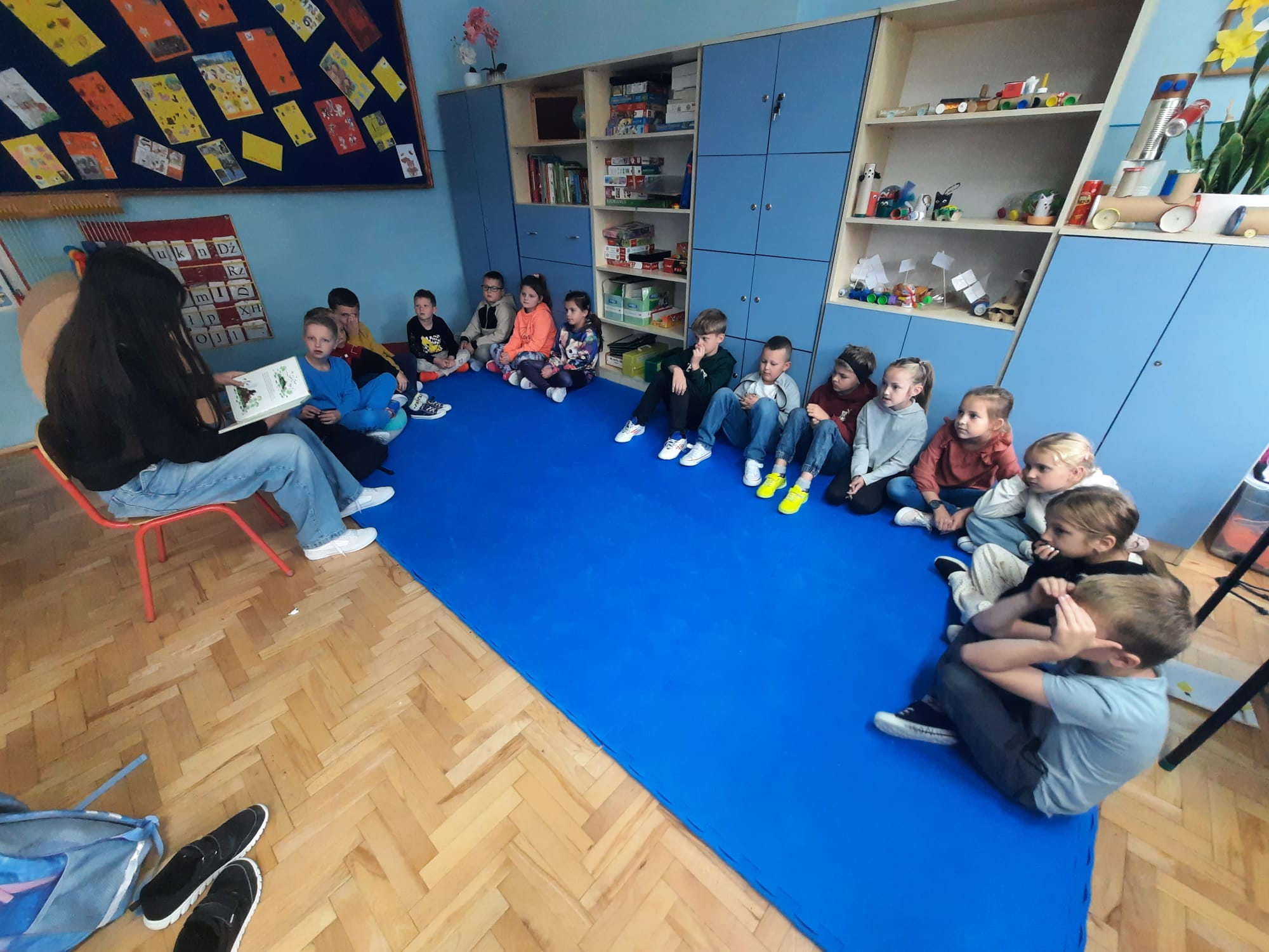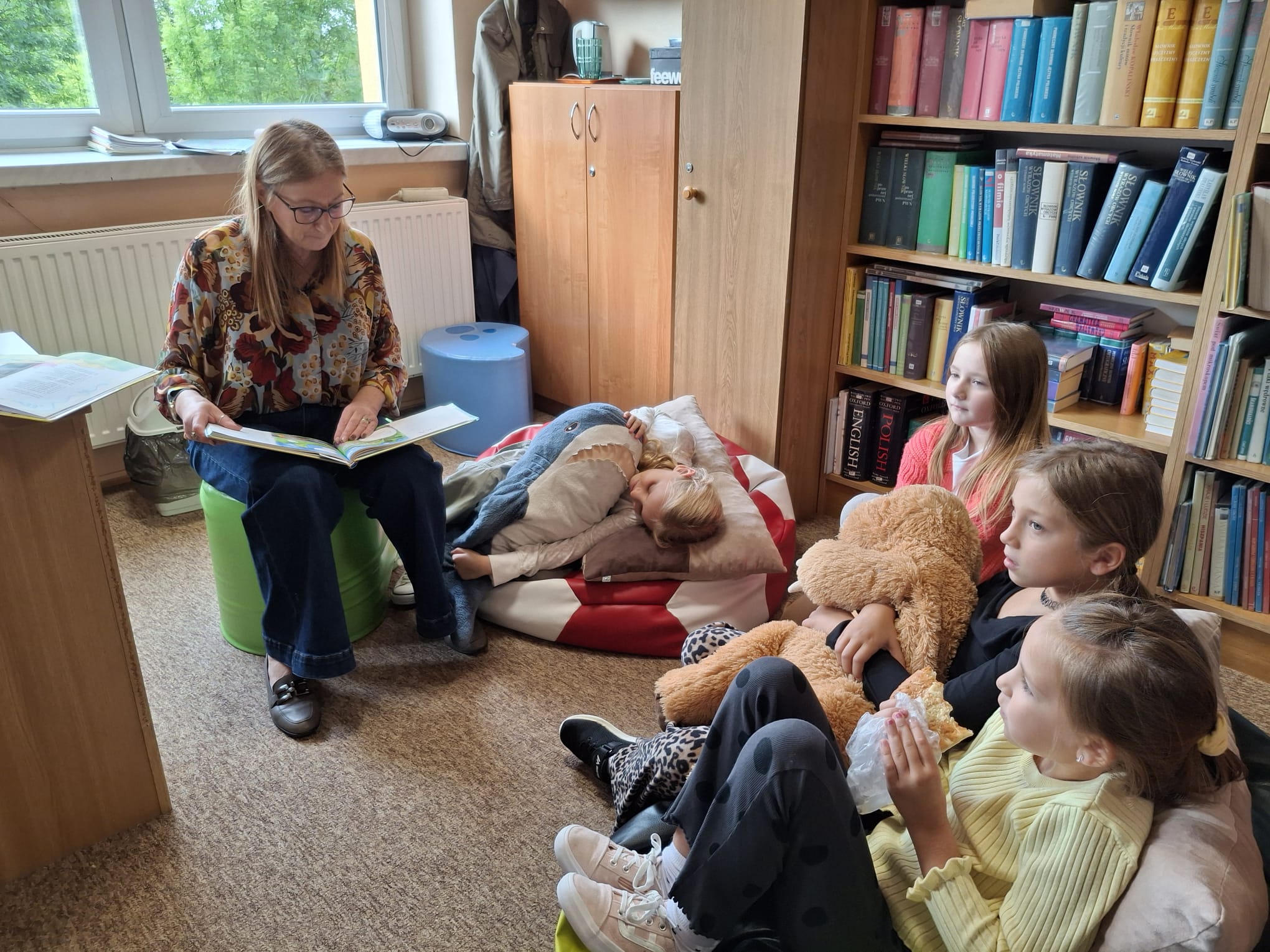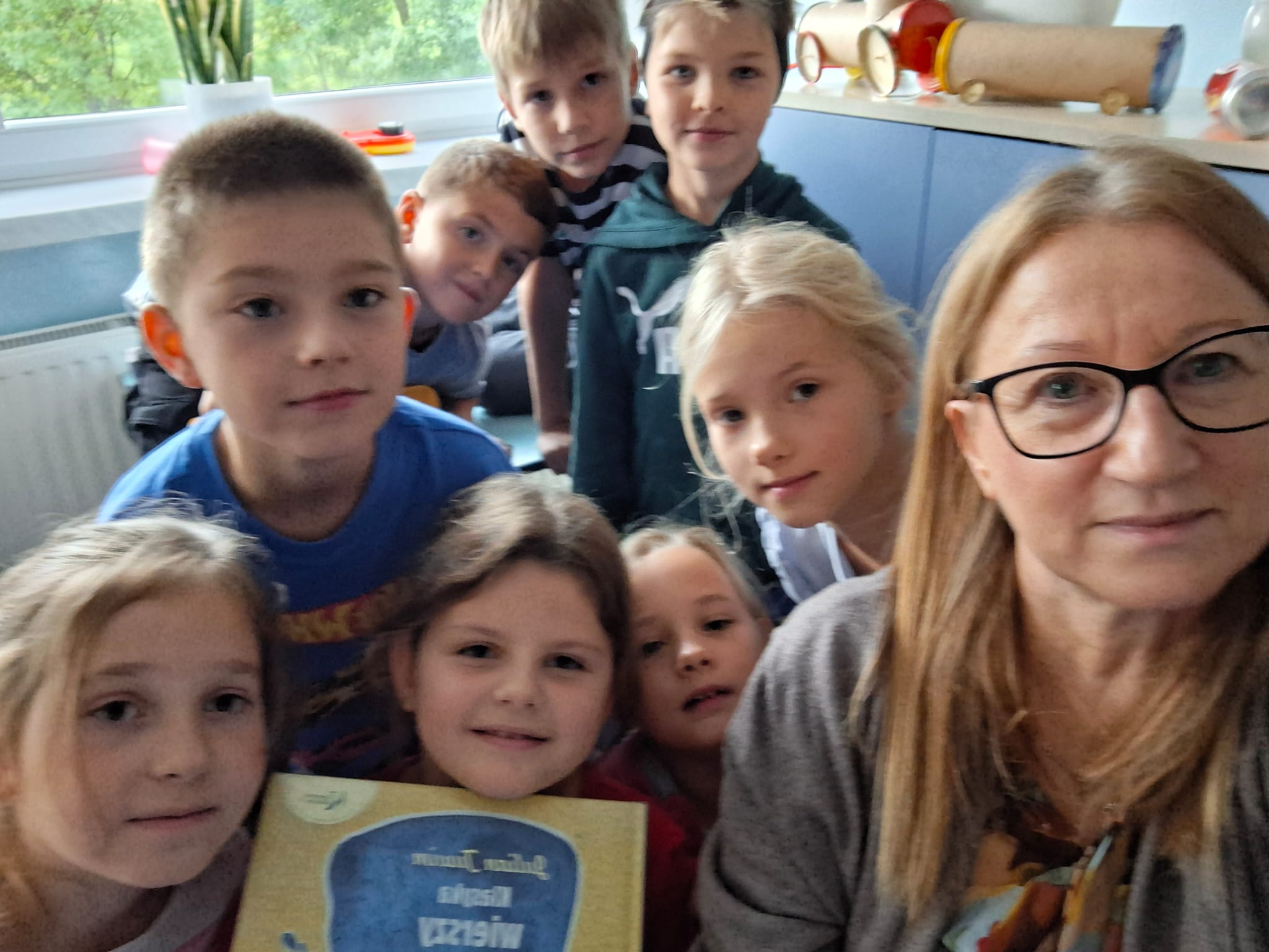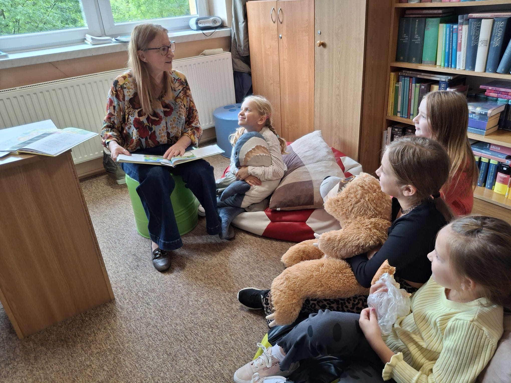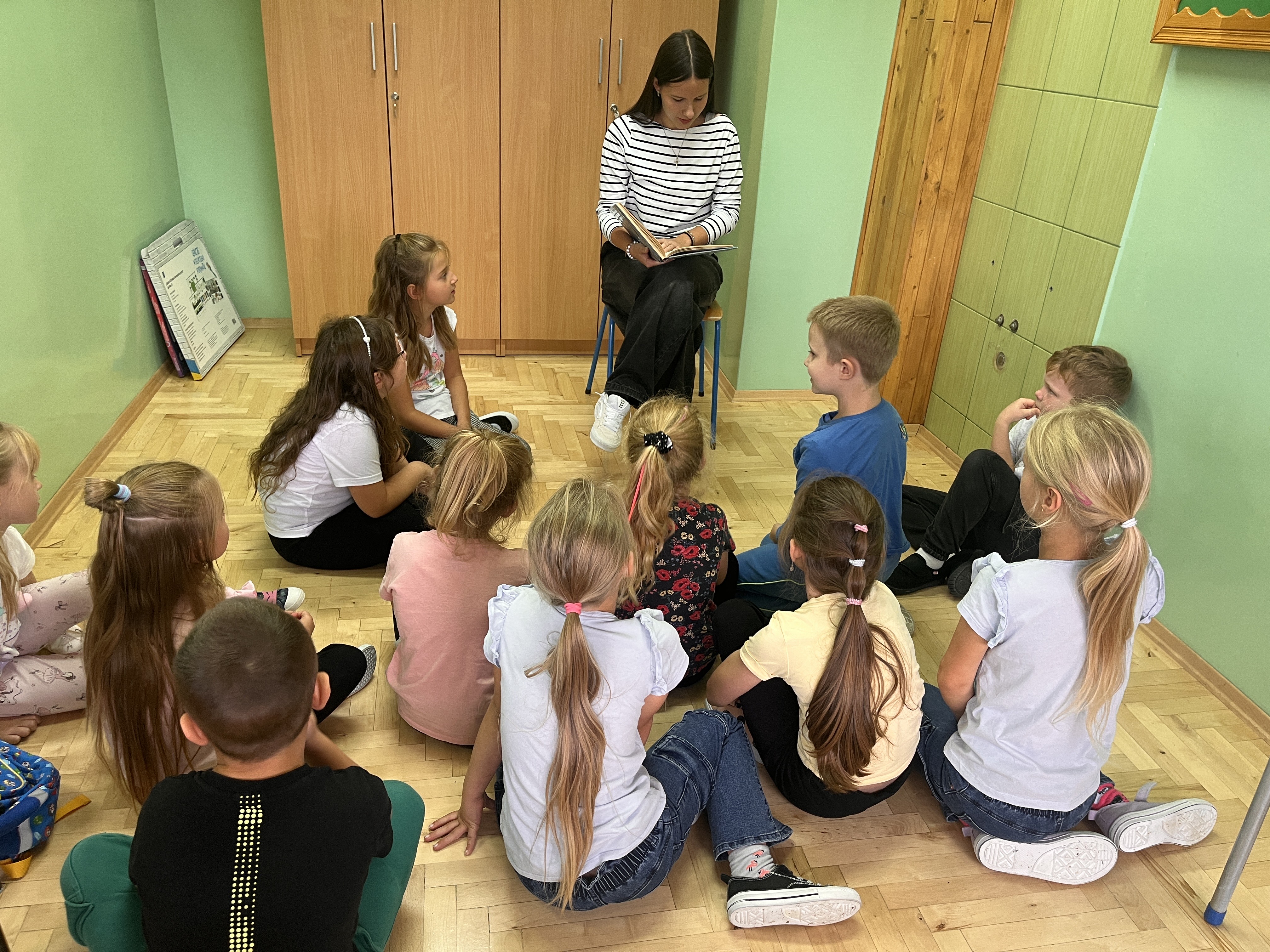 Najmłodsi uczniowie z radością wysłuchali wierszy Jana Brzechwy i Juliana Tuwima, a także fragmentów „Kubusia Puchatka” oraz opowieści o Kreciku, które od lat bawią i inspirują kolejne pokolenia czytelników. W bibliotece wiersze zostały przeczytane przez panią bibliotekarkę, co dodatkowo podkreśliło wyjątkowy charakter tego wydarzenia.