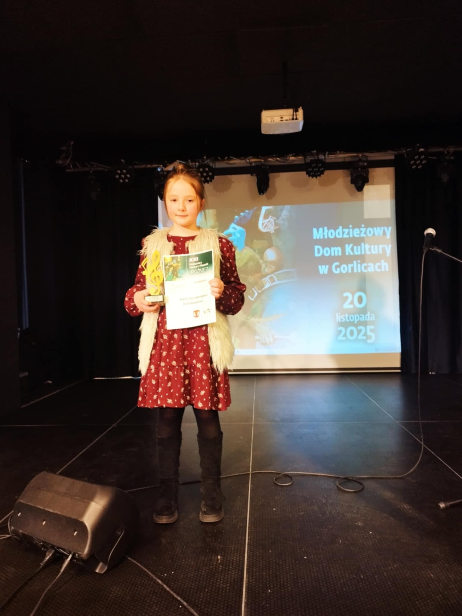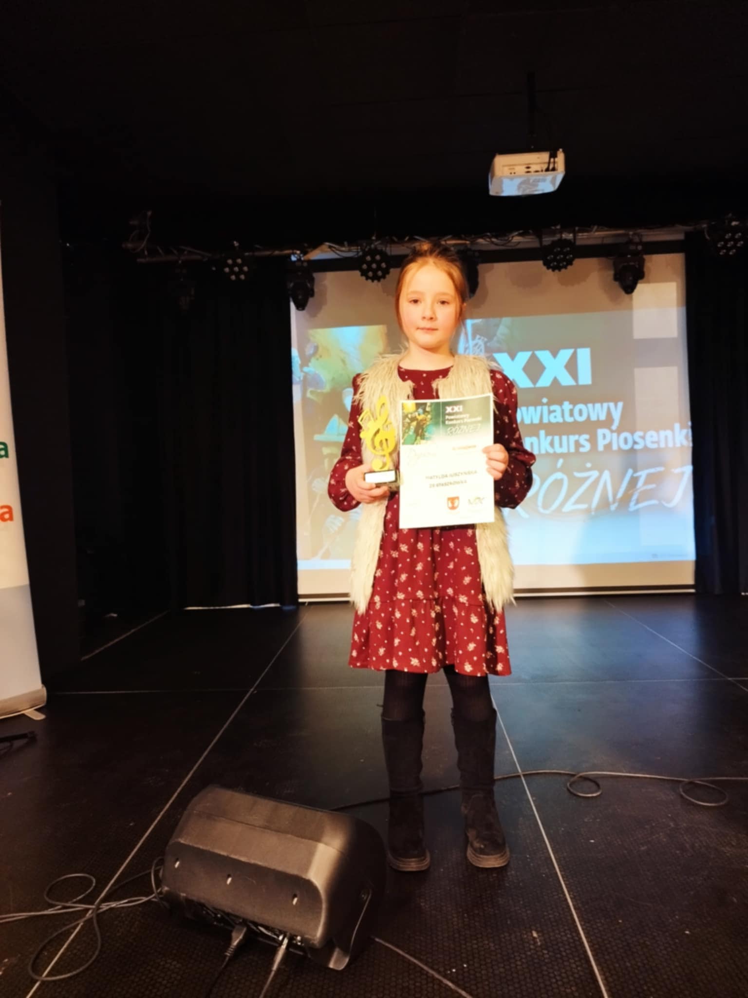 Uczennica naszej szkoły Matylda Juszyńska odniosła znaczący sukces artystyczny w tegorocznym konkursie, zdobywając 2. miejsce. Wydarzenie odbyło się 20 listopada w Mlodzieżowym Domu Kultury i zgromadziło wielu młodych wokalistów z całego powiatu, prezentujących szeroki repertuar muzyczny.