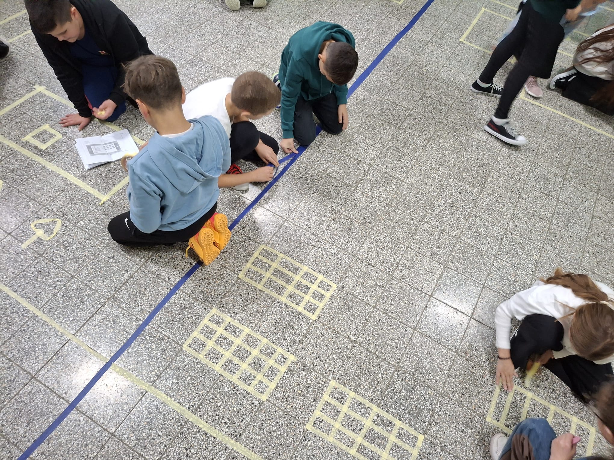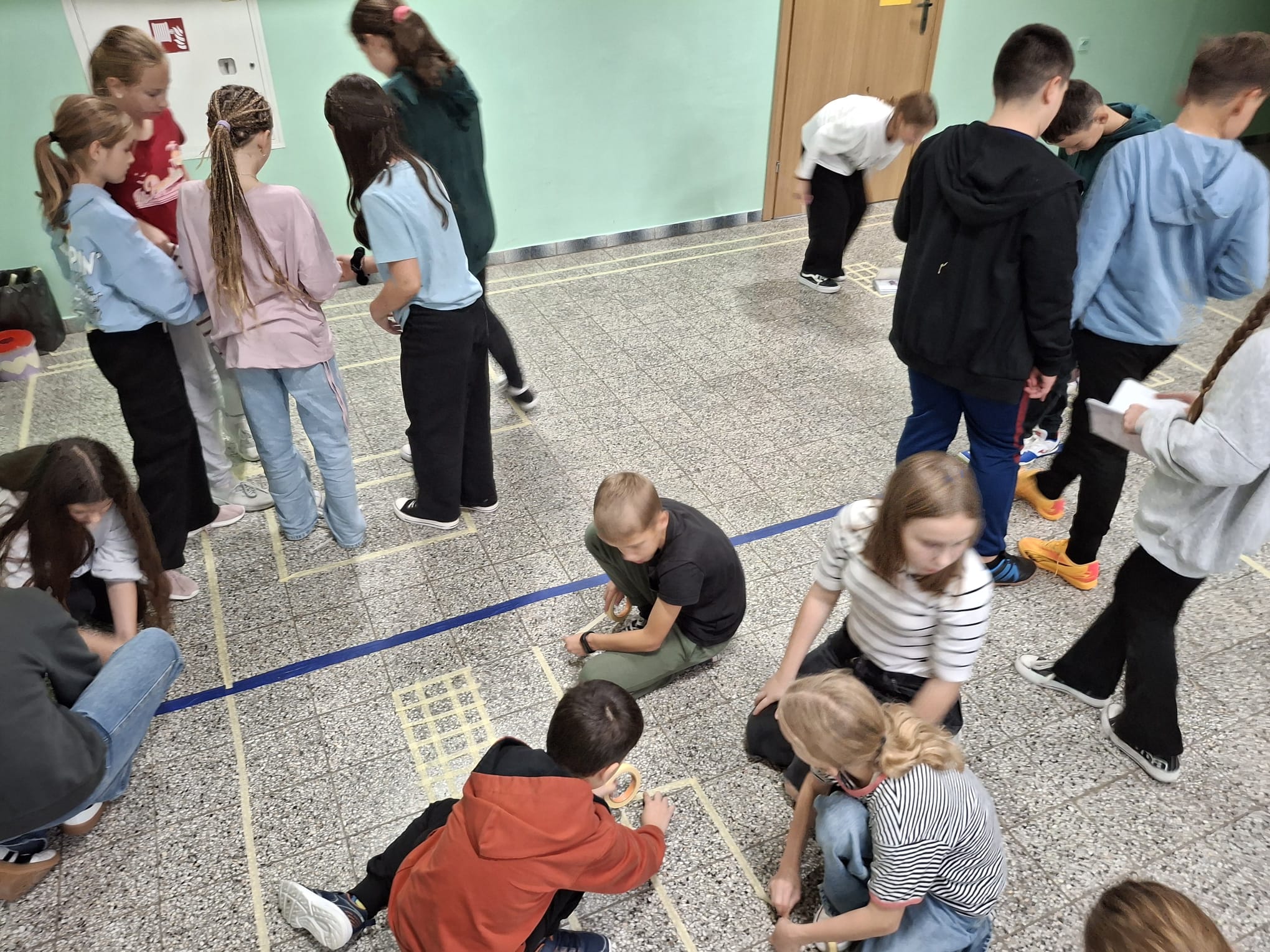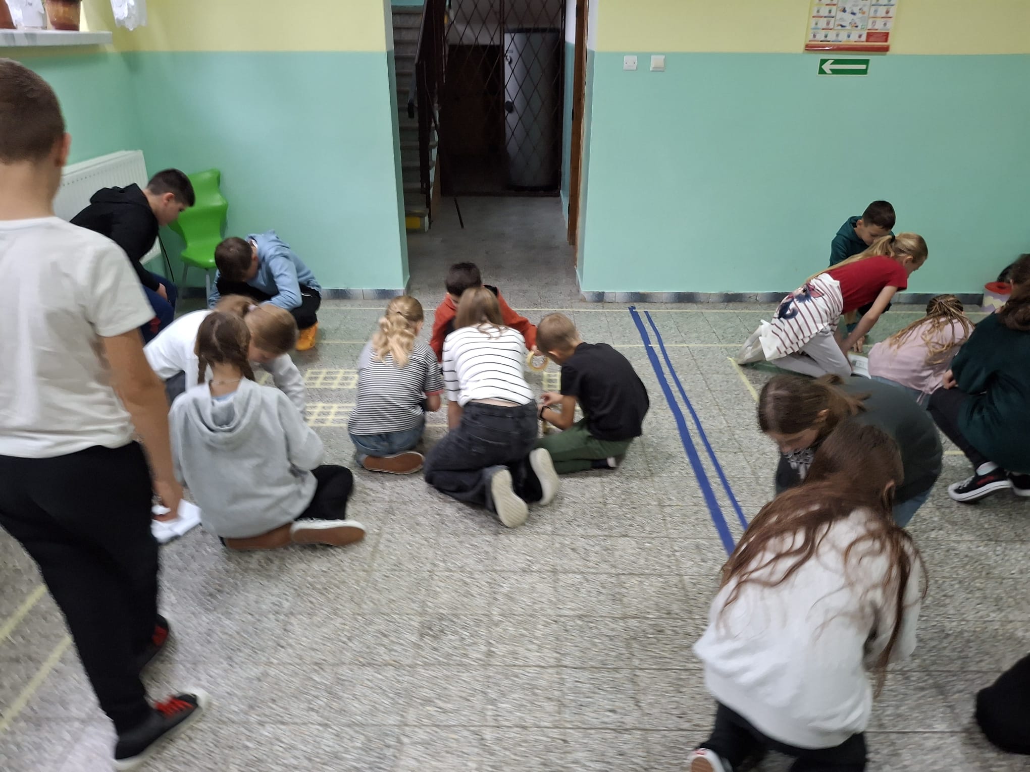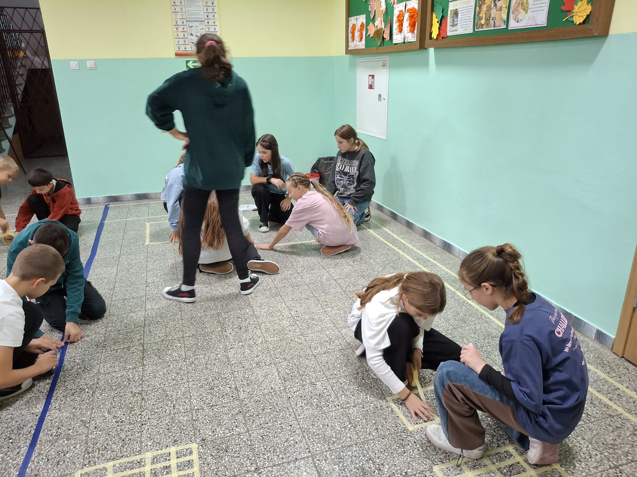 Po omówieniu wyników pracy uczniowie zostali podzieleni na dwie grupy. Każda z nich otrzymała to samo zadanie – stworzyć plan Placu Broni. Nie był to jednak zwykły rysunek w zeszycie, lecz plan odtworzony na szkolnym korytarzu! Z pomocą taśmy malarskiej uczniowie odwzorowali przestrzeń znaną z książki, wykazując się pomysłowością, współpracą i duchem zdrowej rywalizacji – kto szybciej i dokładniej stworzy literacki świat.
