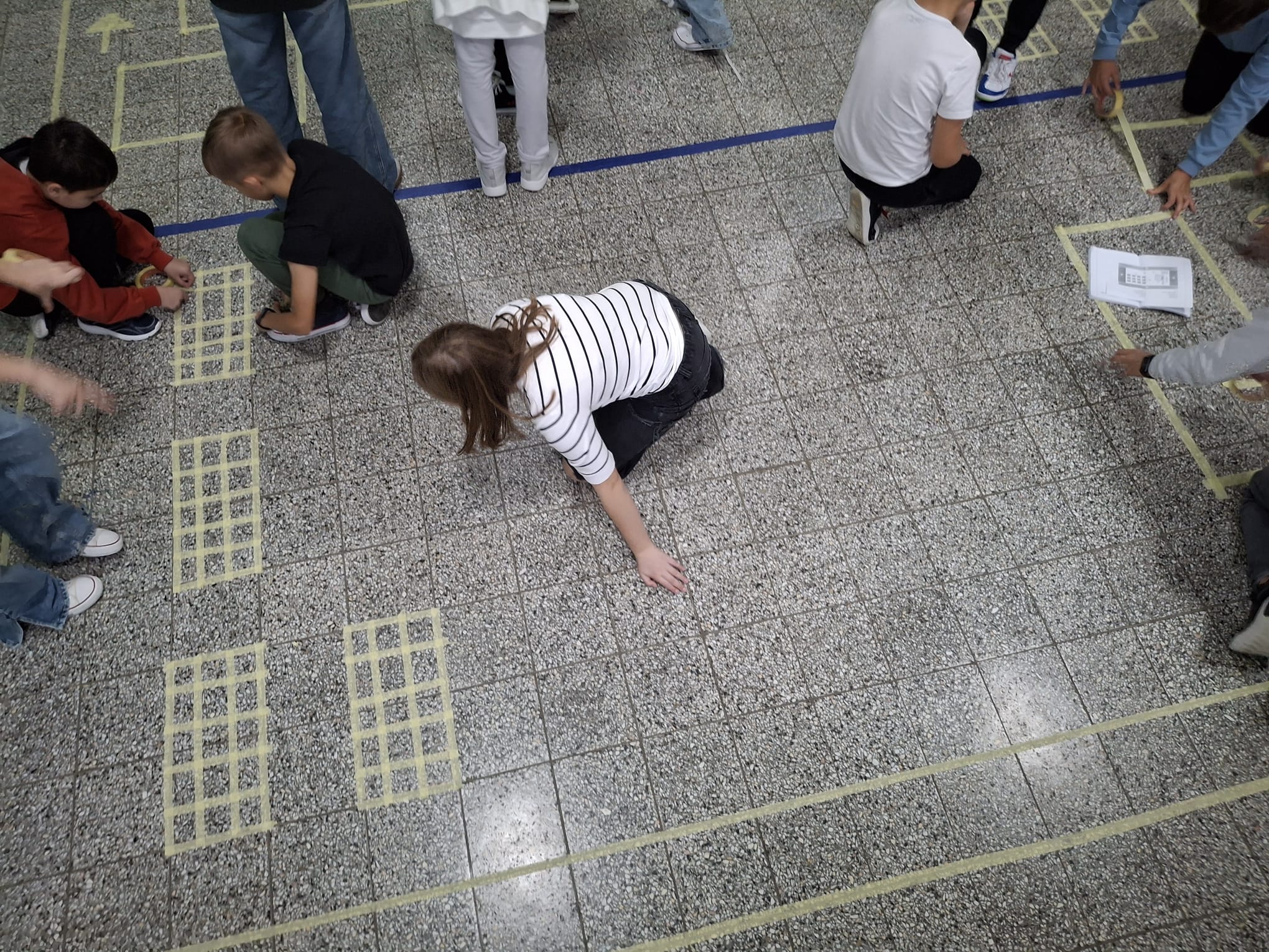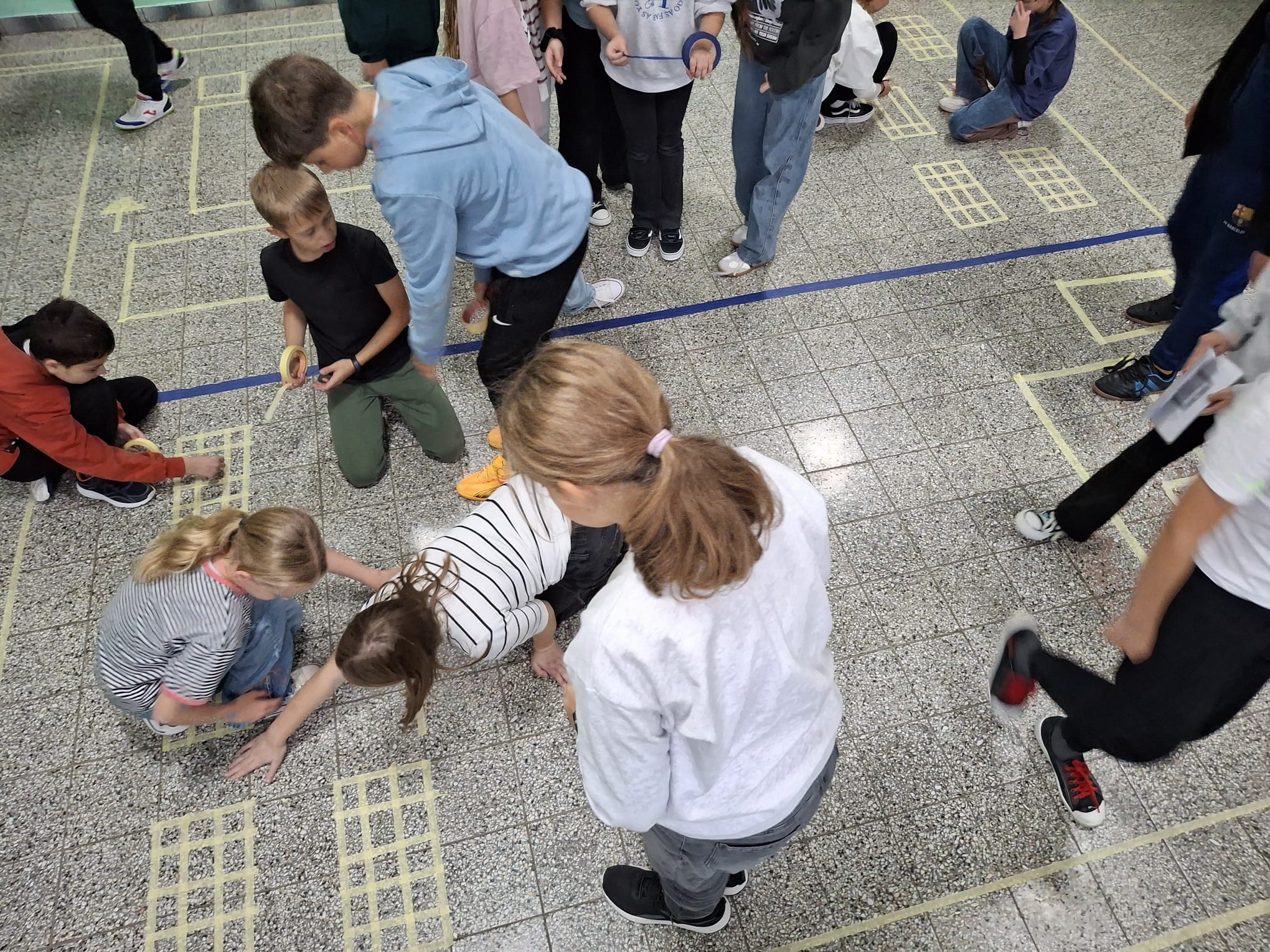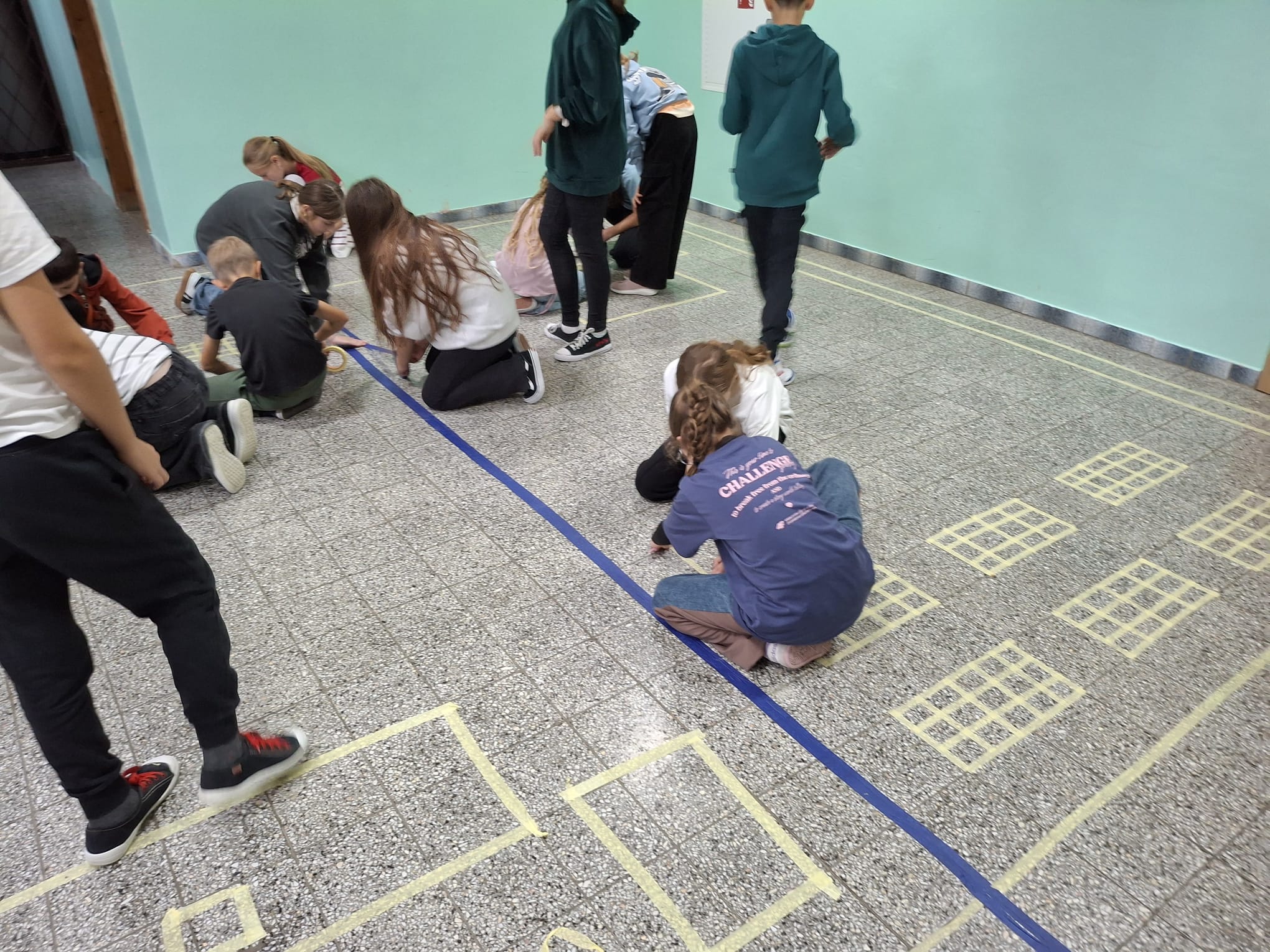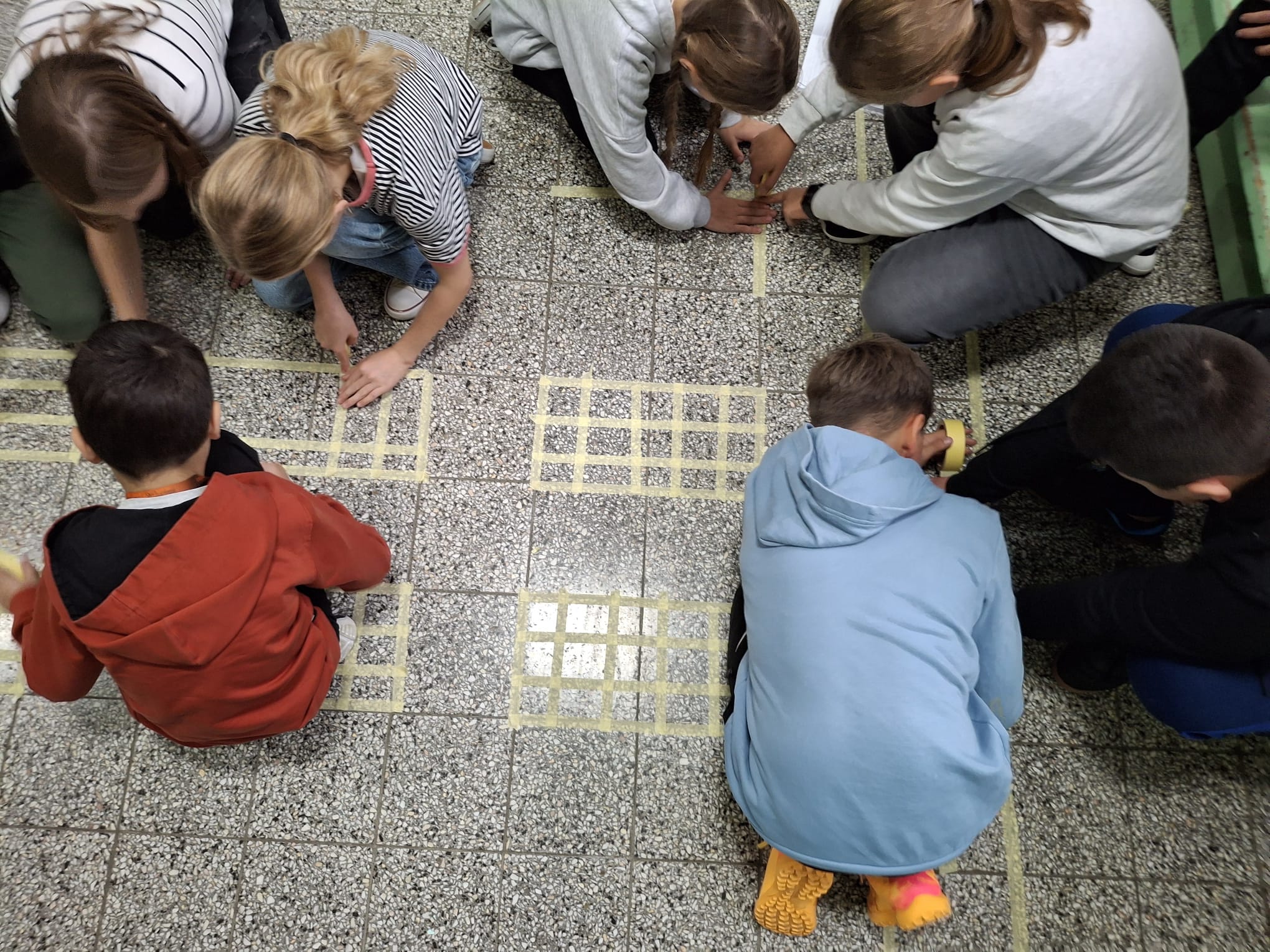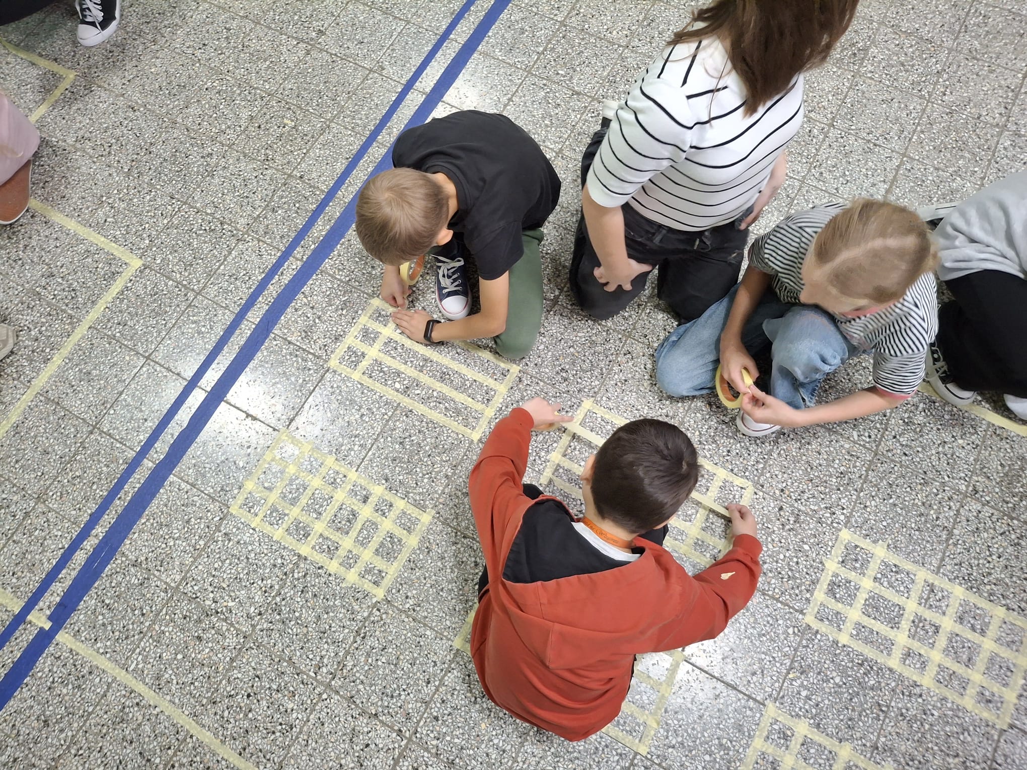 Po omówieniu wyników pracy uczniowie zostali podzieleni na dwie grupy. Każda z nich otrzymała to samo zadanie – stworzyć plan Placu Broni. Nie był to jednak zwykły rysunek w zeszycie, lecz plan odtworzony na szkolnym korytarzu! Z pomocą taśmy malarskiej uczniowie odwzorowali przestrzeń znaną z książki, wykazując się pomysłowością, współpracą i duchem zdrowej rywalizacji – kto szybciej i dokładniej stworzy literacki świat.