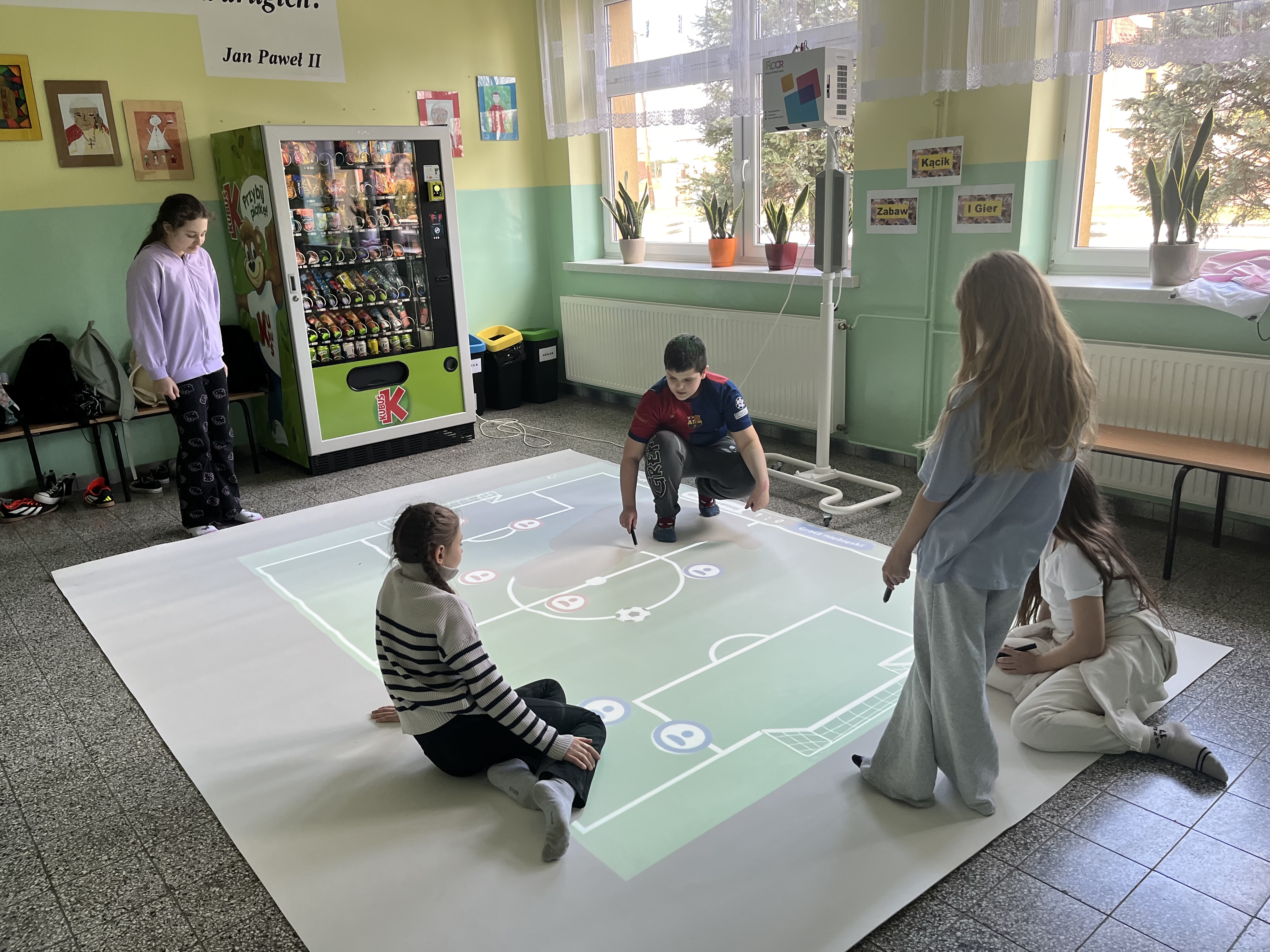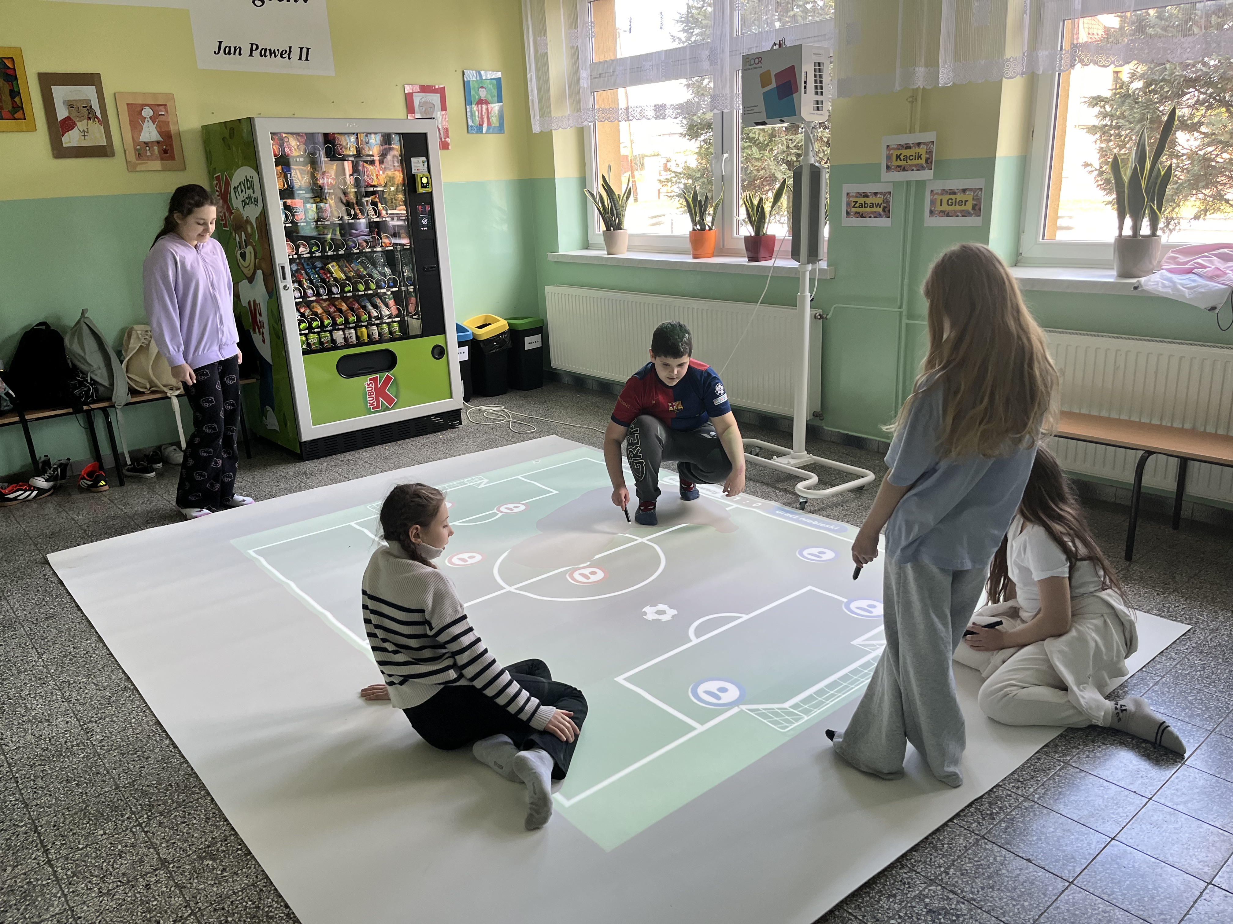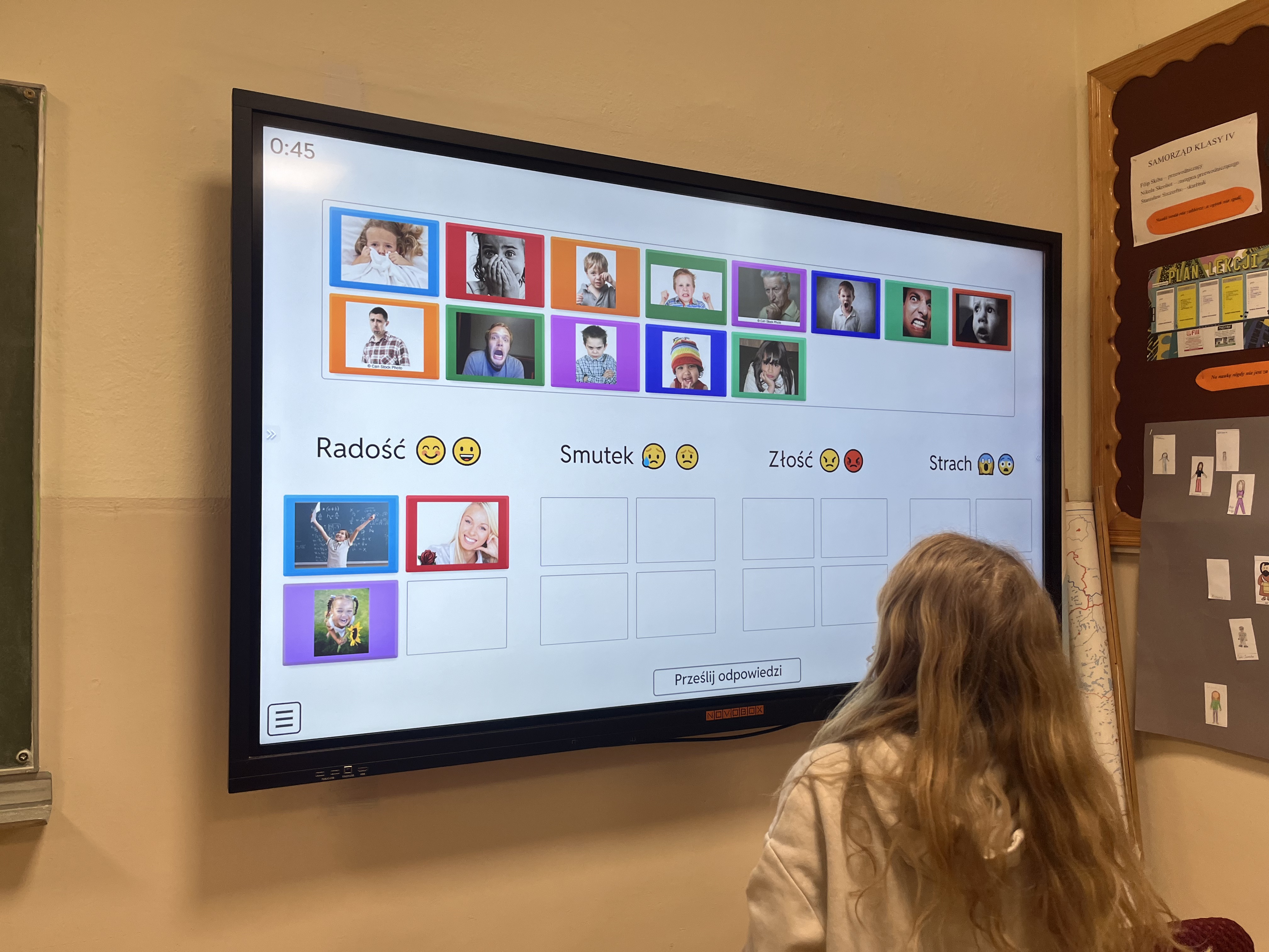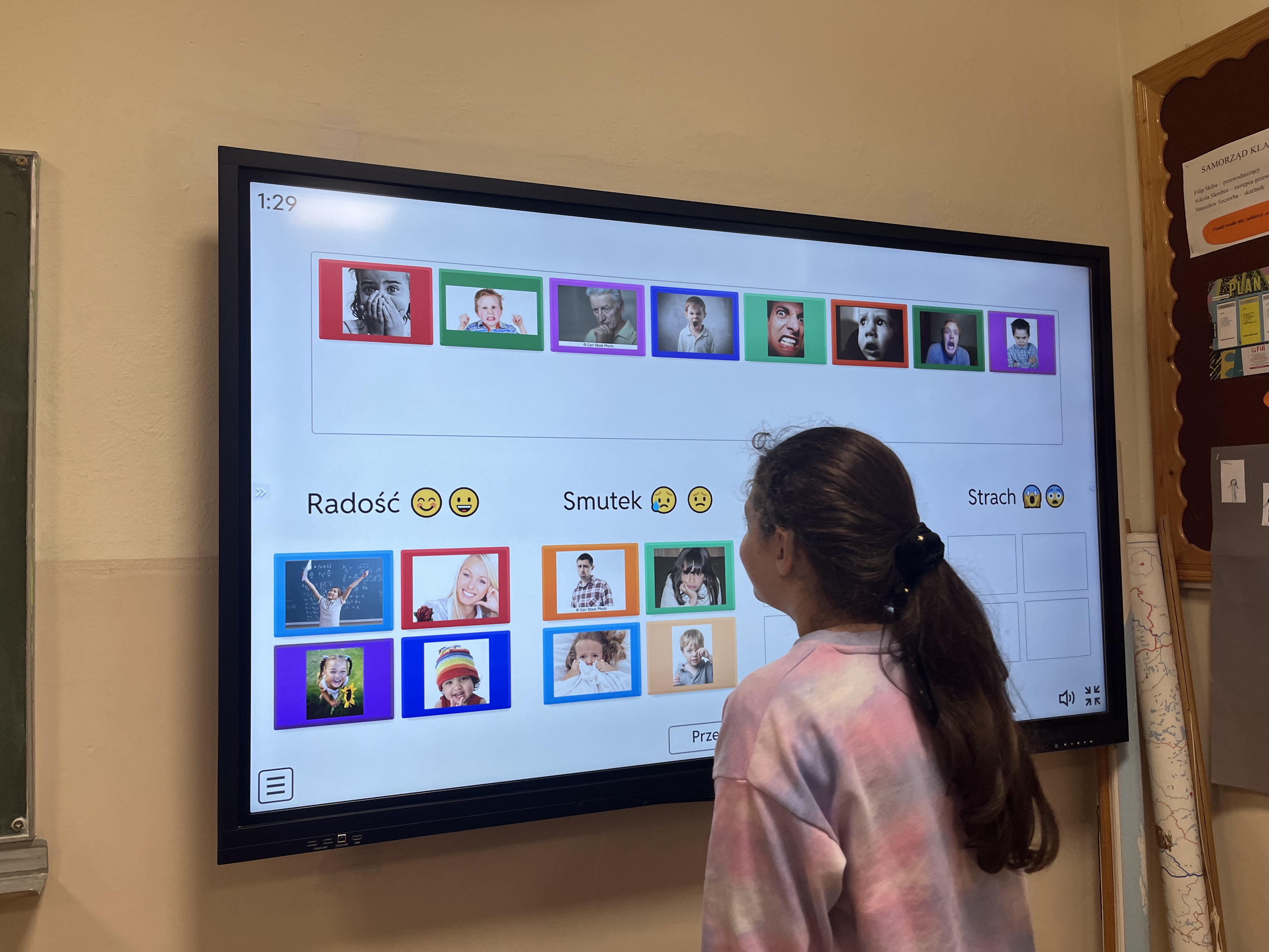 Dzieci korzystały także z nowoczesnych narzędzi – oprócz tablicy interaktywnej ogromnym zainteresowaniem cieszył się dywan interaktywny, który pozwolił im w ruchu i zabawie rozwijać uważność, współpracę i szybkie reagowanie na emocjonalne bodźce. Część zajęć odbyła się również na świeżym powietrzu – tam uczniowie nie tylko integrowali się, ale także nagrywali swój film poklatkowy, pokazując emocje w kreatywny, artystyczny sposób. Zajęcia nie tylko pozwoliły uczniom lepiej poznać i nazywać swoje emocje, ale również pokazały, jak ważna jest empatia, współpraca i szacunek wobec innych. Promowały także równość i świadomość, że każdy – niezależnie od płci – ma równe szanse rozwoju i wyboru swojej drogi życiowej.