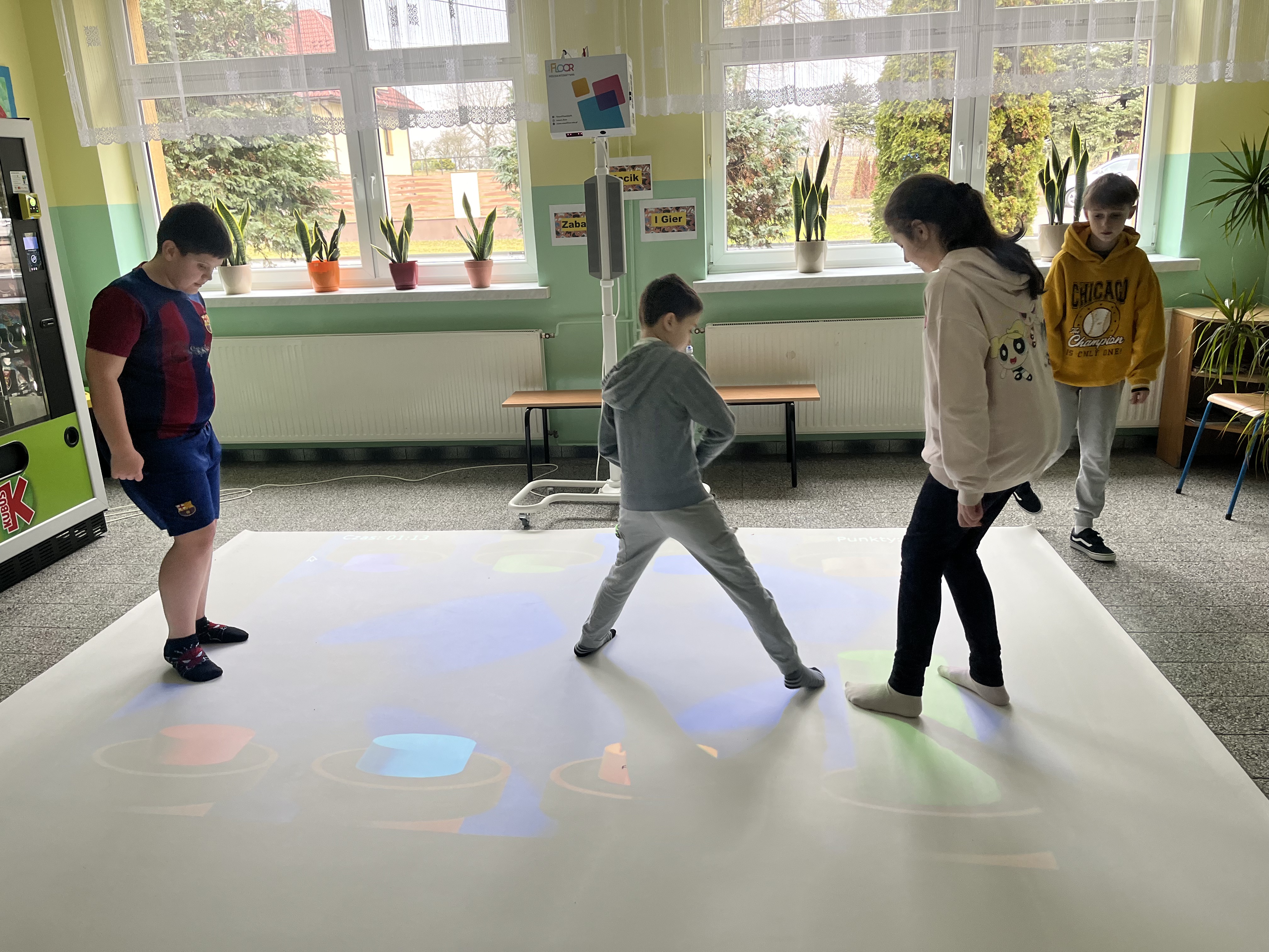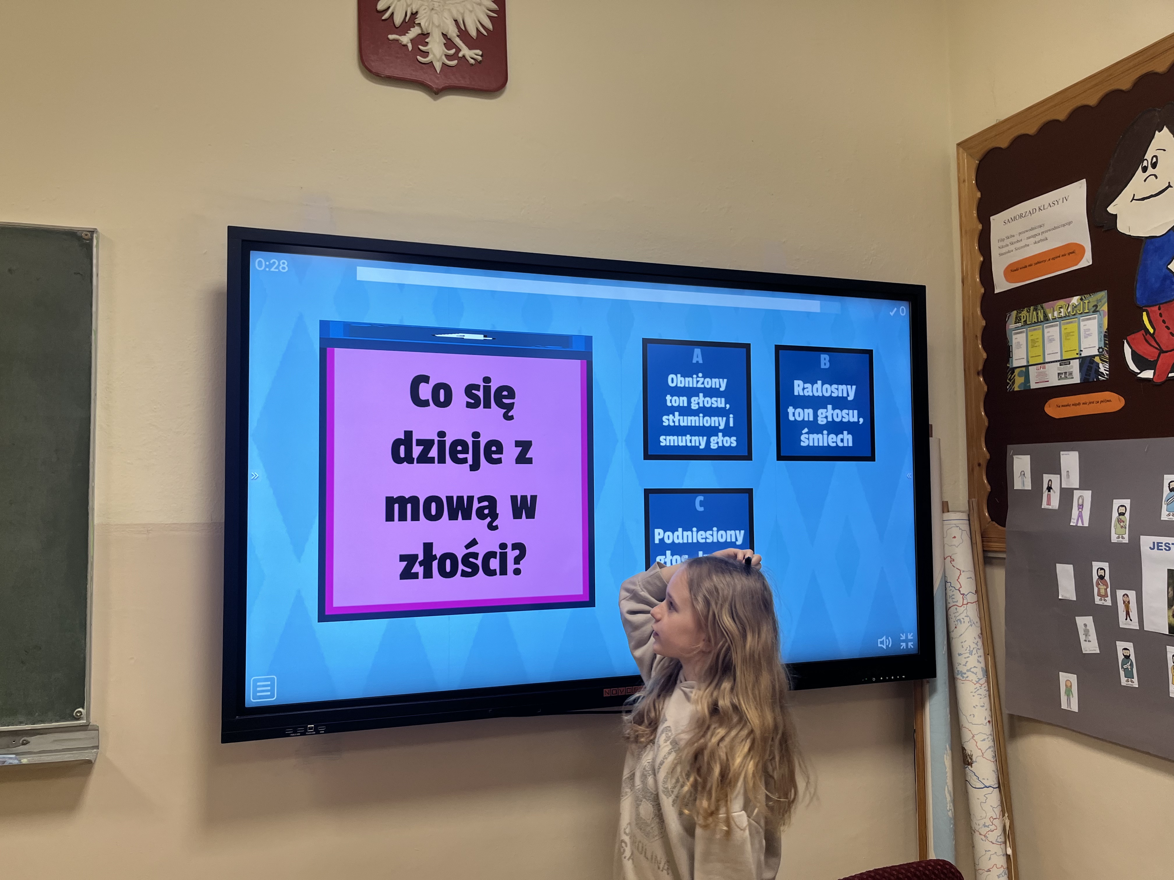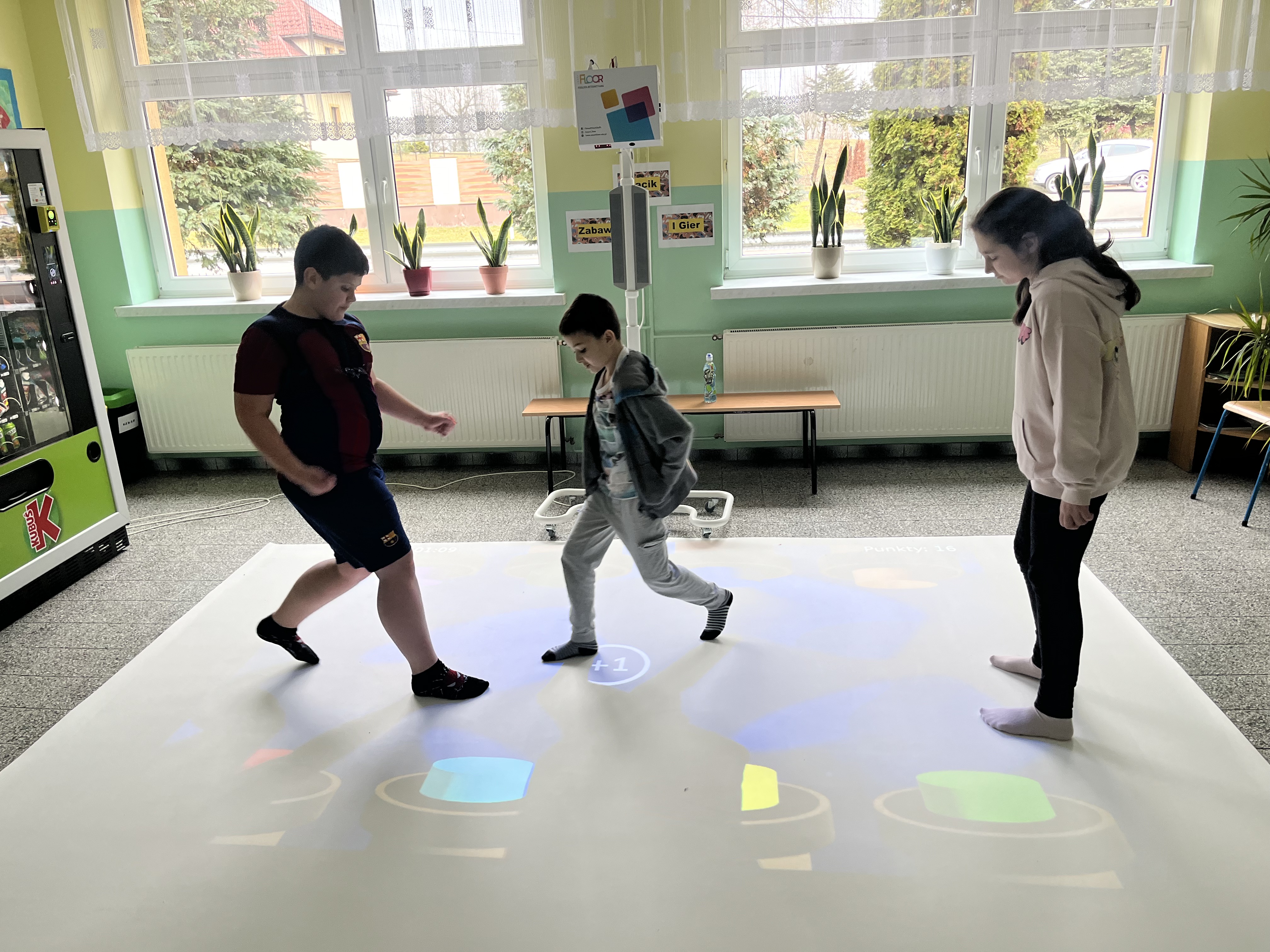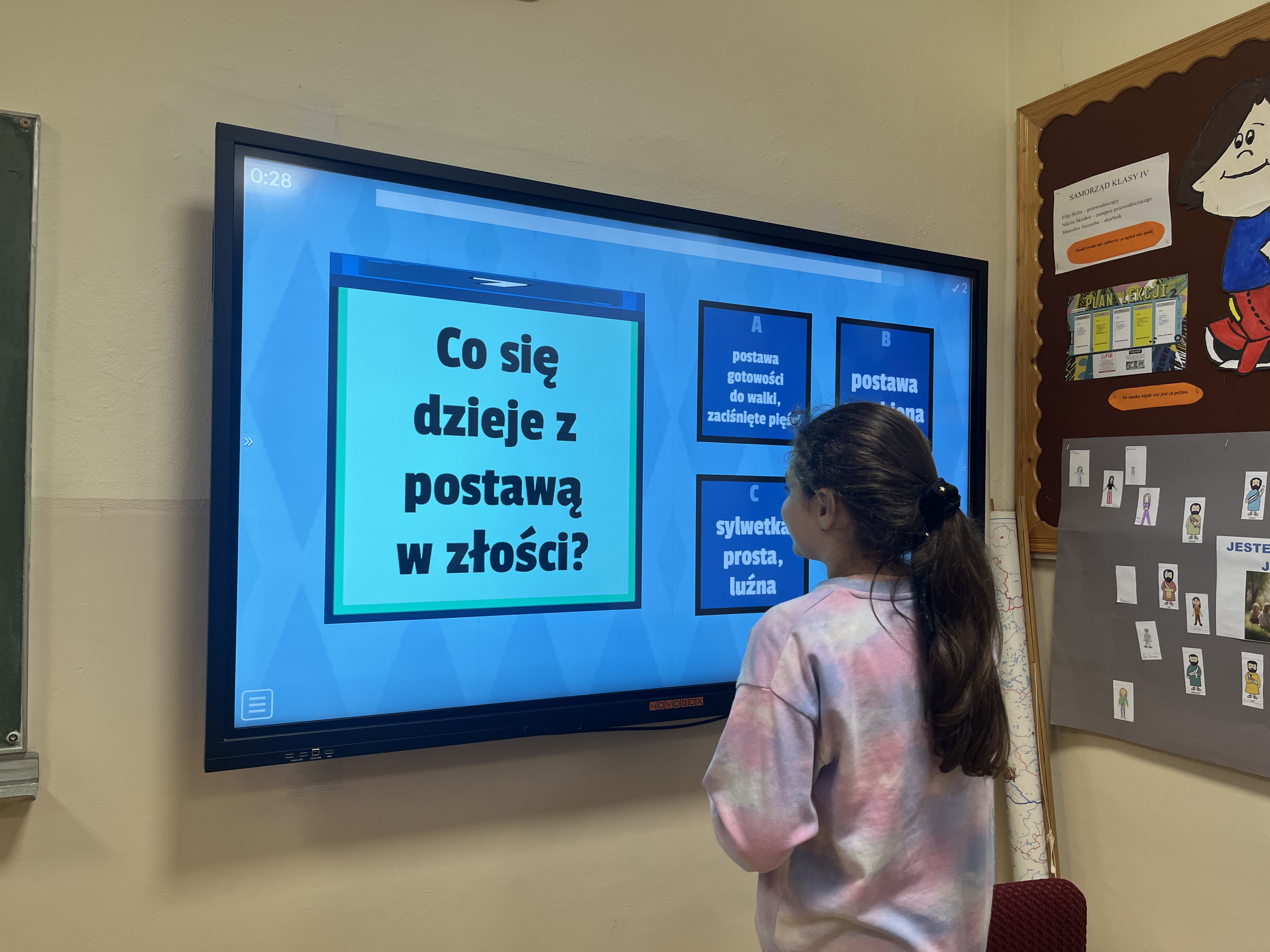 Dzieci korzystały także z nowoczesnych narzędzi – oprócz tablicy interaktywnej ogromnym zainteresowaniem cieszył się dywan interaktywny, który pozwolił im w ruchu i zabawie rozwijać uważność, współpracę i szybkie reagowanie na emocjonalne bodźce. Część zajęć odbyła się również na świeżym powietrzu – tam uczniowie nie tylko integrowali się, ale także nagrywali swój film poklatkowy, pokazując emocje w kreatywny, artystyczny sposób. Zajęcia nie tylko pozwoliły uczniom lepiej poznać i nazywać swoje emocje, ale również pokazały, jak ważna jest empatia, współpraca i szacunek wobec innych. Promowały także równość i świadomość, że każdy – niezależnie od płci – ma równe szanse rozwoju i wyboru swojej drogi życiowej.